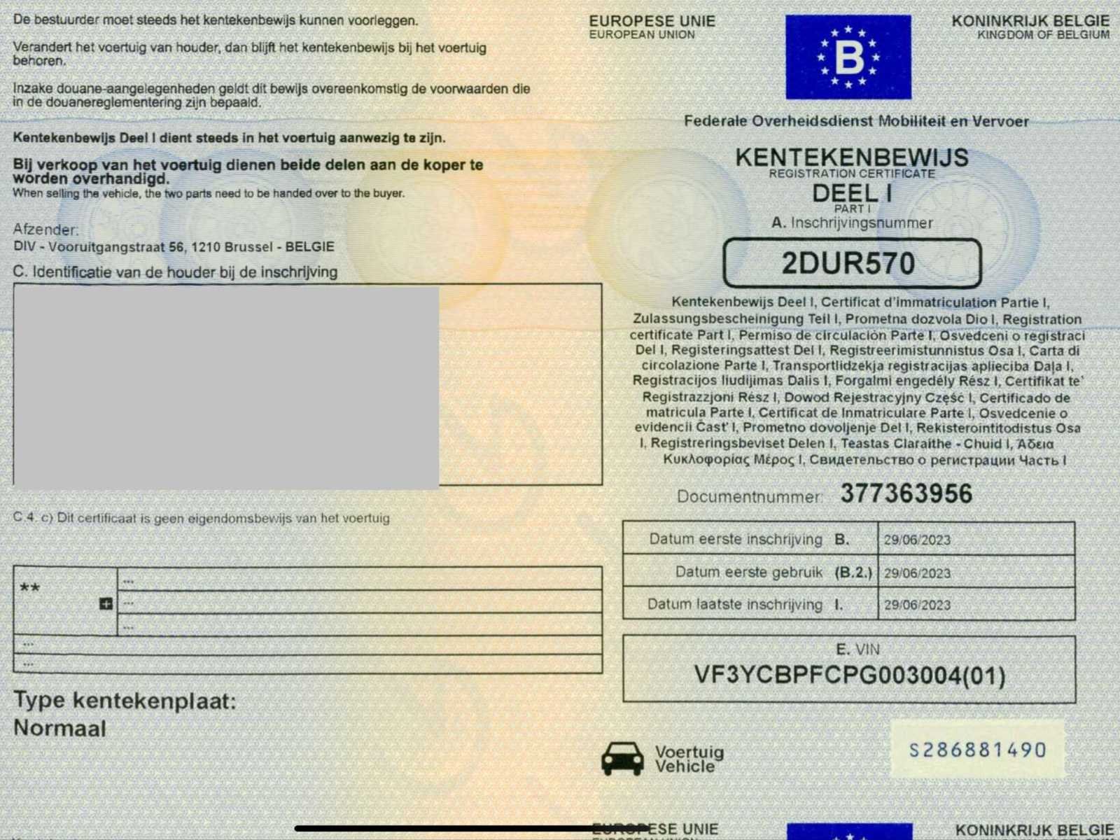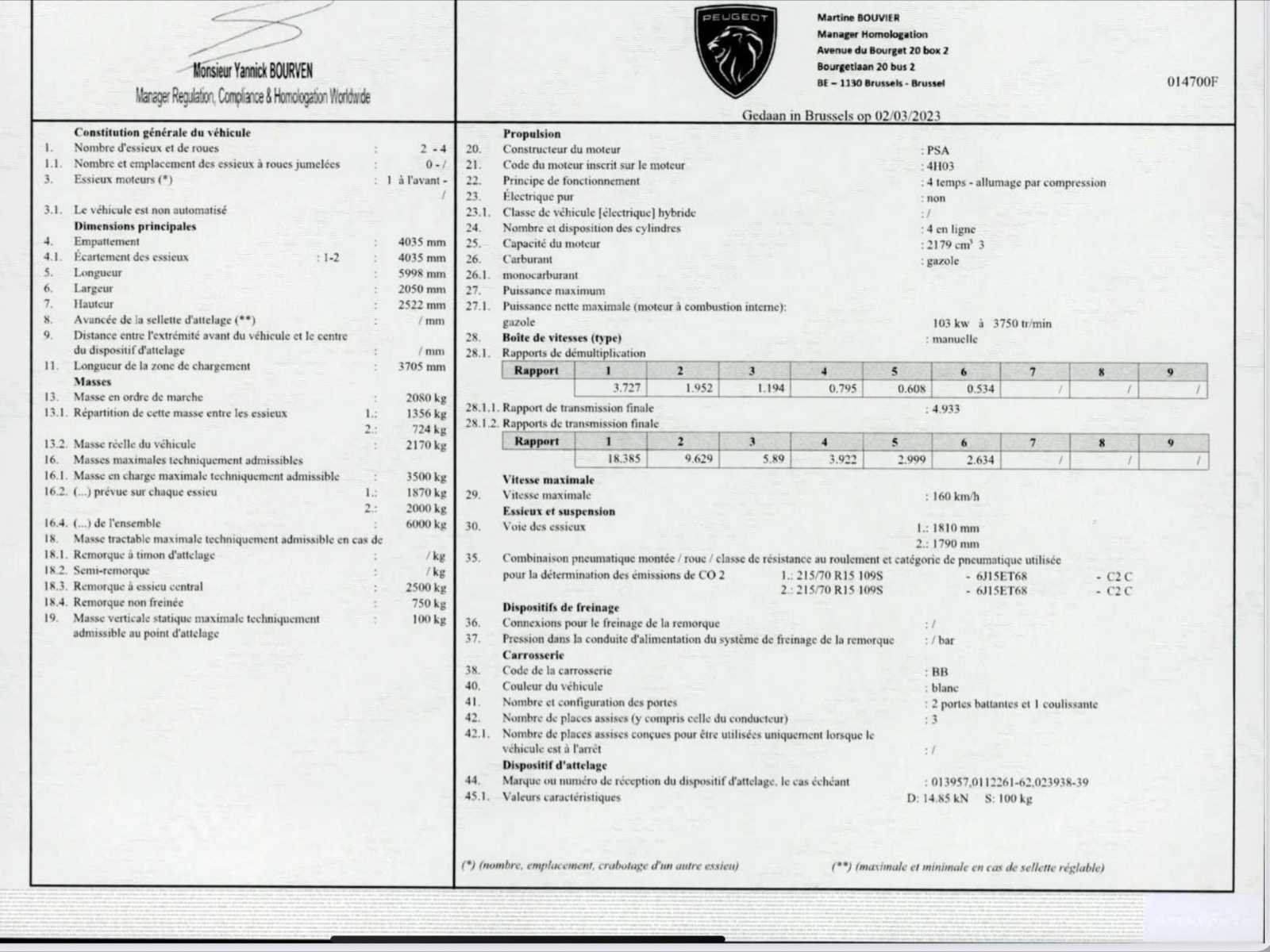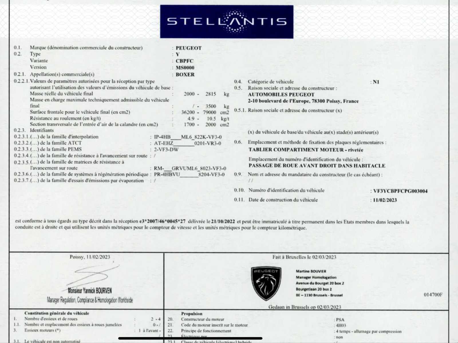 No Merk: Peugeot Model: boxer Type: lichte vracht - 29000km - 3 pers. - trekhaak Bouwjaar: 2023 Afgelezen kilometerstand: 28796km Cilinderinhoud: 2179cc Vermogen (kW): 103kW Brandstof: diesel Chassisnummer: VF3YCBPFCPG003004 Datum eerste toelating: 29/6/2023 Emissieklasse: Euro 6d Ledig gewicht: 2080kg Nationaliteit documenten: B Gelijkvormigheidsattest aanwezig: true Start en rijdt: ja Vavato voert geen technische keuring uit.: true Inschrijvingsbewijs - deel 1 : aanwezig Inschrijvingsbewijs - deel 2: aanwezig