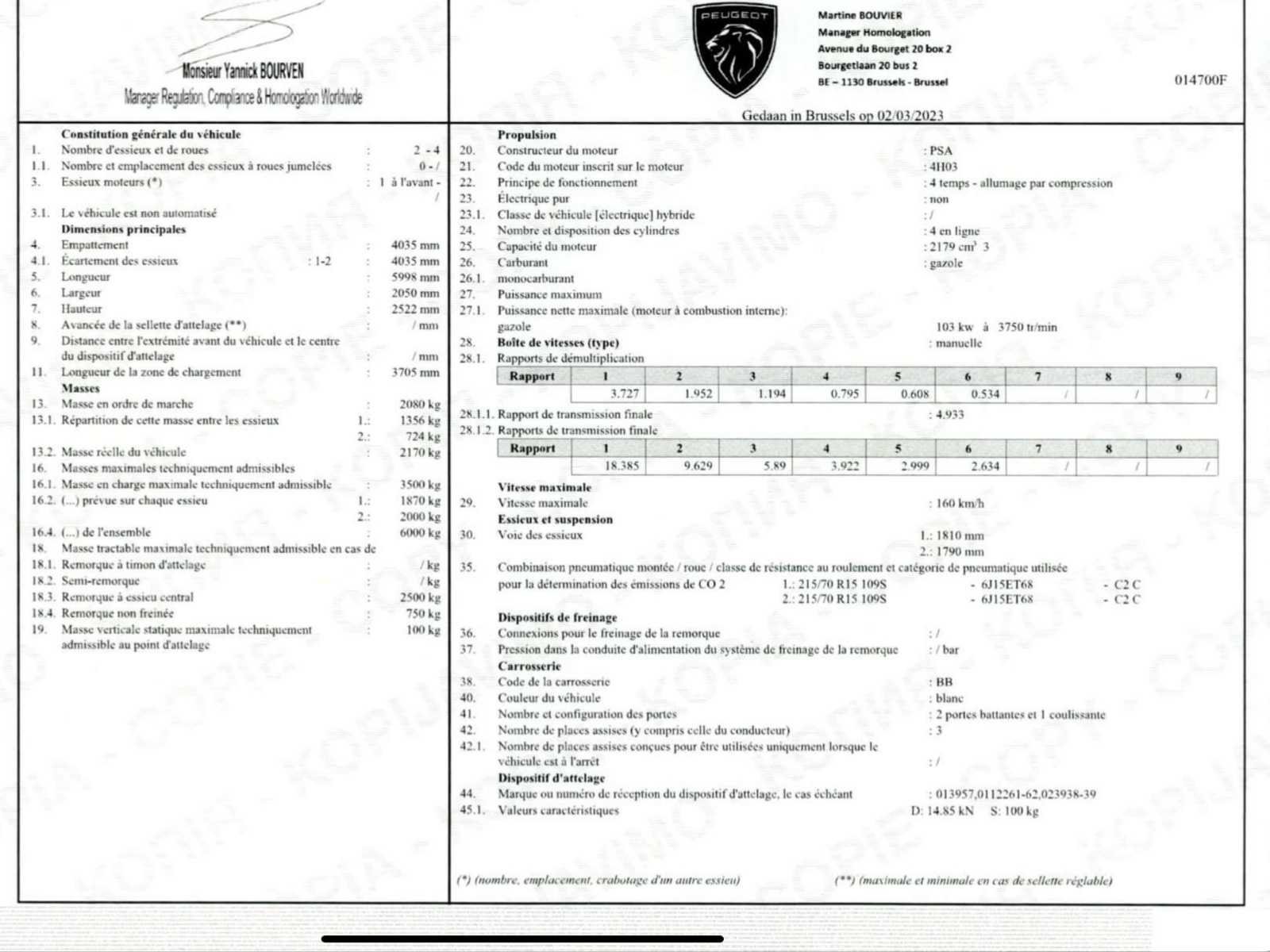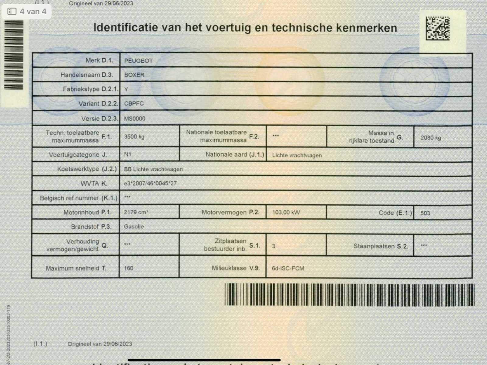 Heel weinig km, goed onderhouden, 6 versnellingen, airco, navigatie, parkeersensoren, achteruitrijcamera,… lichte gebruikssporen carrosserie (zie foto’s) maar algemeen mooie en nette staat No Merk: Peugeot Model: boxer Type: lichte vracht - 27000km - 3pers - trekhaak Bouwjaar: 2023 Afgelezen kilometerstand: 27228km Cilinderinhoud: 2179cc Vermogen (kW): 103kW Brandstof: diesel Chassisnummer: VF3YCBPFCPG002978 Datum eerste toelating: 29/6/2023 Kleur: wit Transmissie: handgeschakeld Emissieklasse: Euro 6d Aantal deuren: 5 Ledig gewicht: 2080kg Nationaliteit documenten: B Gelijkvormigheidsattest aanwezig: true Start en rijdt: ja Zichtbare schade: ja Vavato voert geen technische keuring uit.: true Airconditioning: true Navigatie: true Inschrijvingsbewijs - deel 1 : aanwezig Inschrijvingsbewijs - deel 2: aanwezig