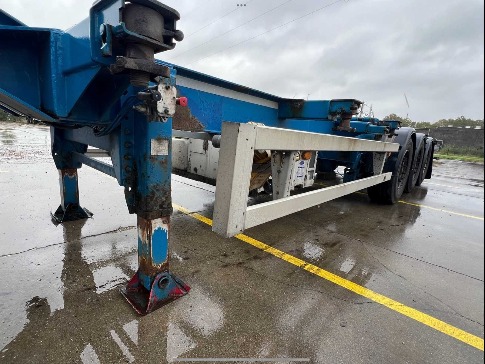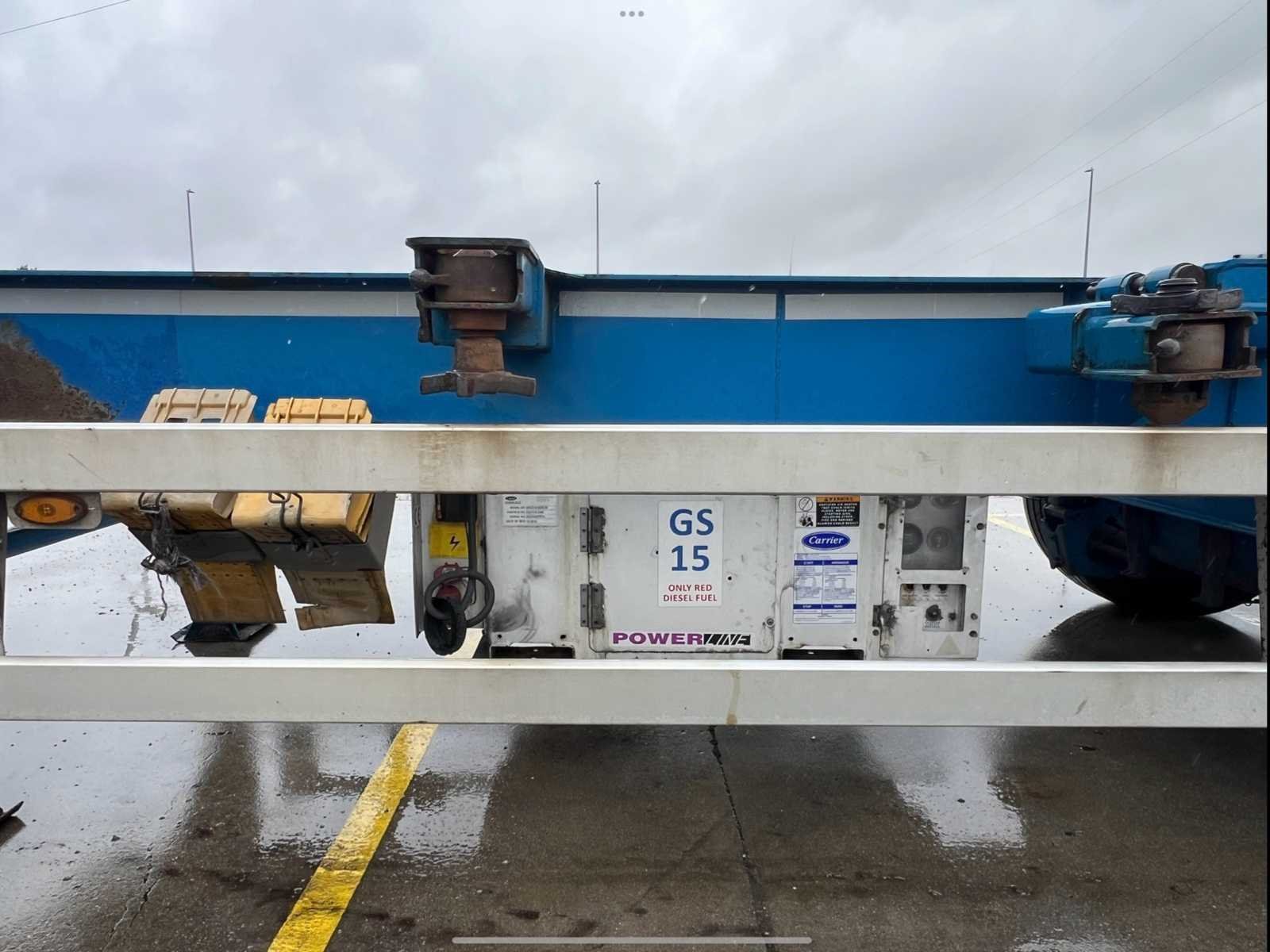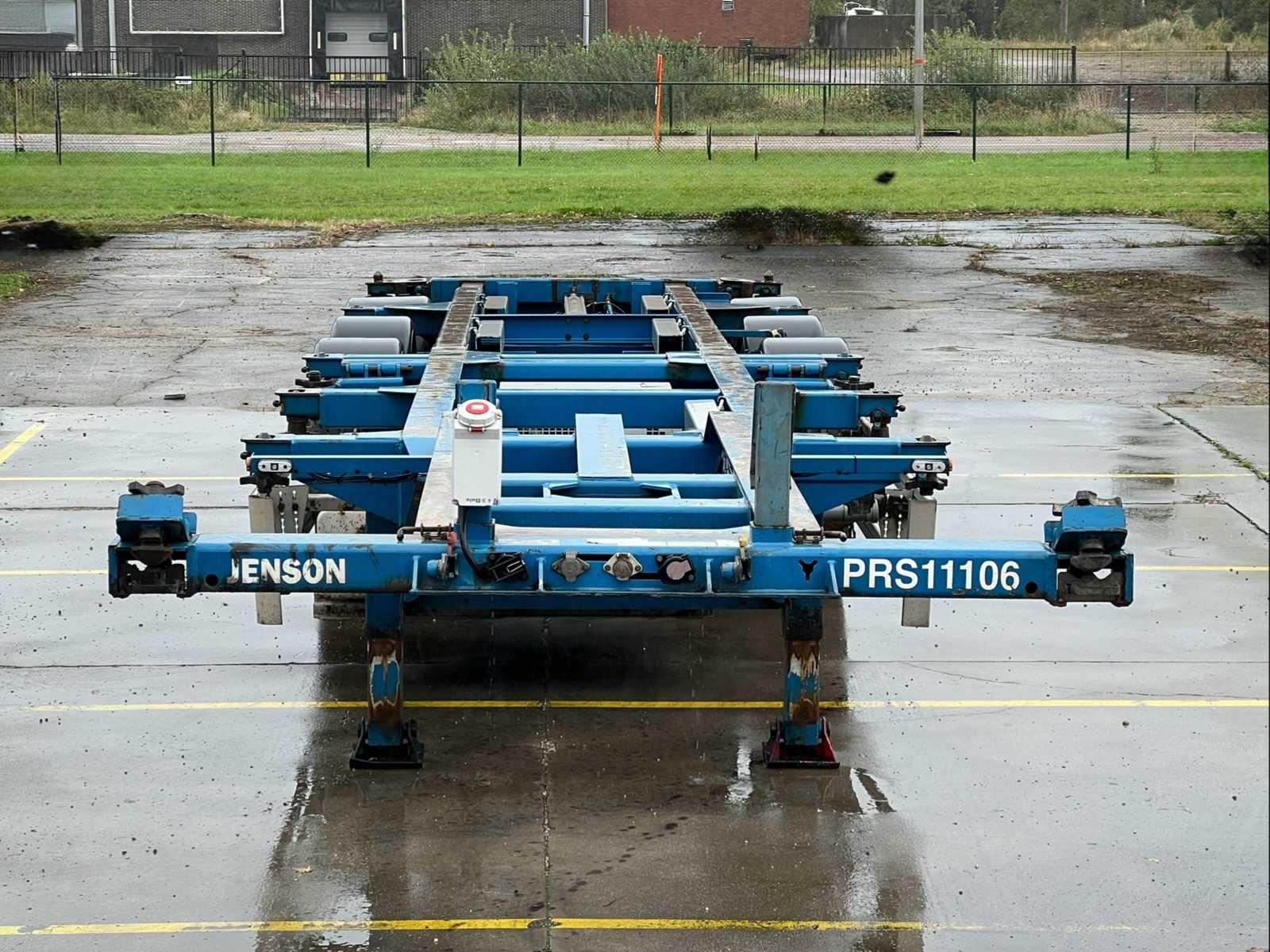 Degelijke Jenson containerchassis-aanhangwagen (type PRS11106), uitgevoerd met 3 assen, luchtvering en een geïntegreerde Carrier PowerMiza dieselgenerator voor koelcontainers. De oplegger is ontworpen voor het vervoer van 20ft, 30ft en 40ft containers en is voorzien van verstelbare twistlocks en schuifbaar chassisgedeelte. Het chassis verkeert in functionele, gebruikte staat met zichtbare roestvorming op frame en steunpoten. Technisch oogt het geheel compleet en geschikt voor onmiddellijk gebruik. Categorie: 3-assige containerchassis oplegger Asconfiguratie: 3 assen, luchtgeveerd Banden: Continental / Dunlop 385/65 R22.5 Remmen: Luchtremmen, WABCO-systeem Chassis: Staal, blauw gelakt Verlengbaar chassis: Ja, uitschuifbaar voor 40ft container Twistlocks: Meervoudig verstelbaar, manueel bedienbaar Opbouw: Open containerframe Vering: Luchtvering Achteras: Hendrickson lift-as systeem (Haldex bediening zichtbaar) Kingpin hoogte: ca. 1.150 mm Leeggewicht: ca. 7.300 kg (geschat) Steunpoten: 2-traps mechanisch verstelbaar, Jost type Uitrusting en voorzieningen: Carrier PowerMiza koelmotor met brandstoftank (“GS15 – Only Red Diesel Fuel”) Verlichting: LED zijmarkering en achterlichten Aansluitingen: Lucht: Dubbel nippelsysteem (rood/blauw) Elektrisch: 2 x 7-polige stekkers Reflectie en kentekenplaathouders aanwezig Nummer op chassis: PRS11106 Staat en opmerkingen: Zichtbare oppervlakkige roestvorming op frame, twistlocks en steunpoten Verfslijtage op diverse plaatsen Banden in redelijke tot goede staat, geen grote beschadigingen zichtbaar Chassis recht, geen zichtbare vervorming of scheuren Koelunit niet getest, fysiek aanwezig (PowerMiza / Carrier) Verlichting visueel aanwezig, niet functioneel getest Extra informatie: Geschikt voor multicontainergebruik (20/30/40ft) Hydraulische / pneumatische functies via Haldex regelunit Chassis kan door verkoper geladen worden op transportmiddel No Merk: Renders Type: polyvalent containerchassis Bouwjaar: 2013 Chassisnummer VIN: PRS11106