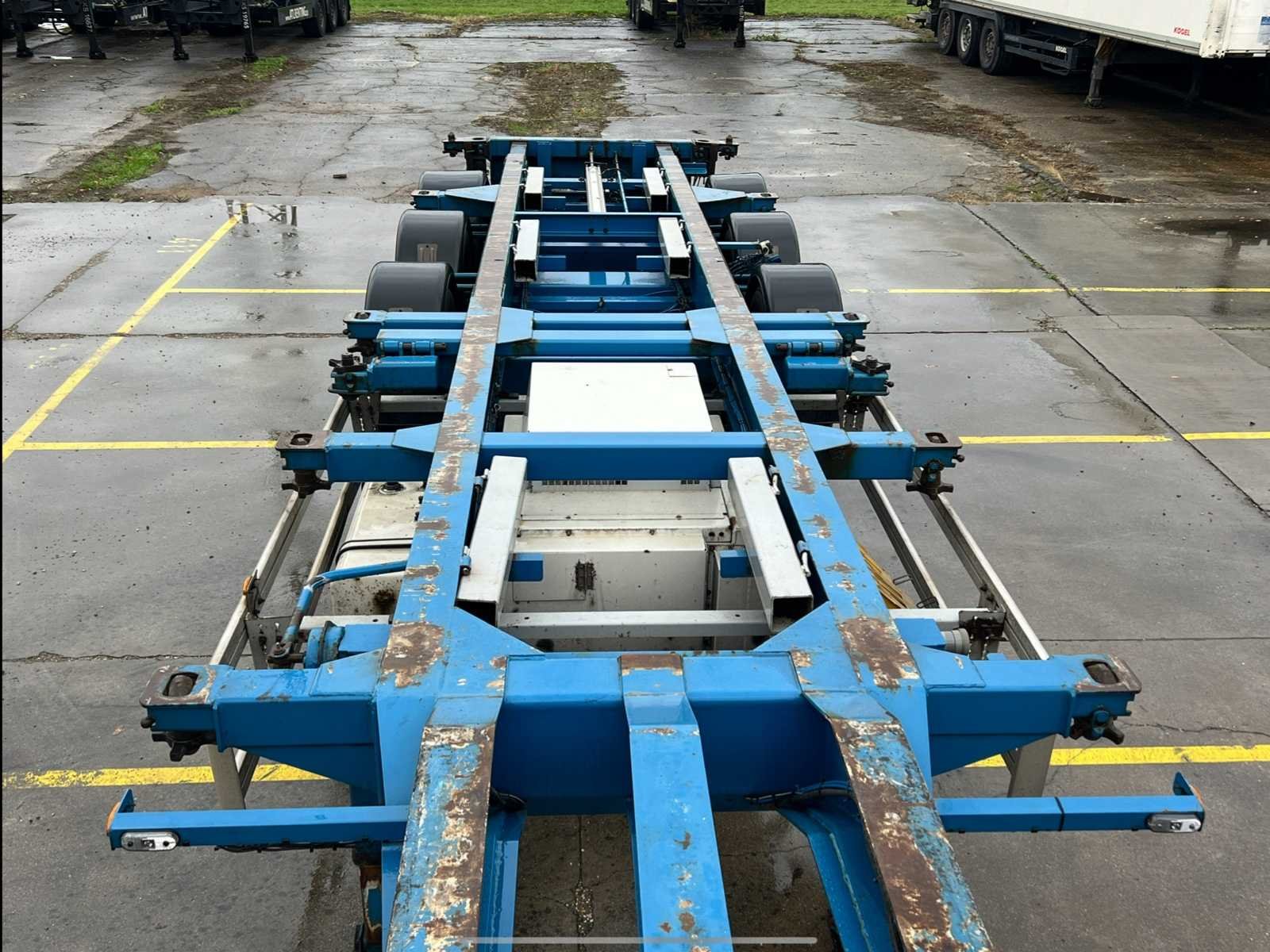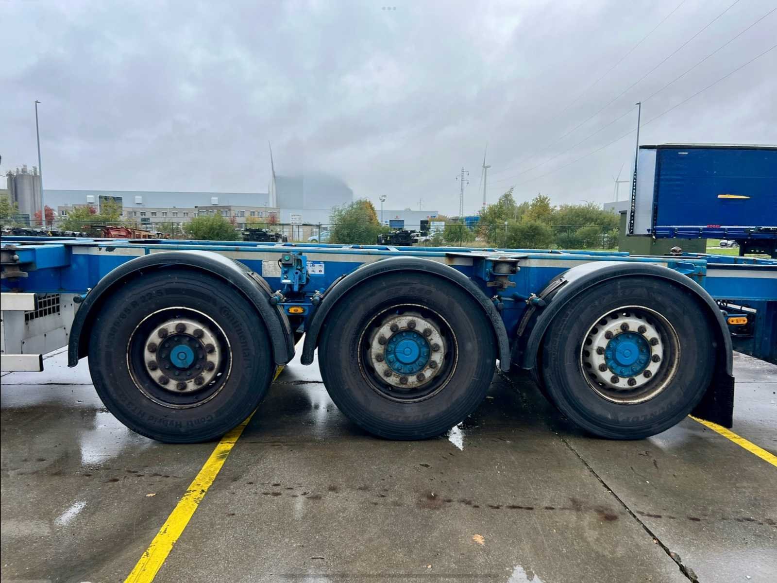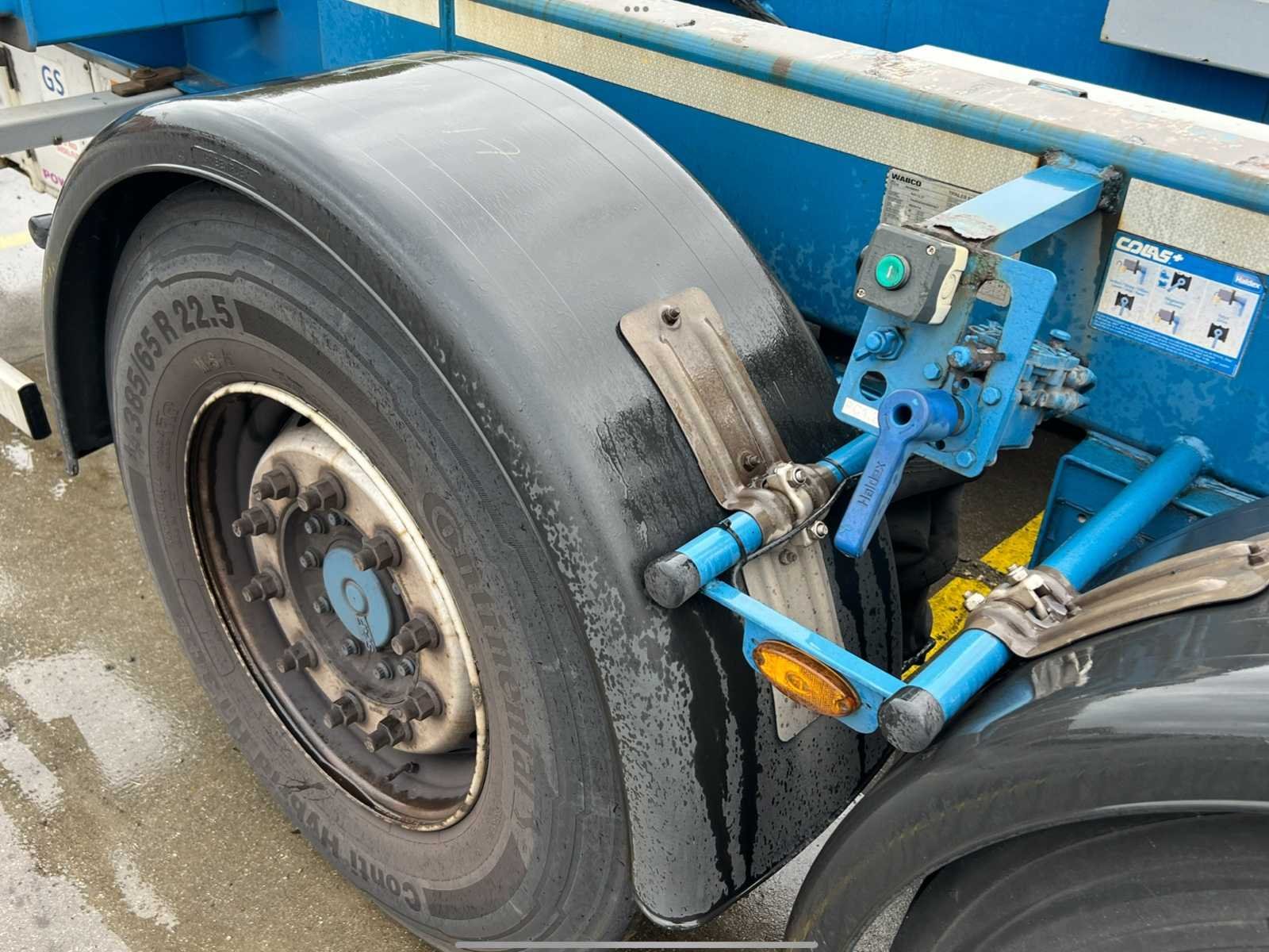 Degelijke Jenson containerchassis-aanhangwagen (type PRS11106), uitgevoerd met 3 assen, luchtvering en een geïntegreerde Carrier PowerMiza dieselgenerator voor koelcontainers. De oplegger is ontworpen voor het vervoer van 20ft, 30ft en 40ft containers en is voorzien van verstelbare twistlocks en schuifbaar chassisgedeelte. Het chassis verkeert in functionele, gebruikte staat met zichtbare roestvorming op frame en steunpoten. Technisch oogt het geheel compleet en geschikt voor onmiddellijk gebruik. Categorie: 3-assige containerchassis oplegger Asconfiguratie: 3 assen, luchtgeveerd Banden: Continental / Dunlop 385/65 R22.5 Remmen: Luchtremmen, WABCO-systeem Chassis: Staal, blauw gelakt Verlengbaar chassis: Ja, uitschuifbaar voor 40ft container Twistlocks: Meervoudig verstelbaar, manueel bedienbaar Opbouw: Open containerframe Vering: Luchtvering Achteras: Hendrickson lift-as systeem (Haldex bediening zichtbaar) Kingpin hoogte: ca. 1.150 mm Leeggewicht: ca. 7.300 kg (geschat) Steunpoten: 2-traps mechanisch verstelbaar, Jost type Uitrusting en voorzieningen: Carrier PowerMiza koelmotor met brandstoftank (“GS15 – Only Red Diesel Fuel”) Verlichting: LED zijmarkering en achterlichten Aansluitingen: Lucht: Dubbel nippelsysteem (rood/blauw) Elektrisch: 2 x 7-polige stekkers Reflectie en kentekenplaathouders aanwezig Nummer op chassis: PRS11106 Staat en opmerkingen: Zichtbare oppervlakkige roestvorming op frame, twistlocks en steunpoten Verfslijtage op diverse plaatsen Banden in redelijke tot goede staat, geen grote beschadigingen zichtbaar Chassis recht, geen zichtbare vervorming of scheuren Koelunit niet getest, fysiek aanwezig (PowerMiza / Carrier) Verlichting visueel aanwezig, niet functioneel getest Extra informatie: Geschikt voor multicontainergebruik (20/30/40ft) Hydraulische / pneumatische functies via Haldex regelunit Chassis kan door verkoper geladen worden op transportmiddel No Merk: Renders Type: polyvalent containerchassis Bouwjaar: 2013 Chassisnummer VIN: PRS11106