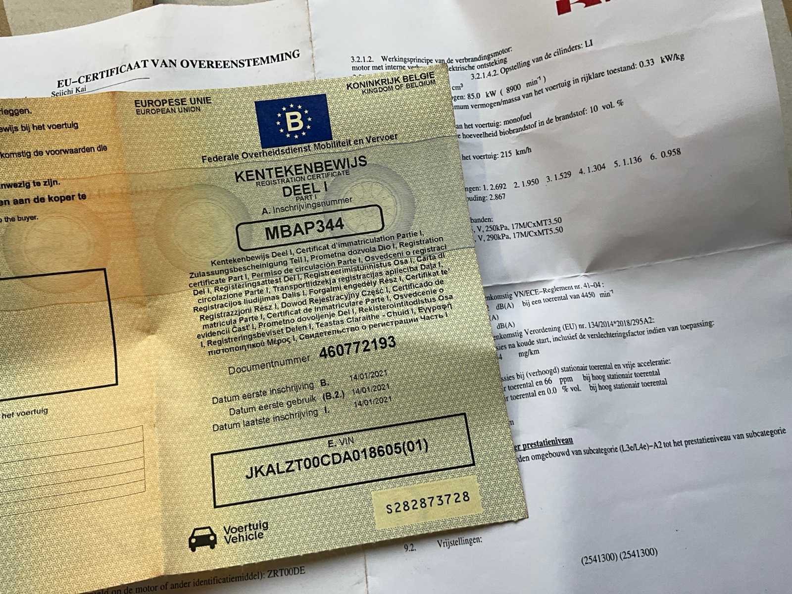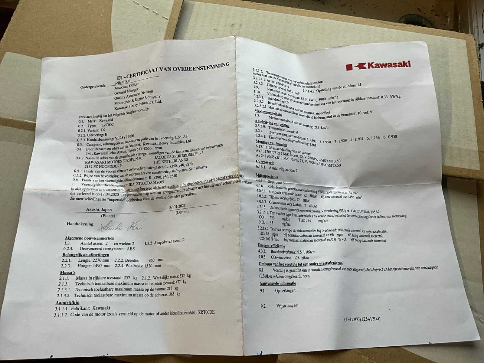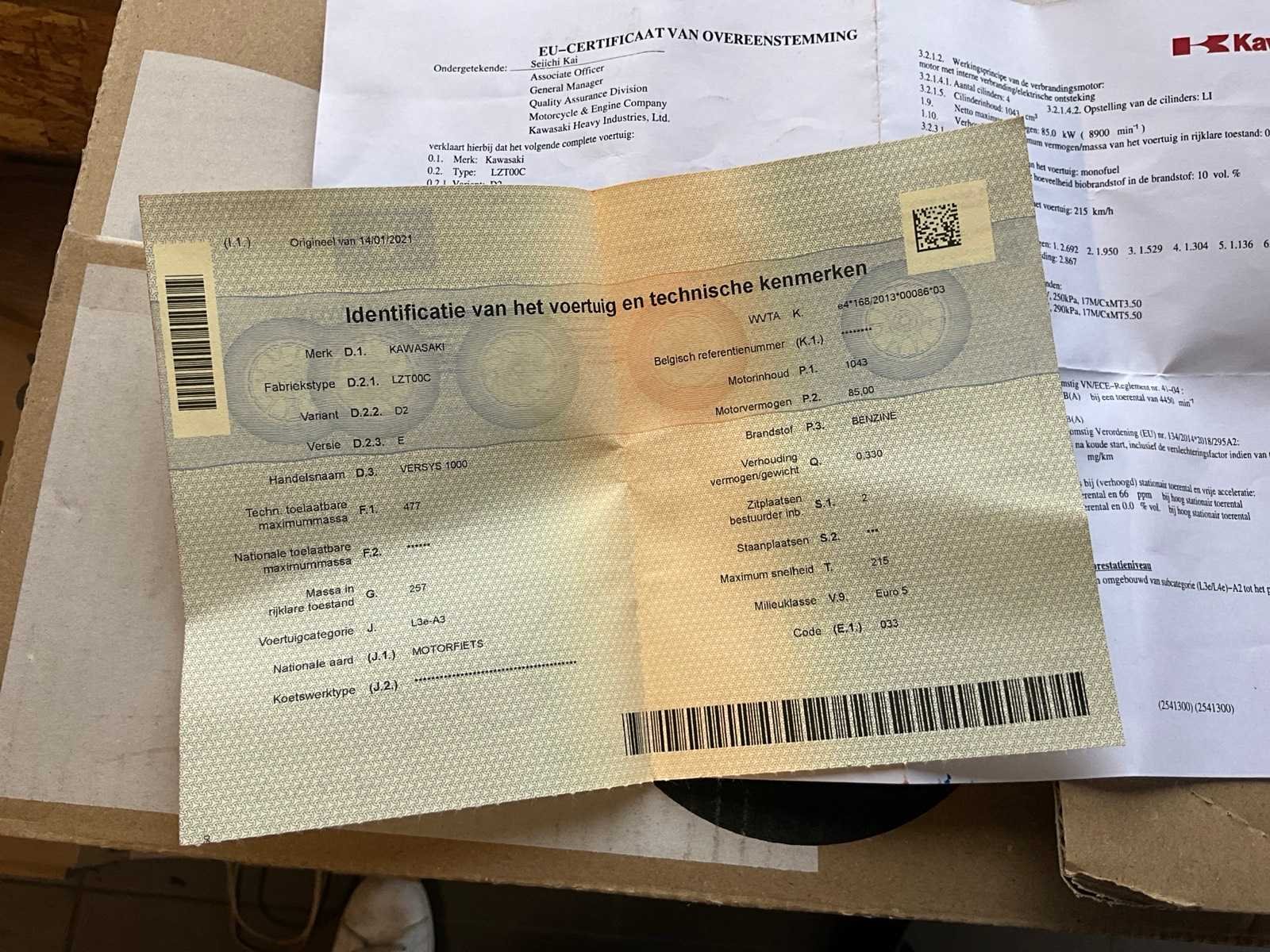 🏍️ Kawasaki Versys 1000 SE (LZT 1000 SE) Merk: Kawasaki Model: LZT 1000 SE Type: Versys 1000 SE Kenteken: MBAP344 Brandstof: Benzine Chassisnummer (VIN): JKALZT00CDA018605(01) Cilinderinhoud: 1043 cc Vermogen: 85,00 kW (≈ 116 pk) Kleur: Groen / Zwart metallic Afgelezen tellerstand: 1.709 km Transmissie: Quikshift (automatische op/afschakeling zonder koppeling) Aantal sleutels: 2 Datum eerste toelating: 14/01/2021 Bouwjaar: 2021 Gewicht (rijklaar): 257 kg Max. snelheid: 215 km/u Koetswerktype: Motorfiets Voertuigcategorie: L3e-A3 Brandstofverbruik: 5,5 l/100 km Milieuklasse: Euro 5 CO₂-uitstoot: 128 g/km Boekjes/documenten aanwezig: Ja Handelsbenaming: Versys 1000 SE Nationale aard documenten: BE 📦 Uitvoering & opties Kleur “Emerald Green / Metallic Black” Quikshift up/down 2 sleutels Topkoffer ABS, KQS (Kawasaki Quick Shifter) TFT-display met Sport/Touring modes LED-verlichting Handvatverwarming Cruise control Verstelbaar windscherm Nee Merk: Kawasaki Model: LZT 1000SE Type: Versys 1000 SE Brandstof: Benzine Chassisnummer: JKALZT00CDA018605(01) Cilinderinhoud: 1043cc Datum eerste toelating: 14012021 Gewicht: 257kg Vermogen (kW): 85kW Kleur: Groen / Zwart metallic Afgelezen kilometerstand: 1709km Transmissie: Quikshift (automatische op/afschakeling zonder koppeling) Handelsbenaming: Versys 1000 SE Nationaliteit documenten: Belg Boorddocumenten aanwezig?: true Aantal sleutels: 2 Bouwjaar: 2021
