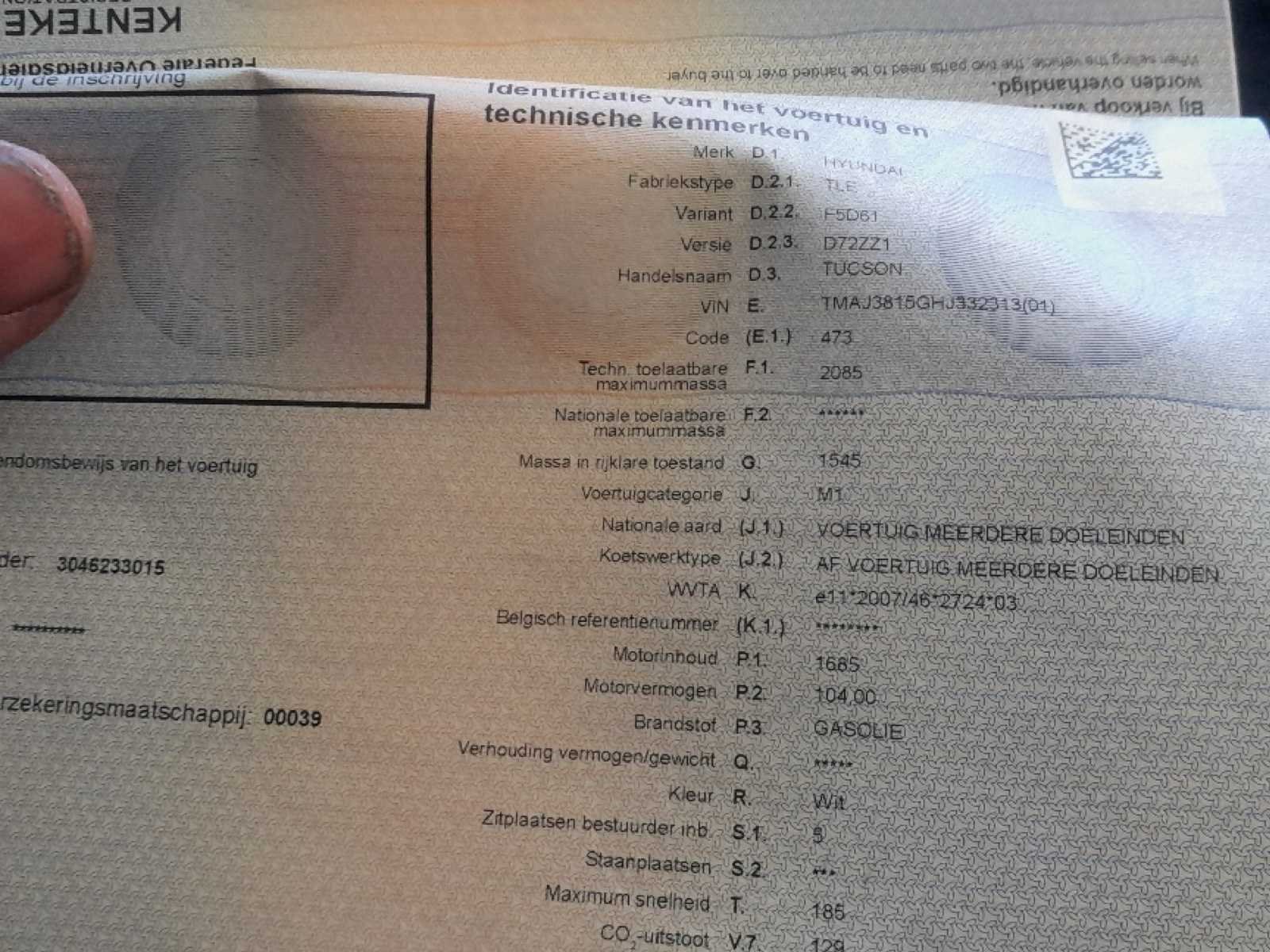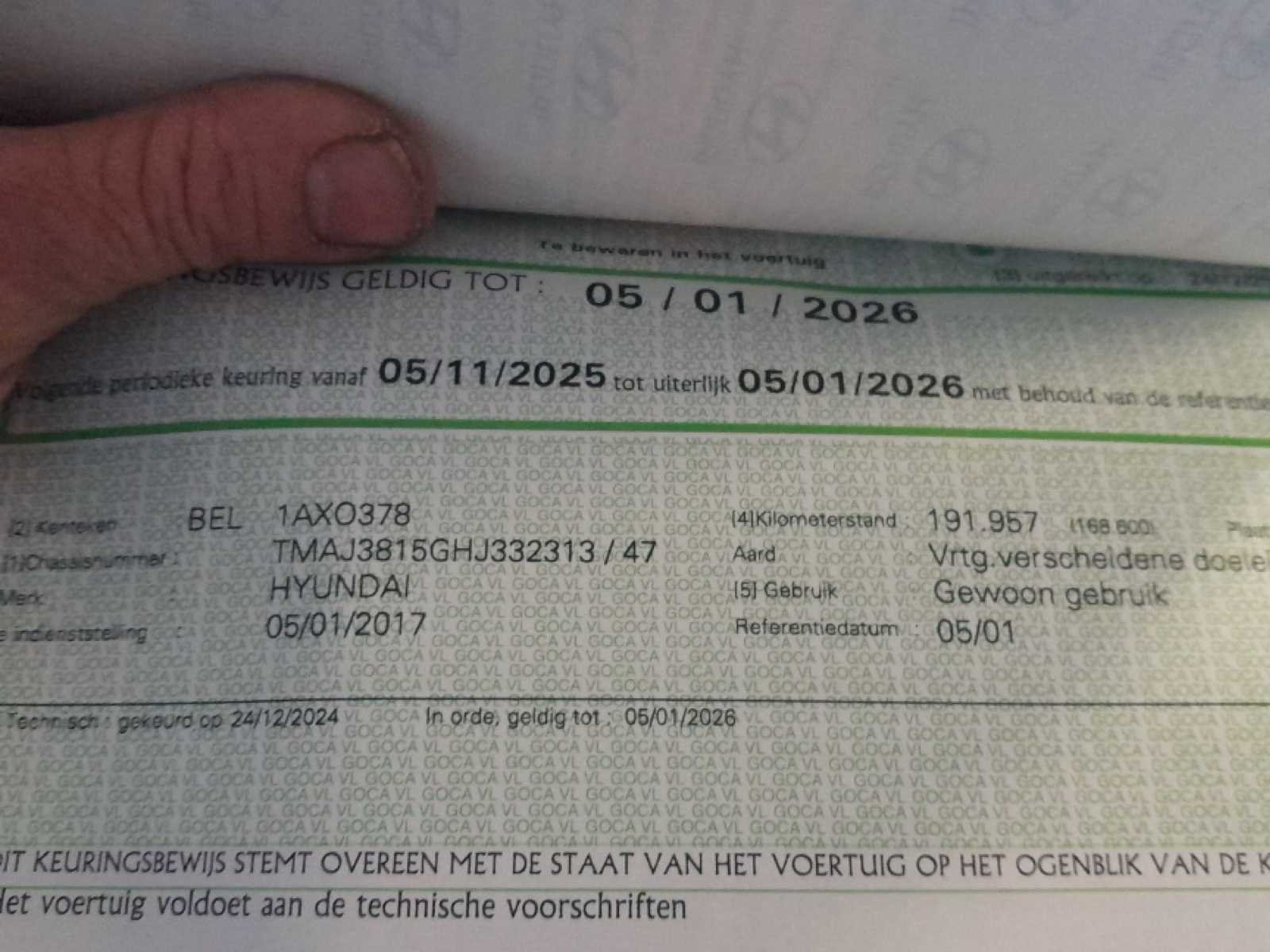 Merk: Hyundai Model: Tucson Type: 1.7 CRDi Premium Automaat Bouwjaar: 2017 Datum eerste inschrijving: 15/09/2017 Brandstof: Diesel Vermogen: 104 kW (141 pk) Transmissie: Automaat (7-traps DCT) Kilometerstand: 191.000 km Kleur: Grijs Aantal zitplaatsen: 5 Euronorm: Euro 6 Chassisnummer (VIN): TMAJ3815GHJ332313 Eerste eigenaar: Ja BTW wagen: Nee Start en rijdt: Ja Motor: Draait mooi, zonder abnormale geluiden Versnellingsbak: Schakelt soepel Onderhoud: Dealeronderhouden, met volledige historiek Schade: Rondom krassen en schade aanwezig, visueel herstel aanbevolen Technische staat: In orde, rijdbaar voertuig Uitrusting en comfort: - Volledig lederen interieur - Verwarming voor- en achterzetels - Elektrisch verstelbare zetels - Navigatiesysteem met groot kleurenscherm - Bluetooth, USB en AUX - Keyless Entry & Start (2 sleutels aanwezig) - 19" aluminium velgen - Vier elektrische ramen - Centrale vergrendeling met afstandsbediening - Parkeersensoren voor- en achteraan - Achteruitrijcamera - Multifunctioneel stuur - Automatische airconditioning (dual zone) - LED-dagrijlichten - Mistlampen Bijzonderheden: - Eerste eigenaar - Euro 6 – geschikt voor LEZ - 141 pk sterke dieselmotor - Automaat, 7 versnellingen - Zeer complete “Premium”-uitvoering - Keyless met 2 sleutels - Dealeronderhouden - Rondom schade aanwezig - Geen BTW-wagen No Merk: HYUNDAI Model: TUCSON 1.7 CRDi PREMIUM Bouwjaar: 2017 Afgelezen kilometerstand: 191000km Cilinderinhoud: 1700cc Vermogen (kW): 104kW Brandstof: diesel Chassisnummer: TMAJ3815GHJ332313 Vermogen (pk): 141hp Aantal zitplaatsen: 5 Transmissie: automaat Start en rijdt: ja Vavato voert geen technische keuring uit.: true LED-koplampen: true Leder bekleed: true Inschrijvingsbewijs - deel 1 : ja Inschrijvingsbewijs - deel 2: ja