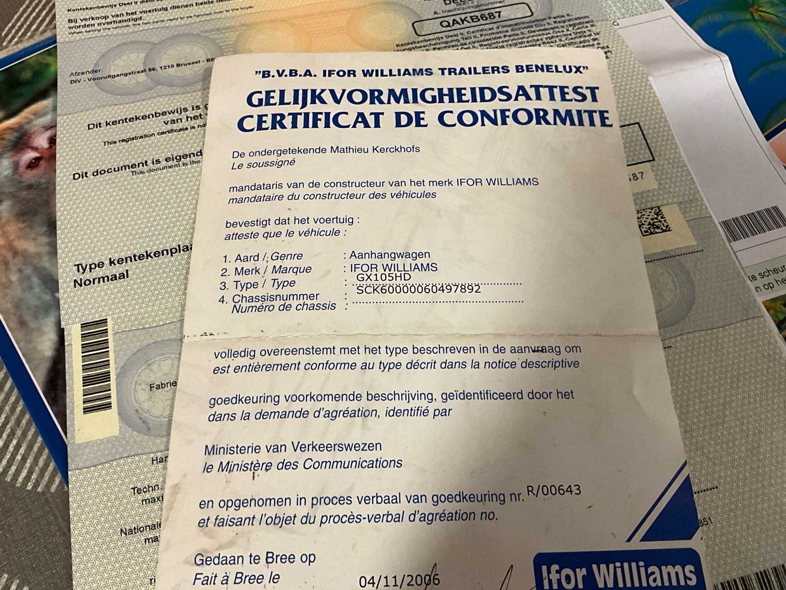 Machine trailer In goede gaat 300x160 Oprijplaat 125 No Merk: Ifor Williams Type: GX105HD Bouwjaar: 2006 Chassisnummer: SCK60000060497892 Aantal assen: 2 Datum eerste toelating: 13/11/2006 Nationaliteit documenten: België