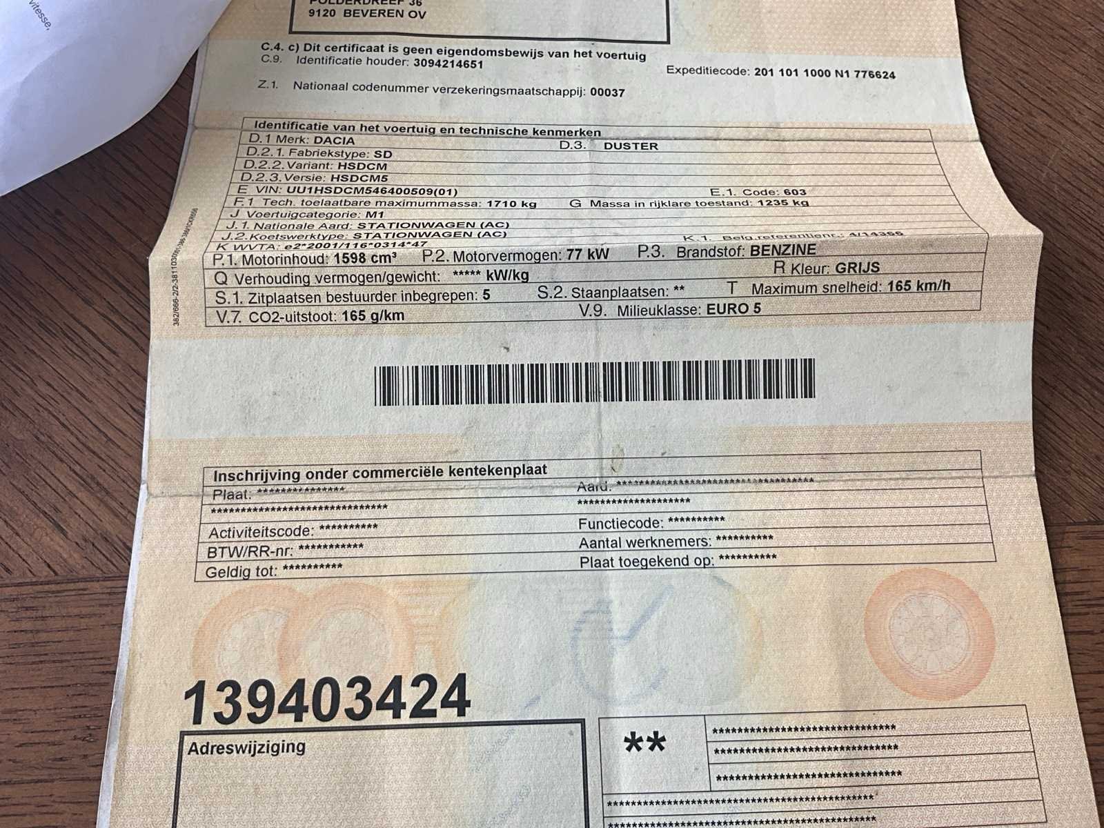 Nee Merk: Dacia Model: Duster Bouwjaar: 2011 Brandstof: benzine Chassisnummer: 0509 Vavato voert geen technische keuring uit.: true