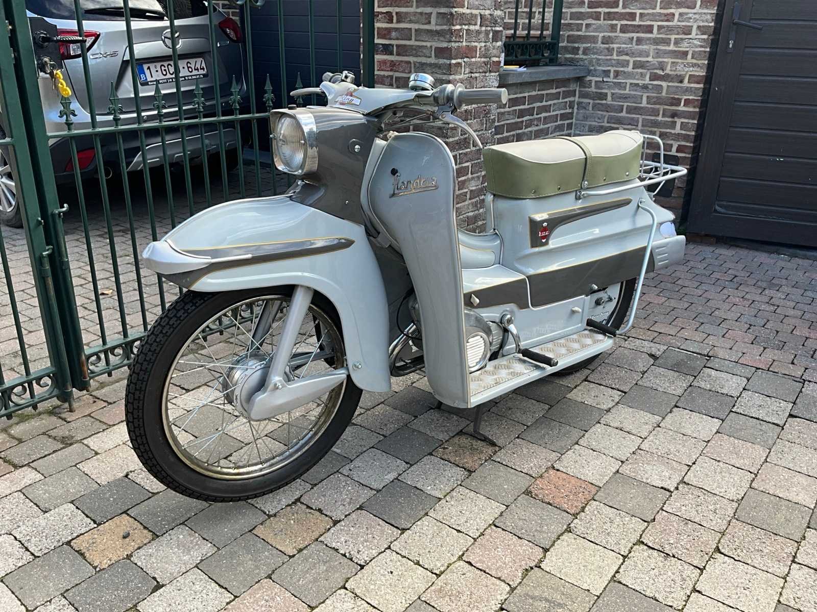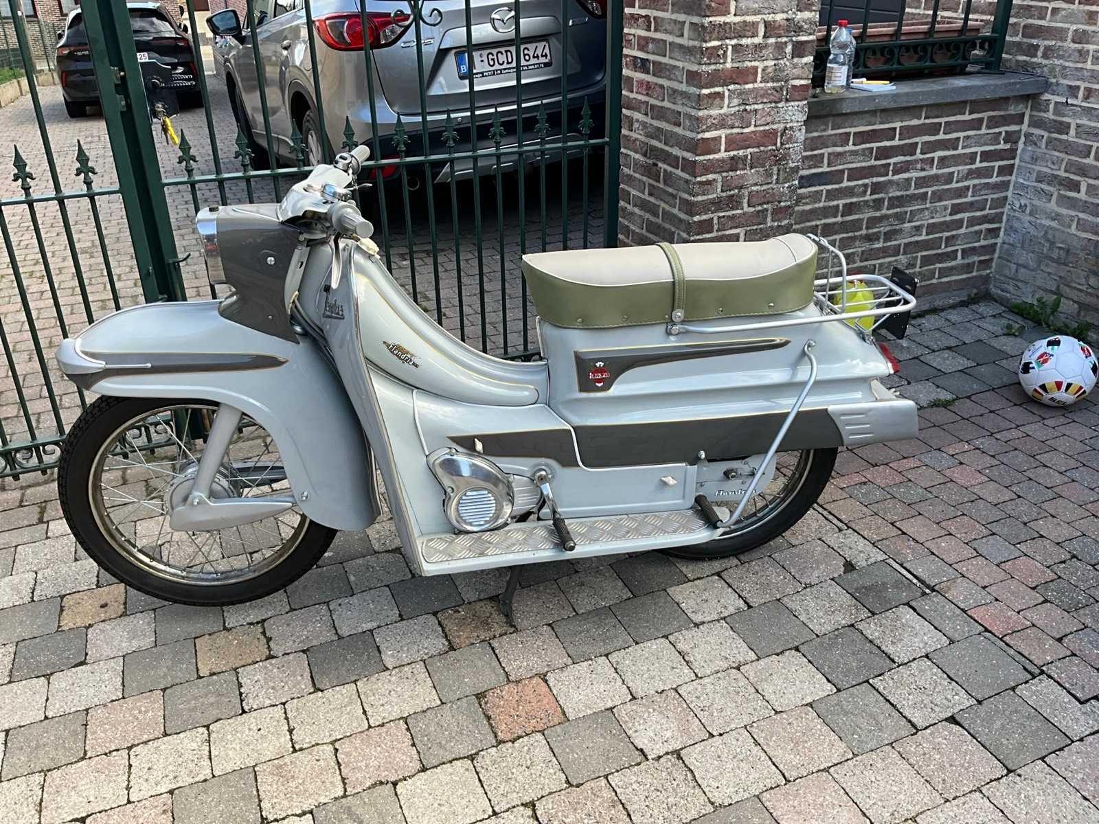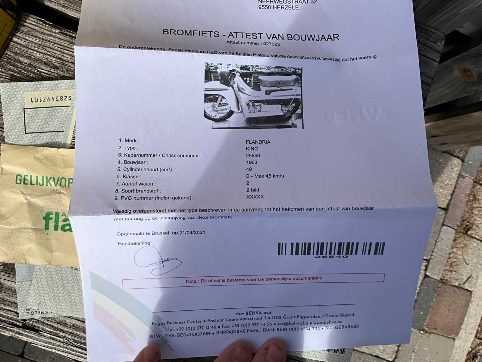 Blok gereviseerd Volledig gerestaureerd Nieuwe banden Nee Merk: Flandria Model: King Kenteken: OSBN757 Datum eerste toelating: 01/01/1963 Transmissie: Manueel, kettingaandrijving Brandstof: Benzine (2-takt, mengsmering) Kleur: wit/creme Bouwjaar: 1963 Chassisnummer: 25540 GS Code: 87115000