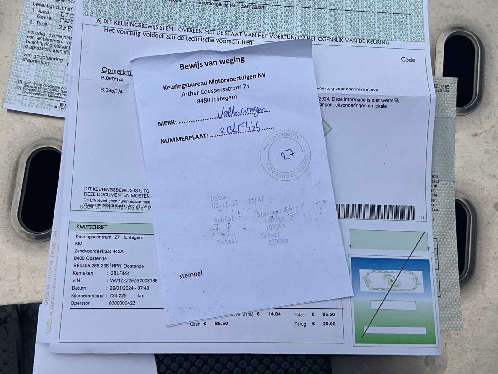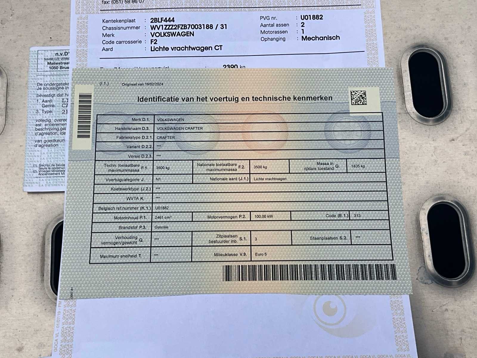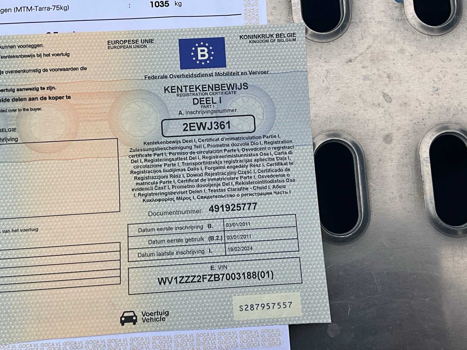 Merk: Volkswagen Handelsnaam: Volkswagen Crafter Fabriekstype: Crafter Voertuigcategorie: N1 (lichte vrachtwagen) Koetswerktype: F2 (lichte vrachtwagen CT) Aantal assen: 2 Ophanging: Mechanisch Aantal motorassen: 1 📌 Identificatie Chassisnummer (VIN): WV1ZZZ2FZB7003188 Belgisch ref.nr (K): U01882 Kenteken (huidig): 2EWJ361 Vorige nummerplaat: 2BLF444 Datum eerste inschrijving: 03/01/2011 Datum eerste gebruik: 03/01/2011 Datum laatste inschrijving: 19/02/2024 📌 Technische gegevens Motorinhoud: 2461 cm³ Motorvermogen: 100.00 kW (≈ 136 pk) Brandstof: Diesel (document zegt "Gasolie") Milieuklasse: Euro 5 Technisch toegelaten max. massa (MTM): 3500 kg Massa rijklaar (Tarra): 2390 kg Nuttig laadvermogen: 1035 kg (MTM – Tara – 75 kg bestuurder) MTM sleep: Nihil (geen trekhaak/trekvermogen genoteerd) Zitplaatsen: 3 (2 + 1) 📌 Keuring en documenten Keuring geldig tot: 29/01/2025 Volgende keuring voorzien vanaf: 29/11/2024 Opmerkingen: enkele administratieve vermeldingen, technisch in orde verklaard Bewijs van weging: 2390 kg geregistreerd bij station 27, Ichtegem (02/11/2023) 📌Extra items Bij de wagen horen 2 originele VW-sleutels met afstandsbediening. Nee Merk: Volkswagen Model: Crafter Bouwjaar: 2011 Cilinderinhoud: 2461cc Vermogen (kW): 100kW Brandstof: diesel Chassisnummer: WV1ZZZ2FZB7003188 Laadvermogen: 1200kg Datum eerste toelating: 03/01/2011 Vermogen (pk): 136hp Aantal zitplaatsen: 3 Transmissie: manueel Stuurwiel: links Emissieklasse: 5 Nationaliteit documenten: belg Vavato voert geen technische keuring uit.: true Inschrijvingsbewijs - deel 1 : aanwezig Inschrijvingsbewijs - deel 2: aanwezig