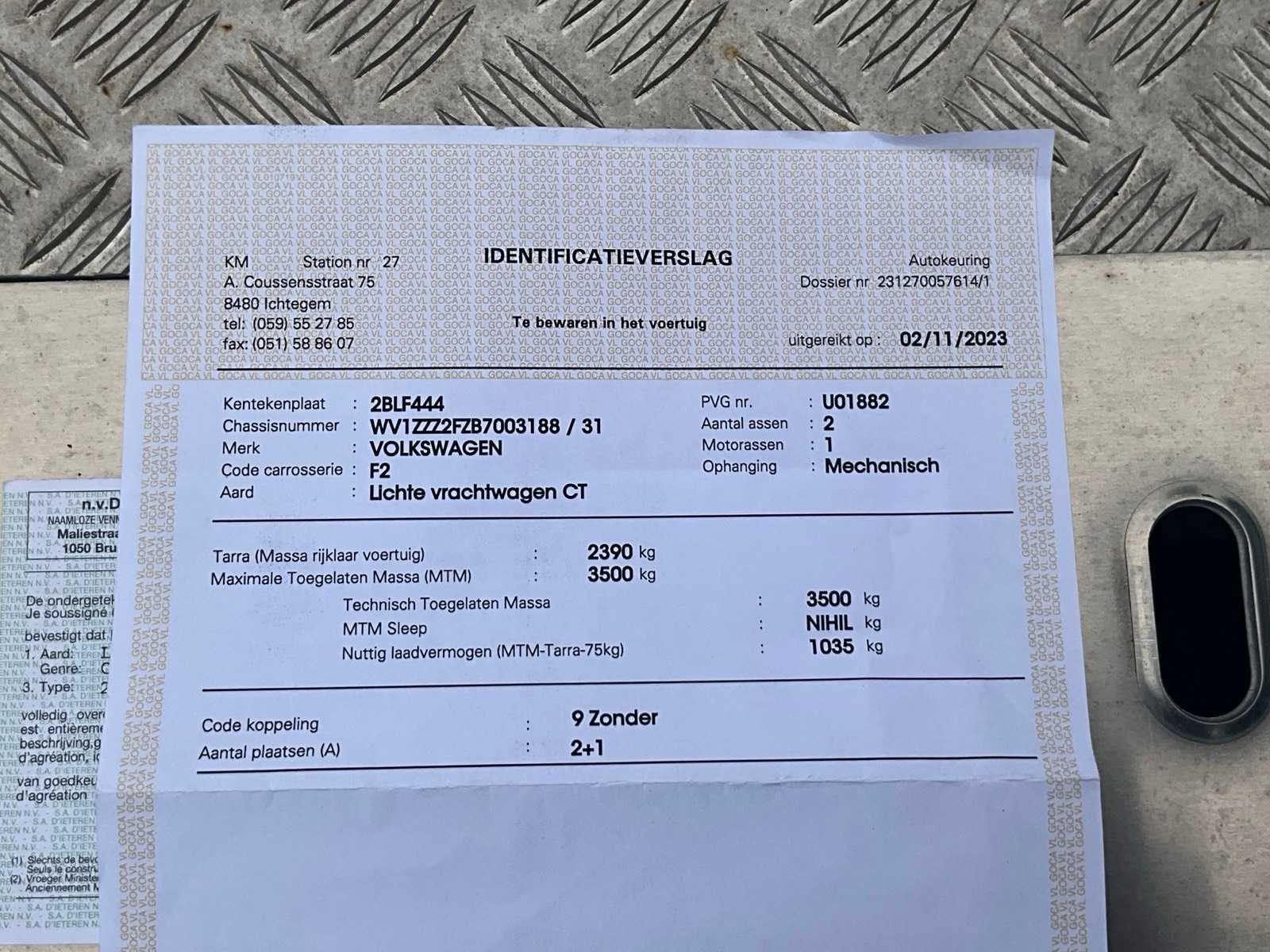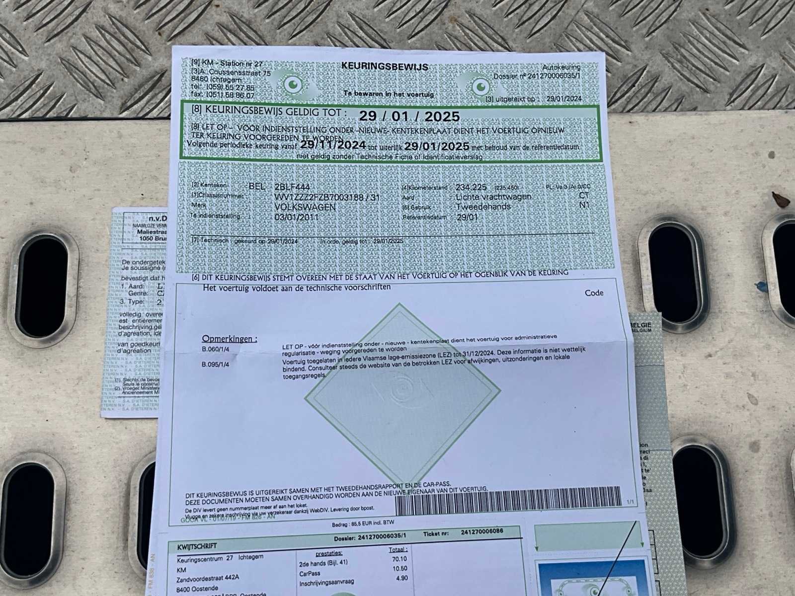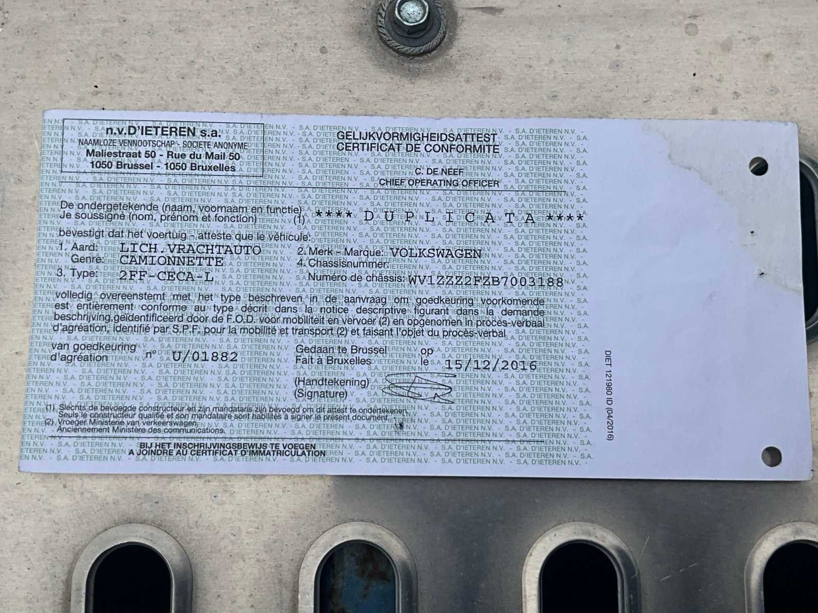 Merk: Volkswagen Handelsnaam: Volkswagen Crafter Fabriekstype: Crafter Voertuigcategorie: N1 (lichte vrachtwagen) Koetswerktype: F2 (lichte vrachtwagen CT) Aantal assen: 2 Ophanging: Mechanisch Aantal motorassen: 1 📌 Identificatie Chassisnummer (VIN): WV1ZZZ2FZB7003188 Belgisch ref.nr (K): U01882 Kenteken (huidig): 2EWJ361 Vorige nummerplaat: 2BLF444 Datum eerste inschrijving: 03/01/2011 Datum eerste gebruik: 03/01/2011 Datum laatste inschrijving: 19/02/2024 📌 Technische gegevens Motorinhoud: 2461 cm³ Motorvermogen: 100.00 kW (≈ 136 pk) Brandstof: Diesel (document zegt "Gasolie") Milieuklasse: Euro 5 Technisch toegelaten max. massa (MTM): 3500 kg Massa rijklaar (Tarra): 2390 kg Nuttig laadvermogen: 1035 kg (MTM – Tara – 75 kg bestuurder) MTM sleep: Nihil (geen trekhaak/trekvermogen genoteerd) Zitplaatsen: 3 (2 + 1) 📌 Keuring en documenten Keuring geldig tot: 29/01/2025 Volgende keuring voorzien vanaf: 29/11/2024 Opmerkingen: enkele administratieve vermeldingen, technisch in orde verklaard Bewijs van weging: 2390 kg geregistreerd bij station 27, Ichtegem (02/11/2023) 📌Extra items Bij de wagen horen 2 originele VW-sleutels met afstandsbediening. Nee Merk: Volkswagen Model: Crafter Bouwjaar: 2011 Cilinderinhoud: 2461cc Vermogen (kW): 100kW Brandstof: diesel Chassisnummer: WV1ZZZ2FZB7003188 Laadvermogen: 1200kg Datum eerste toelating: 03/01/2011 Vermogen (pk): 136hp Aantal zitplaatsen: 3 Transmissie: manueel Stuurwiel: links Emissieklasse: 5 Nationaliteit documenten: belg Vavato voert geen technische keuring uit.: true Inschrijvingsbewijs - deel 1 : aanwezig Inschrijvingsbewijs - deel 2: aanwezig