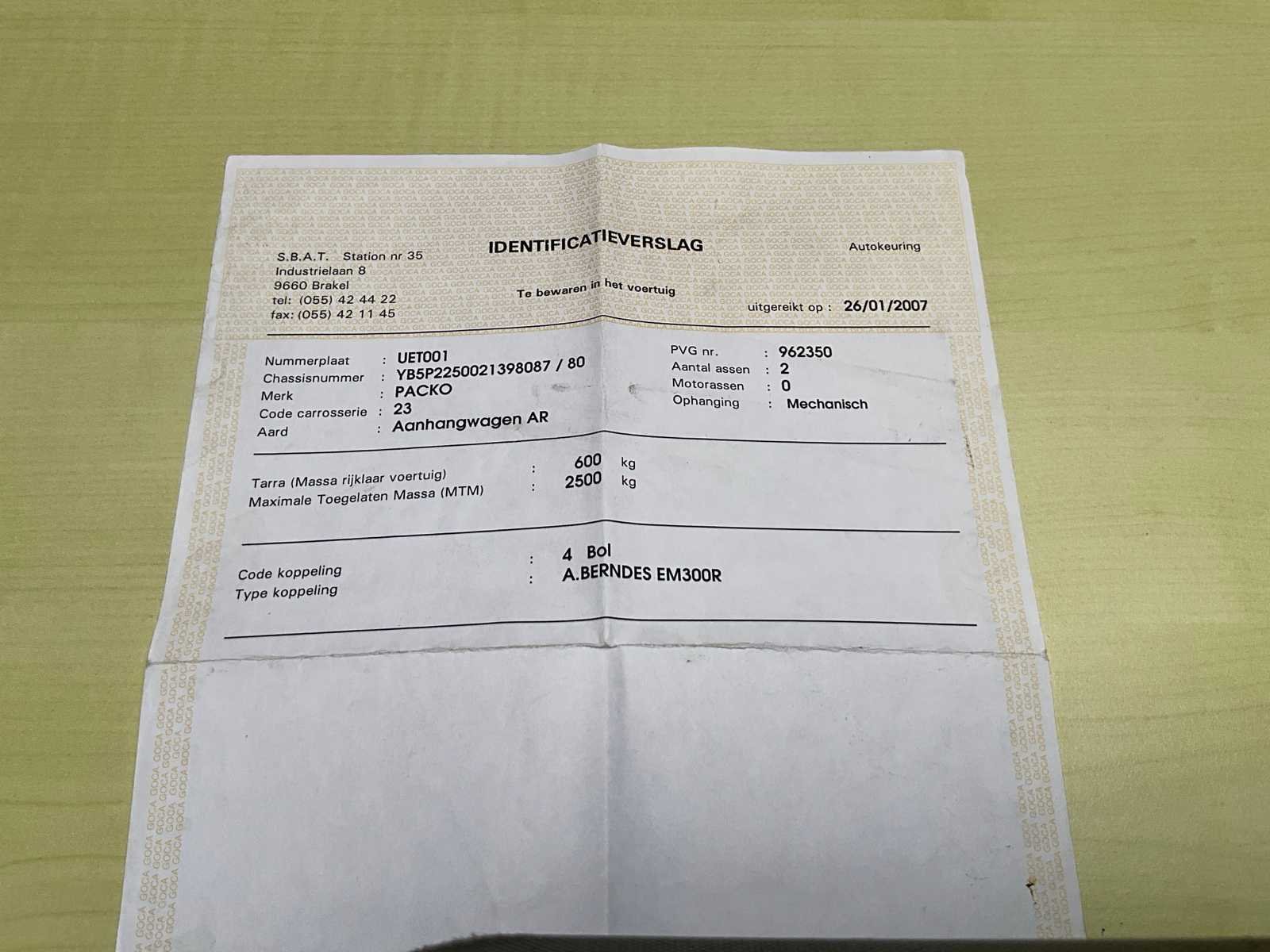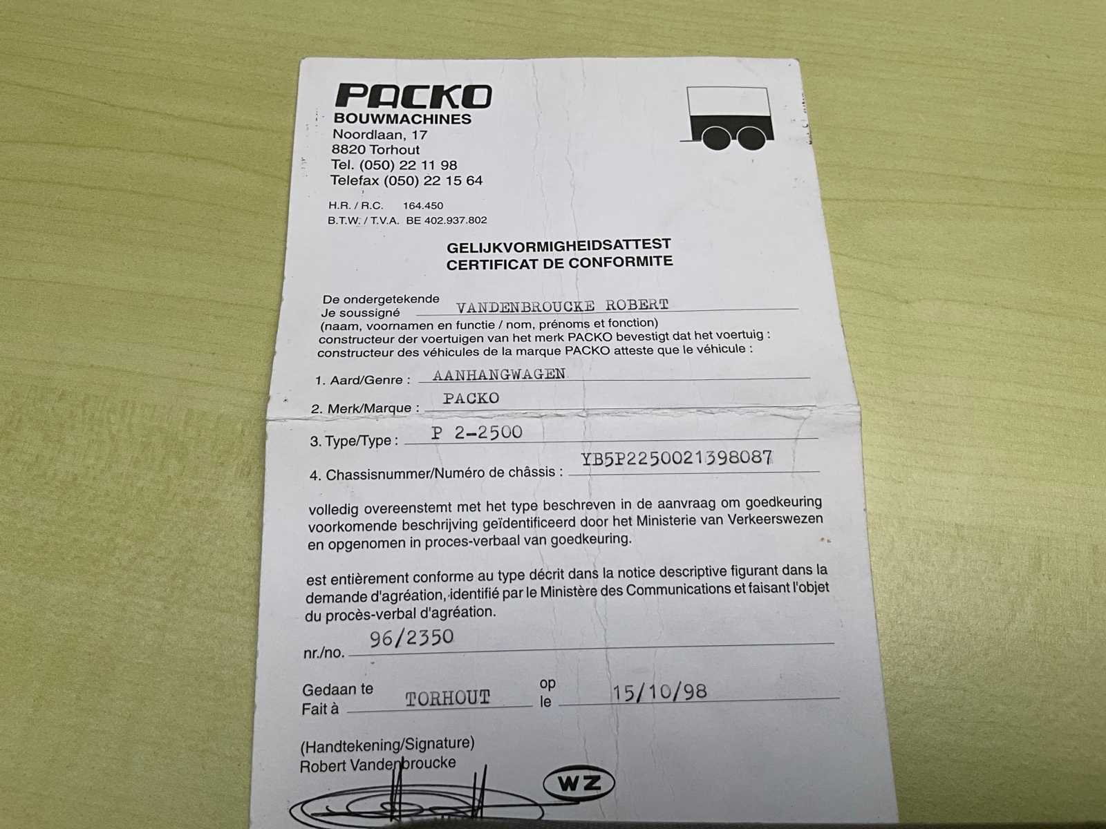 Nee Merk: Packo Type: P2-2500 Bouwjaar: 1998 Chassisnummer: YB5P2250021398087 Aantal assen: 2 Nationaliteit documenten: Belg
