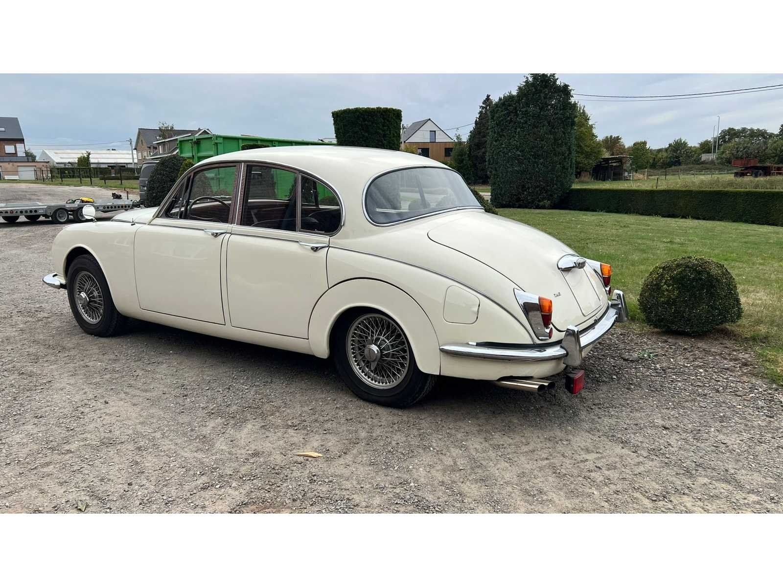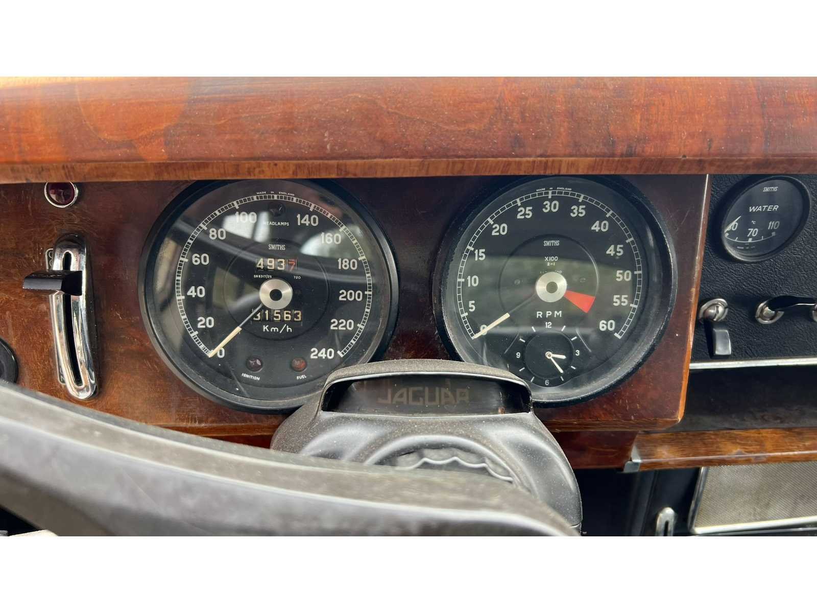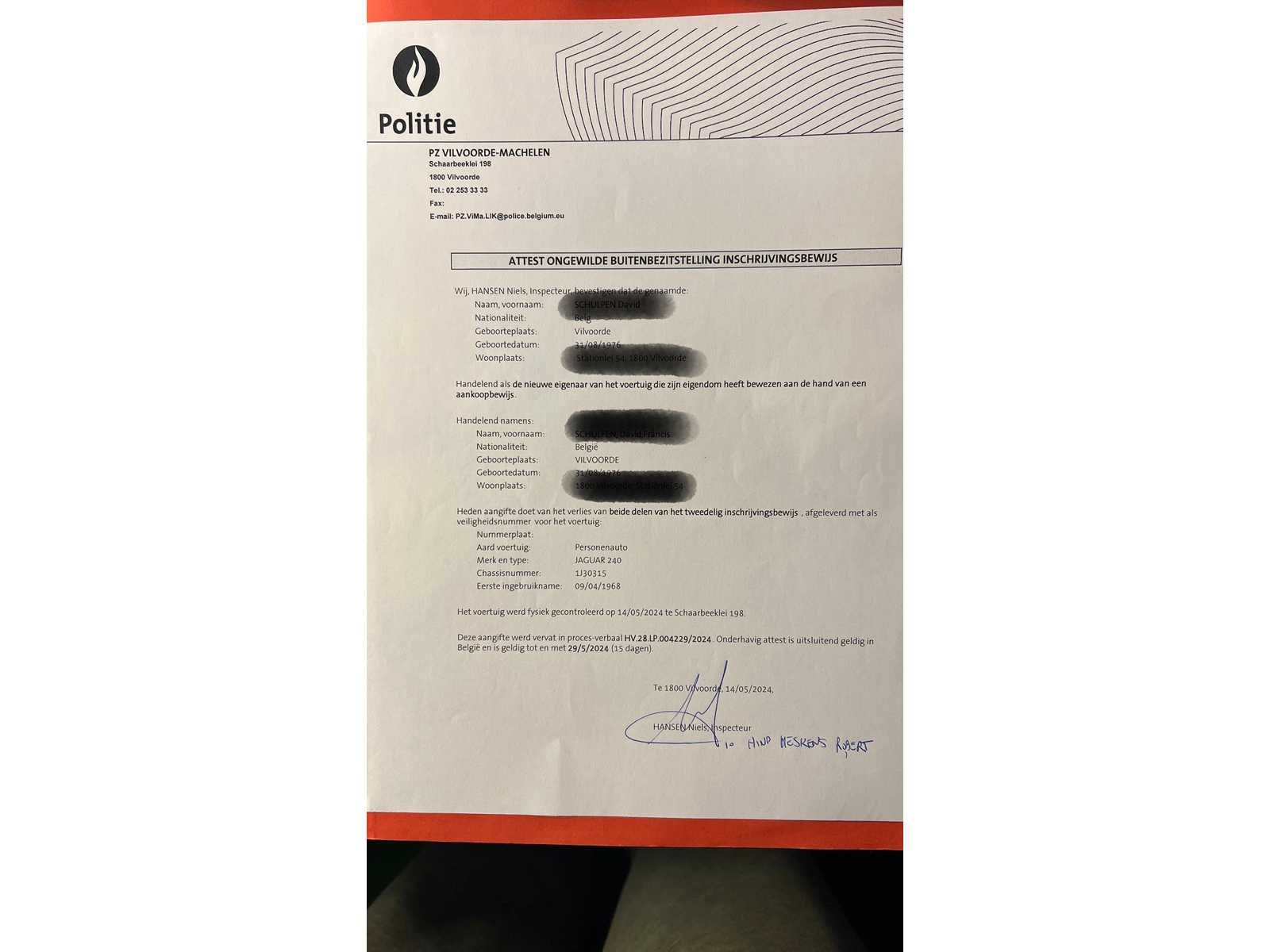 Jaguar 240 uit 1968 in zeer goede staat. Motor moet opnieuw opgestart worden maar staat los. Papieren ontbreken (attest verlies van documenten). Carrosserie en interieur in zeer goede staat. Exterieur: Originele Old English White lak. Mooie, rechte carrosserie met correcte chroomlijsten. Draadspaakwielen. Voorzien van originele mistlampen en sierstrippen. Spiegels op spatborden (period correct). Interieur: Origineel walnoothouten dashboard met Smiths meters. Zwart lederen bekleding in originele stijl. Origineel stuur met Jaguar-embleem. Eenvoudige maar authentieke schakelknoppen, typisch voor late Mk2-modellen. Motorruimte: XK6-motor met dubbele SU-carburateurs (duidelijk zichtbaar). Correcte lay-out van bobine, brandstofpomp en luchtaanzuiging. Schijfremmen op alle wielen. Slechts 4400 exemplaren van gemaakt. Nee Merk: Jaguar Type: 240 Bouwjaar: 1968 Chassisnummer: 1J30315 Afgelezen kilometerstand: 31563 Datum eerste inschrijving: 09/04/1968 Datum eerste toelating: 09/04/1968 Transmissie: Manueel Vermogen (pk): 133 Vermogen (kW): 99kW Aantal deuren: 4 Kleur: Old English White Cilinderinhoud: 2483 Aantal cilinders: 6