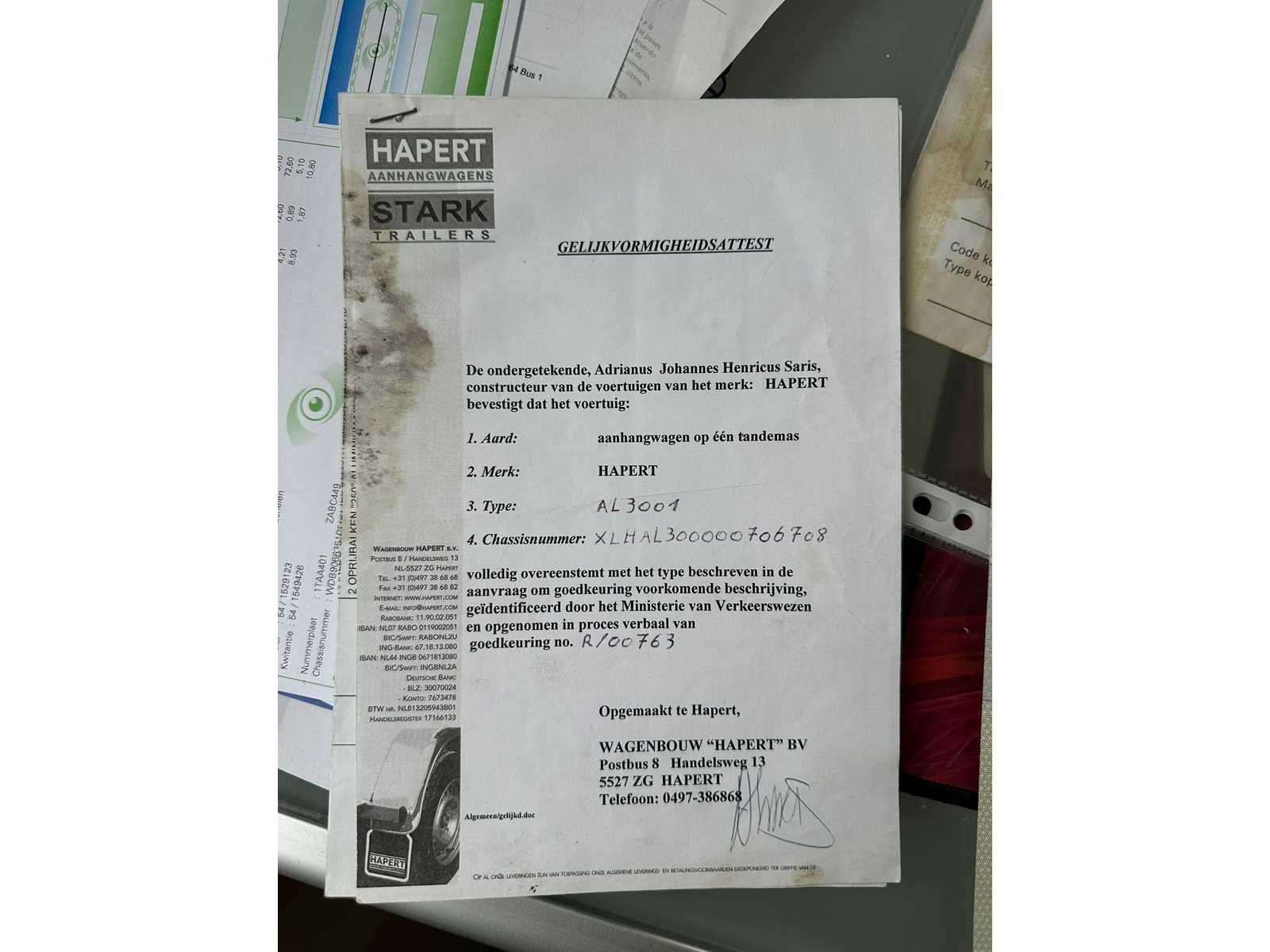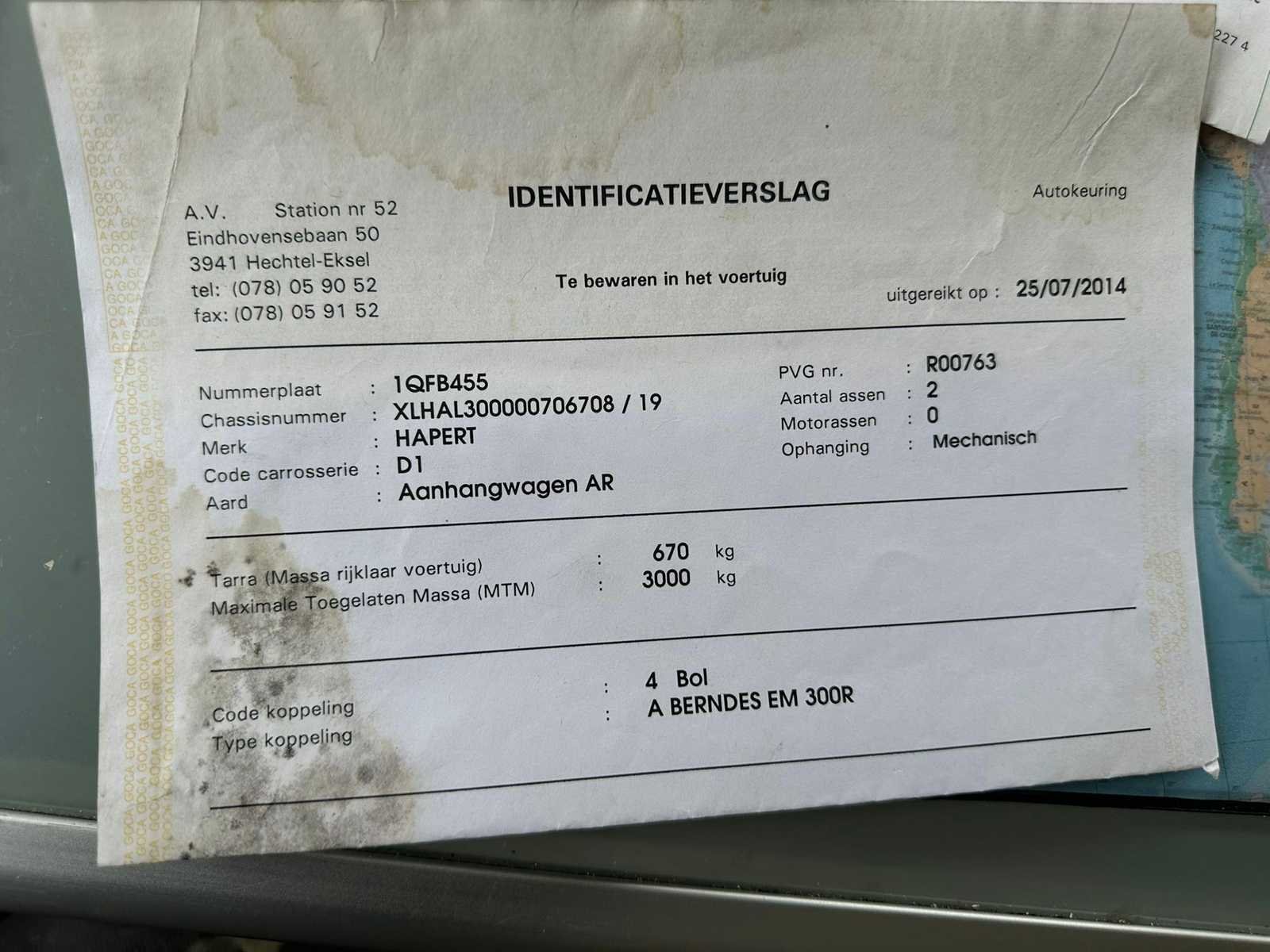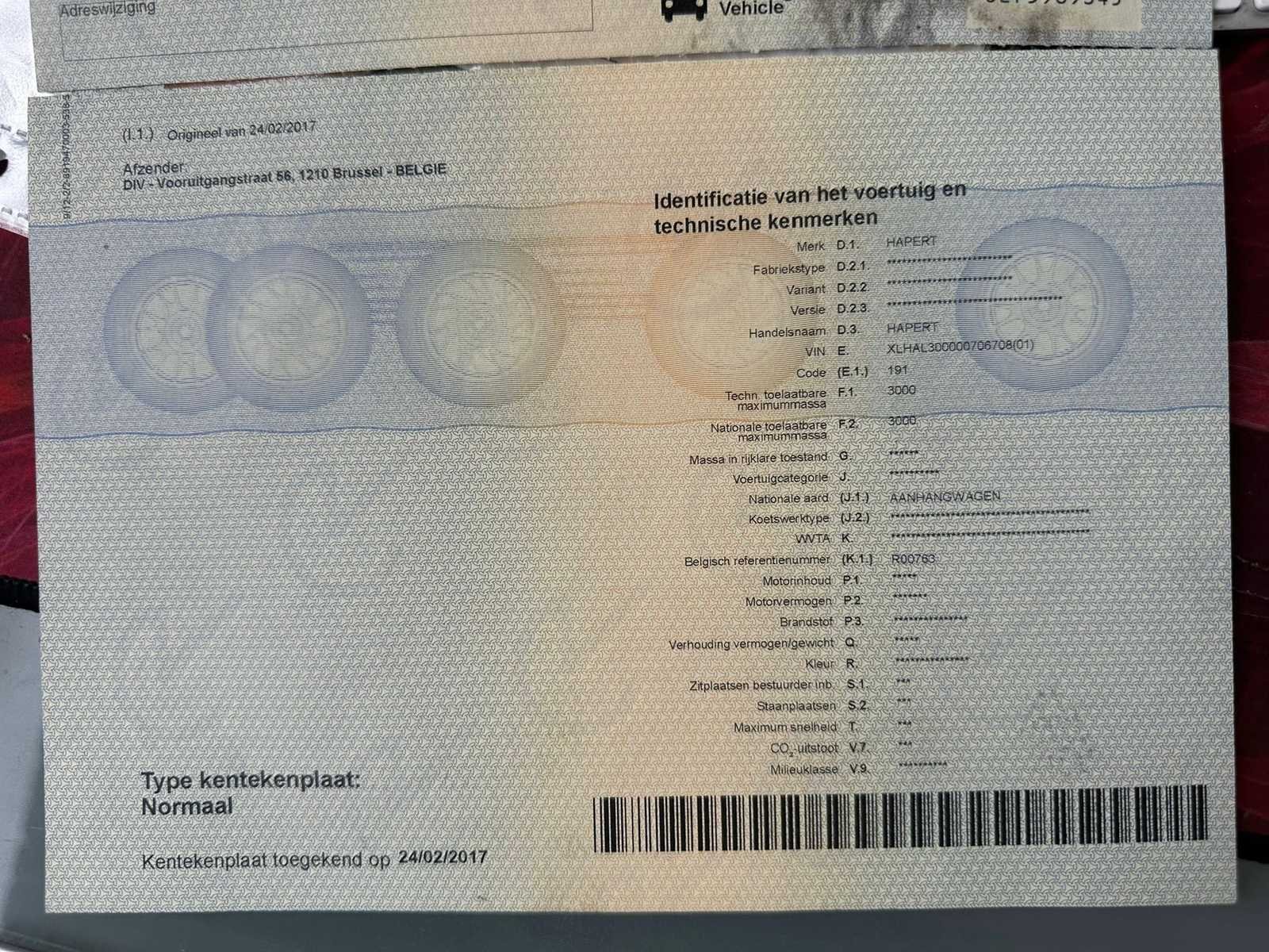Degelijke Hapert plateau aanhangwagen, type TB30-2230, met een toegelaten maximummassa van 3000 kg. De aanhangwagen is volledig verzinkt en voorzien van opklapbare zijborden en een stevige laadvloer. De dispel (dissel) is in goede staat en uitgerust met een oplooprem en steunwiel. De aanhangwagen vertoont gebruikssporen (zoals zichtbaar op de foto’s) maar is functioneel en stevig gebouwd, ideaal voor bouw- of transportdoeleinden. Nee Merk: Hapert Type: Plateau Model: AL3001 Bouwjaar: 2008 Chassisnummer: XLHAL300000706708 Aantal assen: 2 Laadbak afmeting l: 410cm Laadbak afmeting b: 220cm Ledig gewicht: 670kg Laadvermogen: 2339kg Datum eerste toelating: 03/10/2008 Kentekenpapieren compleet?: true Nationaliteit documenten: Belgisch Zelf rijdend exporteren: Mogelijk