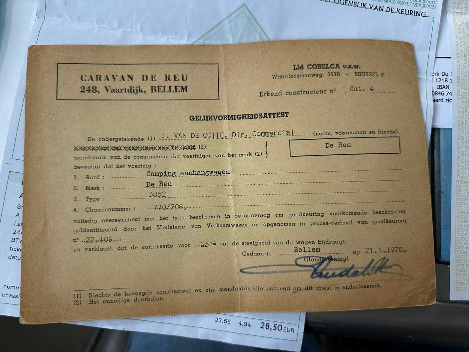 Prachtige klassieke caravan De Reu Casablanca GT, Belgische makelij uit Bellem, met originele gelijkvormigheidsattest van 1970. Deze retro caravan verkeert in opmerkelijk nette staat voor zijn leeftijd en is een echt verzamelobject voor liefhebbers van vintage kampeervoertuigen. De authentieke details, zoals de originele logo’s, aluminium raamomlijsting en klassieke verlichting, zijn goed bewaard gebleven. De caravan is volledig gesloten, met ramen rondom en gordijntjes aan de binnenzijde. De carrosserie verkeert in mooie, stevige staat zonder grote schade of roestvorming. Het typeplaatje en chassisnummer zijn aanwezig en overeenstemmend met het originele attest. Perfect als nostalgische kampeercaravan, retro showobject, of als restauratieproject voor de liefhebber. Een zeldzame vondst van Belgische bodem — De Reu Casablanca GT, een stuk kampeergeschiedenis! Nee Merk: De Reu Model: 3852 Chassisnummer: 770208 Gewicht: MTM 920kg Datum eerste toelating: 07/06/2002 Bouwjaar: 2002 Carrosserie: Kampeeraanhangwagen Kleur: Wit Gewicht: 710kg