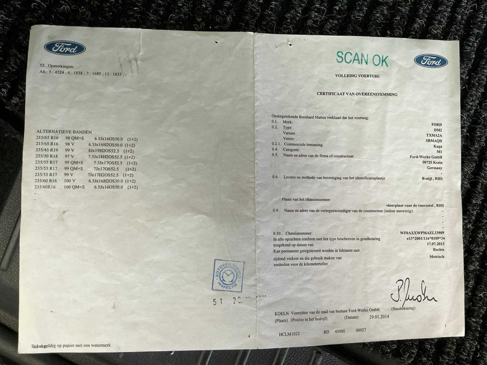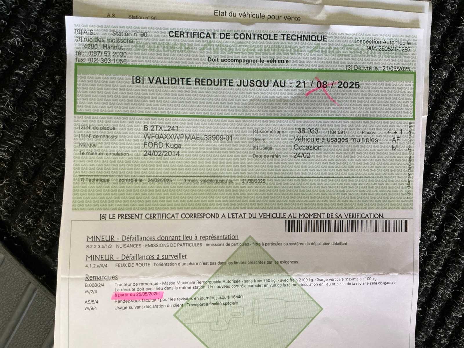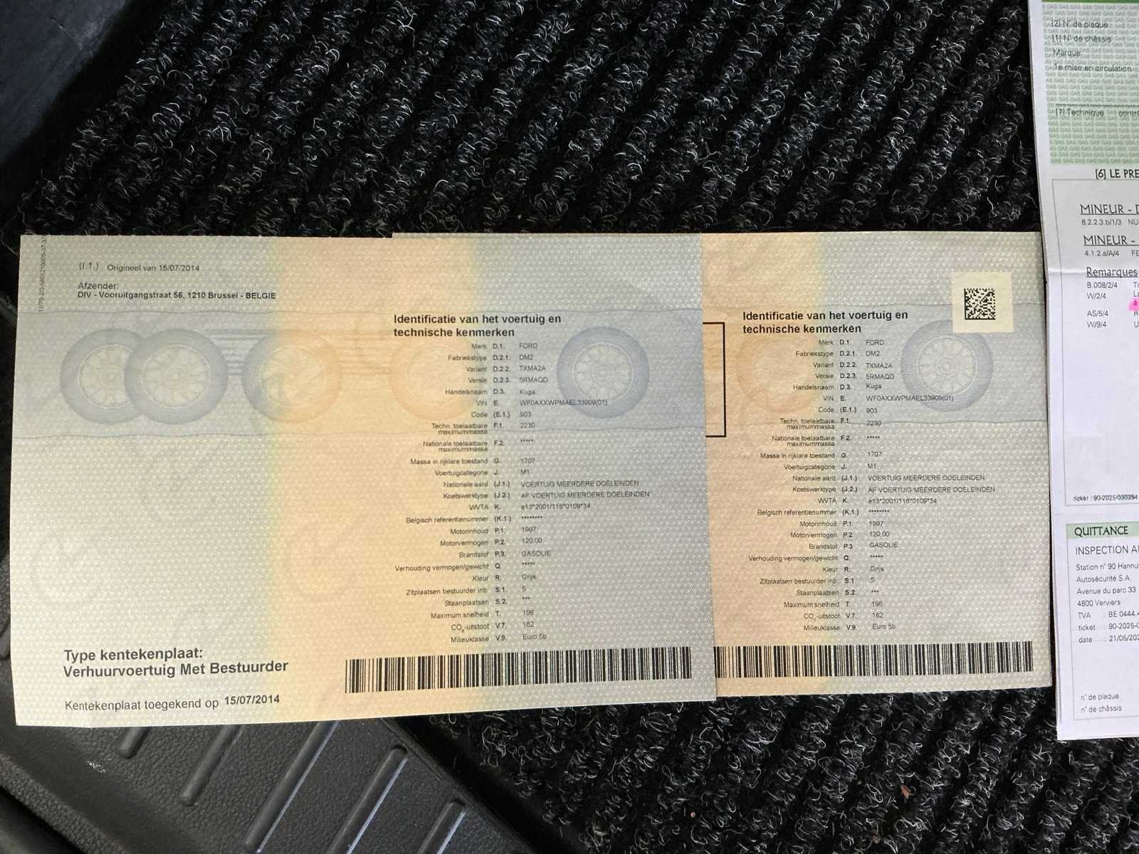 Deze Ford Kuga uit 2014 is een stijlvolle en goed uitgeruste SUV met bijna Full Option-uitvoering. De wagen is voorzien van een automatische versnellingsbak, een indrukwekkend Sony sound system en een panoramisch open dak dat zorgt voor een ruimtelijk en luxueus rijgevoel. Comfort, klasse en rijplezier komen hier perfect samen. Met normale gebruiksporen en schade achteraan de bumper. Zie foto’s. Dealer onderhouden facturen aanwezig en afkomstig van 1 dezelfde eigenaar. Nee Merk: Ford Model: Kuga Bouwjaar: 2014 Afgelezen kilometerstand: 143225km Cilinderinhoud: 1997cc Vermogen (kW): 120kW Brandstof: diesel Chassisnummer: WF0AXXWPMAEL33909 Datum eerste toelating: 24/02/2014 Vermogen (pk): 163hp Aandrijving: FWD Aantal zitplaatsen: 5 Maximaal trekgewicht ongeremd: 750kg Maximaal trekgewicht geremd: 2100kg Kleur: Grijs Transmissie: Automaat Stuurwiel: Multifunctioneel Emissieklasse: 5b Aantal deuren: 5 Aantal sleutels: 2 Ledig gewicht: 1707kg Velgmaat: 17” Aantal cilinders: 4 Carrosserie: SUV/Off-Road/Pick-Up Nationaliteit documenten: Belgisch CO2-uitstoot NEDC: 162 CVO verklaring: true Onderhoudshistorie: Dealer onderhouden Gelijkvormigheidsattest aanwezig: true Start en rijdt: Ja Keuringsrapport geldig tot: 21/08/2025 Technische fiche: true Self drive export possible : true Vavato voert geen technische keuring uit.: true Airconditioning: true Navigatie: true Inschrijvingsbewijs - deel 1 : Aanwezig Inschrijvingsbewijs - deel 2: Aanwezig