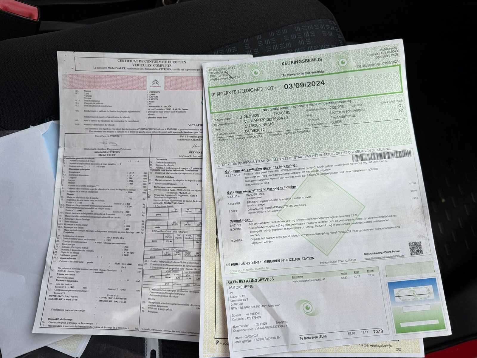 COC en keuringsverslag aanwezig Geen inschrijvingsbewijs deel 1 of 2 aanwezig, wel attest van verlies No Merk: Citroën Model: Nemo Bouwjaar: 2012 Afgelezen kilometerstand: 236325km Chassisnummer: VF7AAFHZ0C8279064 Datum eerste toelating: 04/09/2012 startinformatie : Start en rijdt