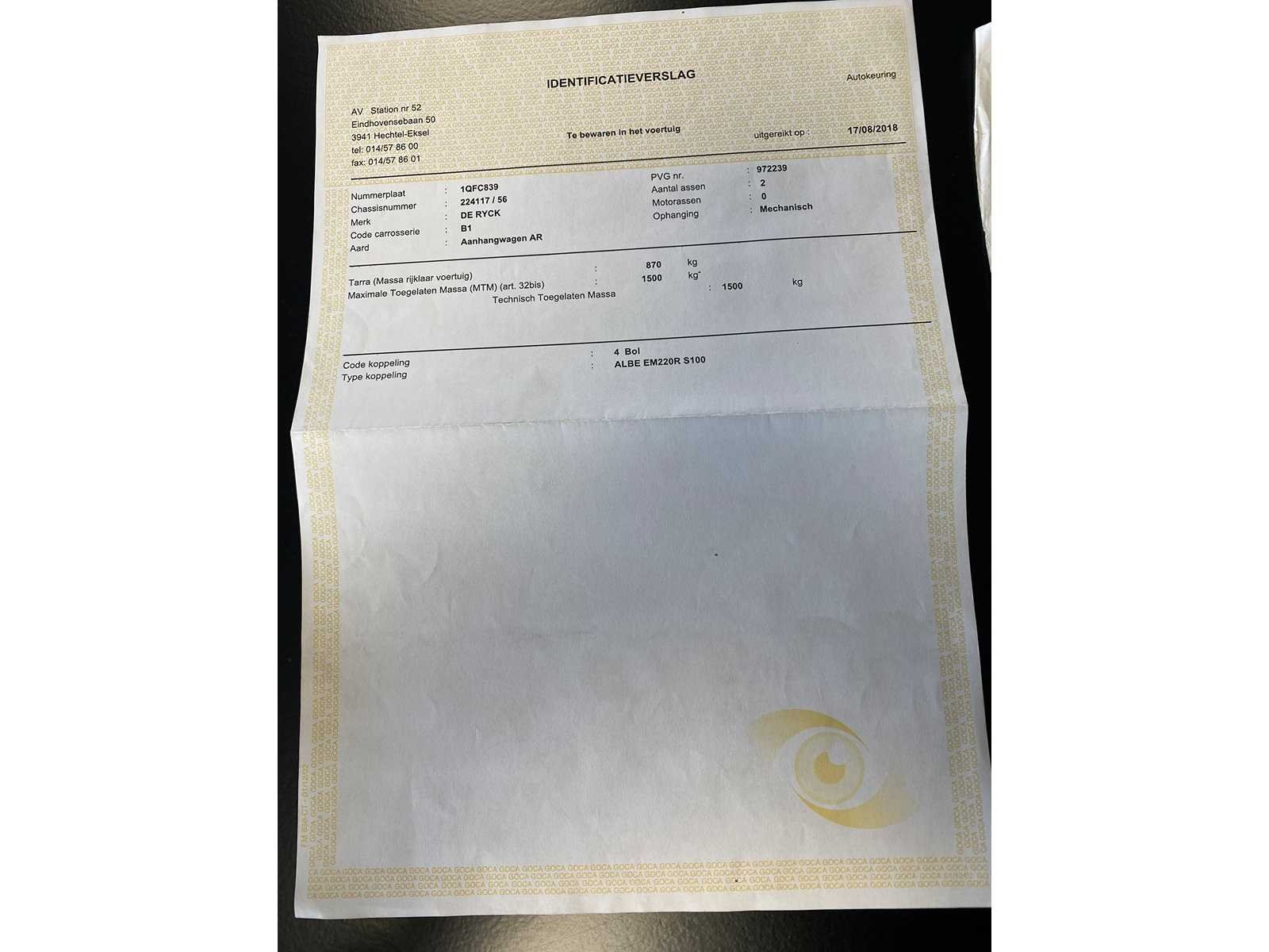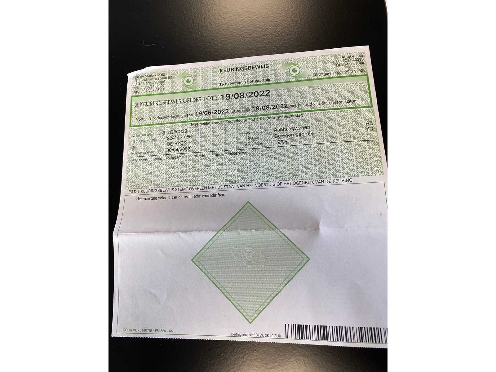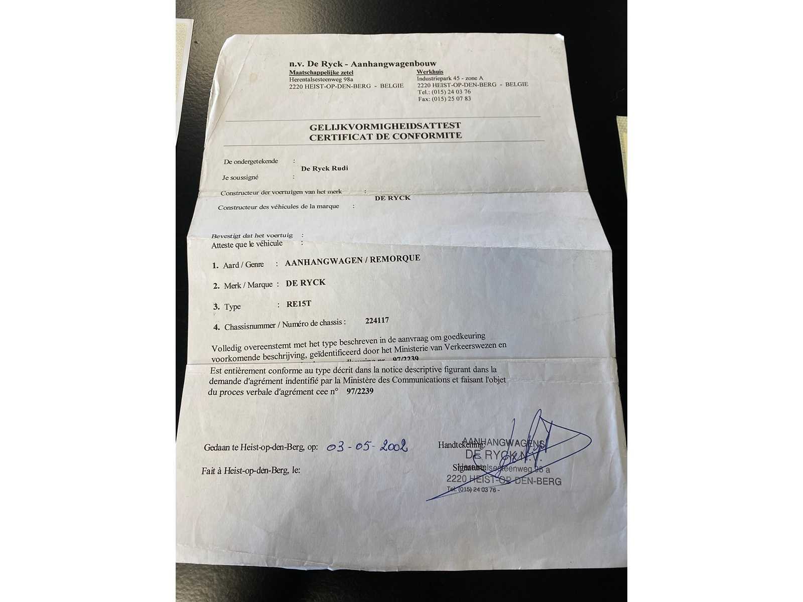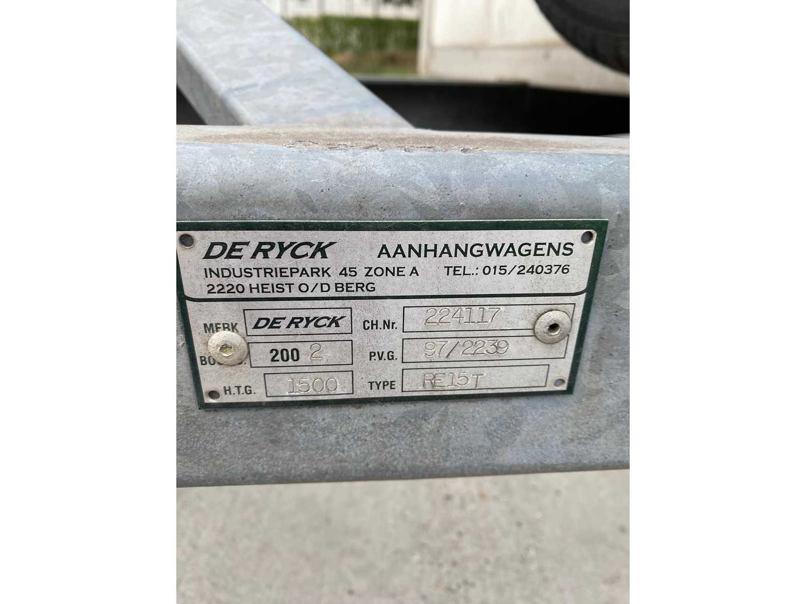 De Ryck trailer Eerste inschrijving: 30/04/2002 Nuttige lengte: 330cm Nuttige breedte: 157cm Nuttige hoogte: 147cm Dakdrager Neuswiel 13-polige stekker Rechterwand niet goed banden OK Papieren AANWEZIG No Merk: De Ryck Type: RE15T Bouwjaar: 2002 Serienummer: 224117 Kenteken: 1QFC839 Opslagcapaciteit: 7,6m³ Laadvermogen: 630kg Eigen gewicht: 870kg Totaal max. gewicht: 1500t Laadhoogte: 0,53m Totale afmeting L: 4800mm Totale afmeting Breedte: 2070mm Totale afmeting Hoogte: 2000mm Leveringsvoorwaarden: Niet gefundeerd - onverpakt