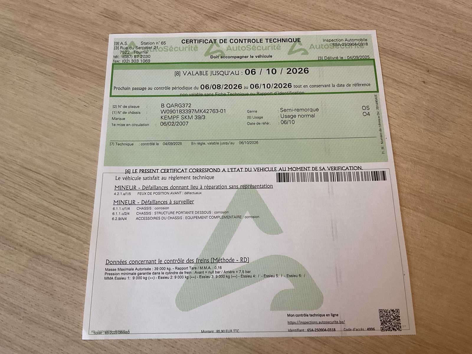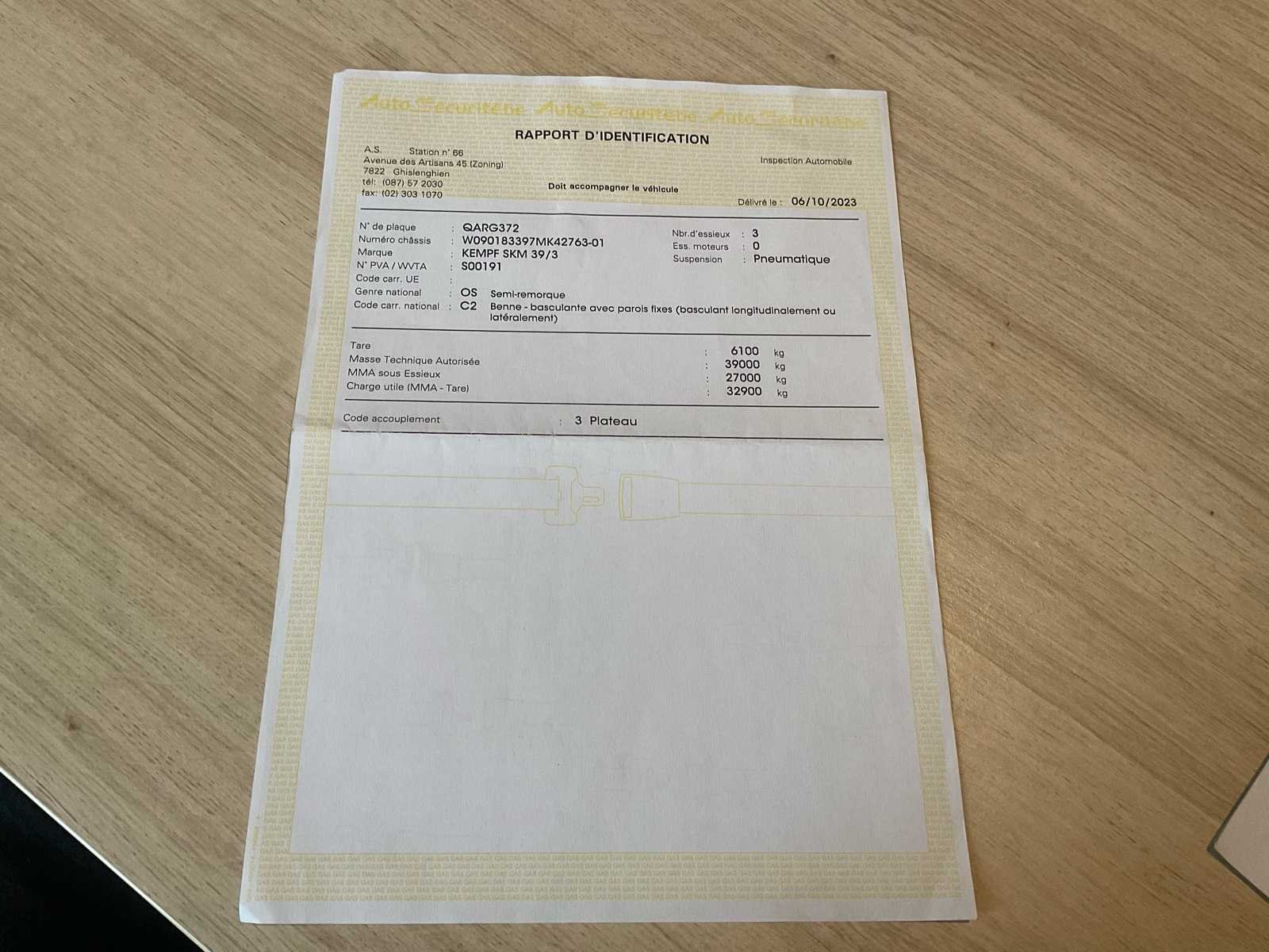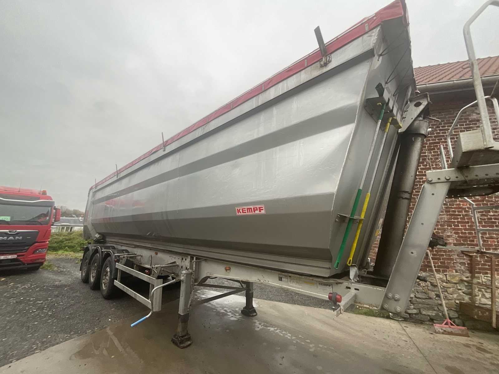 Kempf SKM 39/3 aluminium kipper oplegger – 50 M3 Kempf SKM 39/3 aluminium kipper oplegger, in goede algemene staat. Robuust model, ideaal voor het vervoeren van zware materialen (aarde, puin, asfalt, etc.). Gegalvaniseerd chassis met luchtvering en WABCO EBS elektronisch remsysteem. De kipper is uitgerust met een cilinder aan de voorkant, een rood handzeil, een platform aan de voorkant met toegangsladder en complete hydraulische en elektrische aansluitingen (ISO 7638 + ISO 12098 dozen). Nieuwe schijf en pad Nieuw zeildoek Wassysteem 100 l No Merk: KEMPF Type: SKM 39/3 Bouwjaar: 2007 Serienummer: W090183397MK42763