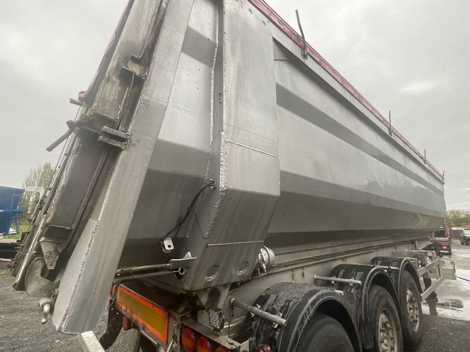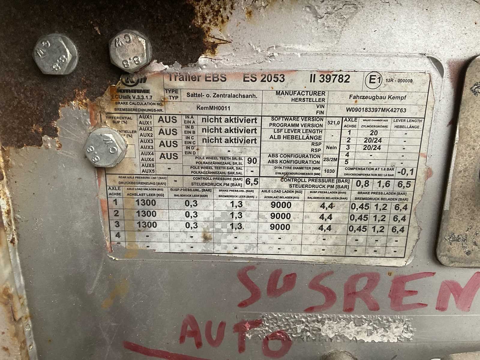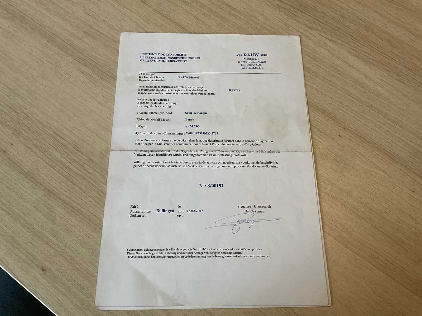 Kempf SKM 39/3 aluminium kipper oplegger – 50 M3 Kempf SKM 39/3 aluminium kipper oplegger, in goede algemene staat. Robuust model, ideaal voor het vervoeren van zware materialen (aarde, puin, asfalt, etc.). Gegalvaniseerd chassis met luchtvering en WABCO EBS elektronisch remsysteem. De kipper is uitgerust met een cilinder aan de voorkant, een rood handzeil, een platform aan de voorkant met toegangsladder en complete hydraulische en elektrische aansluitingen (ISO 7638 + ISO 12098 dozen). Nieuwe schijf en pad Nieuw zeildoek Wassysteem 100 l No Merk: KEMPF Type: SKM 39/3 Bouwjaar: 2007 Serienummer: W090183397MK42763