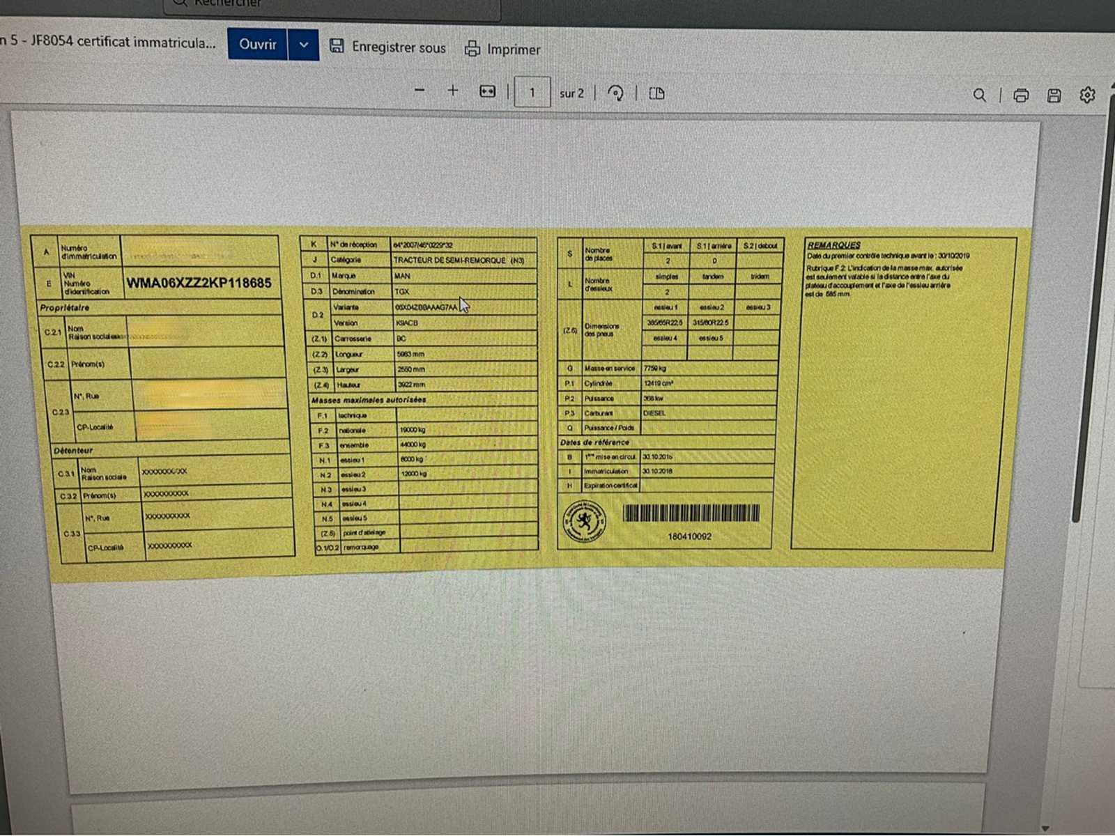 Het voertuig is altijd door Man gevolgd en heeft nog tot het einde van dit jaar een onderhoudscontract Nee Merk: MAN Type: TGX 18.500 Bouwjaar: 2018 Chassisnummer VIN: WMA06XZZ2KP118685 Cilinderinhoud: 12419cc APK vervaldatum: 03.10.2026 Datum eerste toelating: 30/10/2018 Slaapcabine: true Navigatie: true Eigen gewicht: 7759kg Totale afmeting L: 5983mm Totale afmeting Breedte: 2550mm Totale afmeting Hoogte: 3922mm Afgelezen kilometerstand: 582853.1km Nationaliteit documenten: Luxembourgeoise Kentekenpapieren compleet?: true Aantal zitplaatsen: 2 Automaat: true Diesel: true