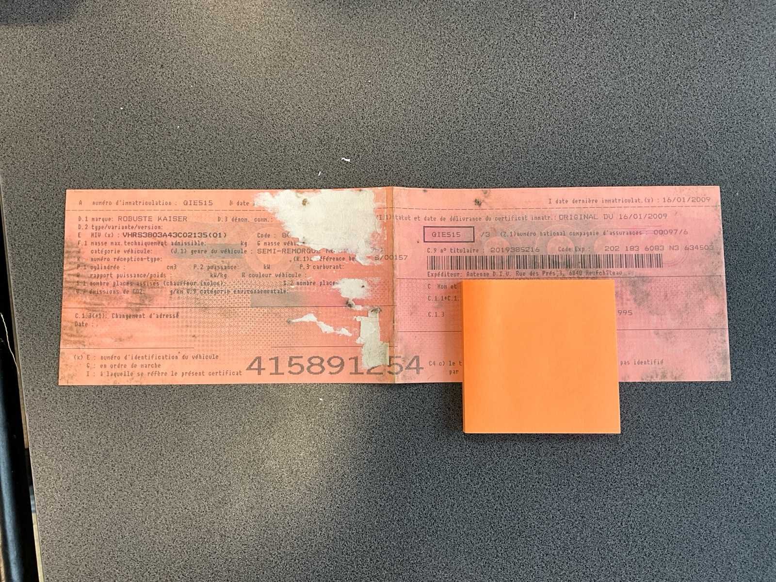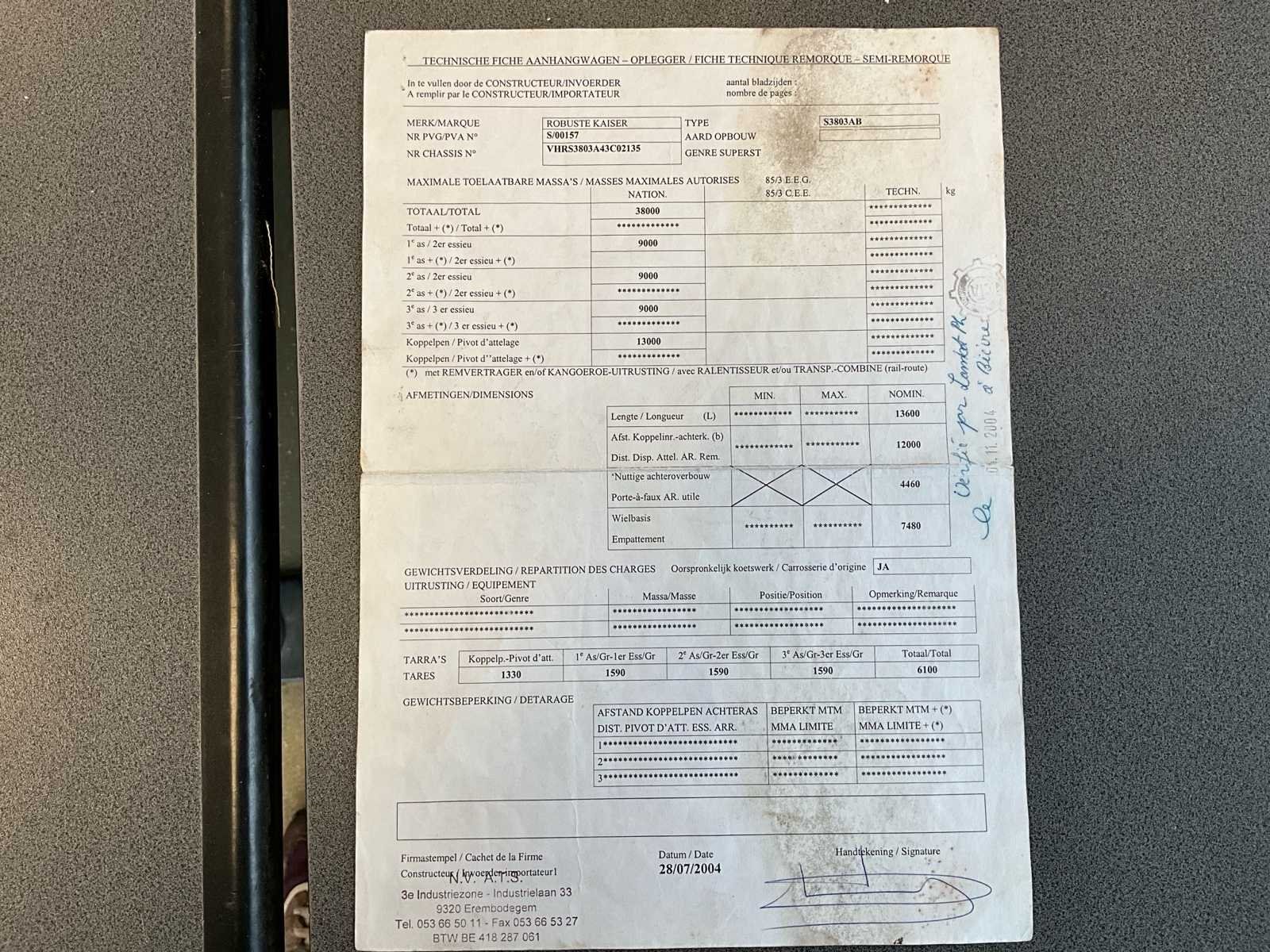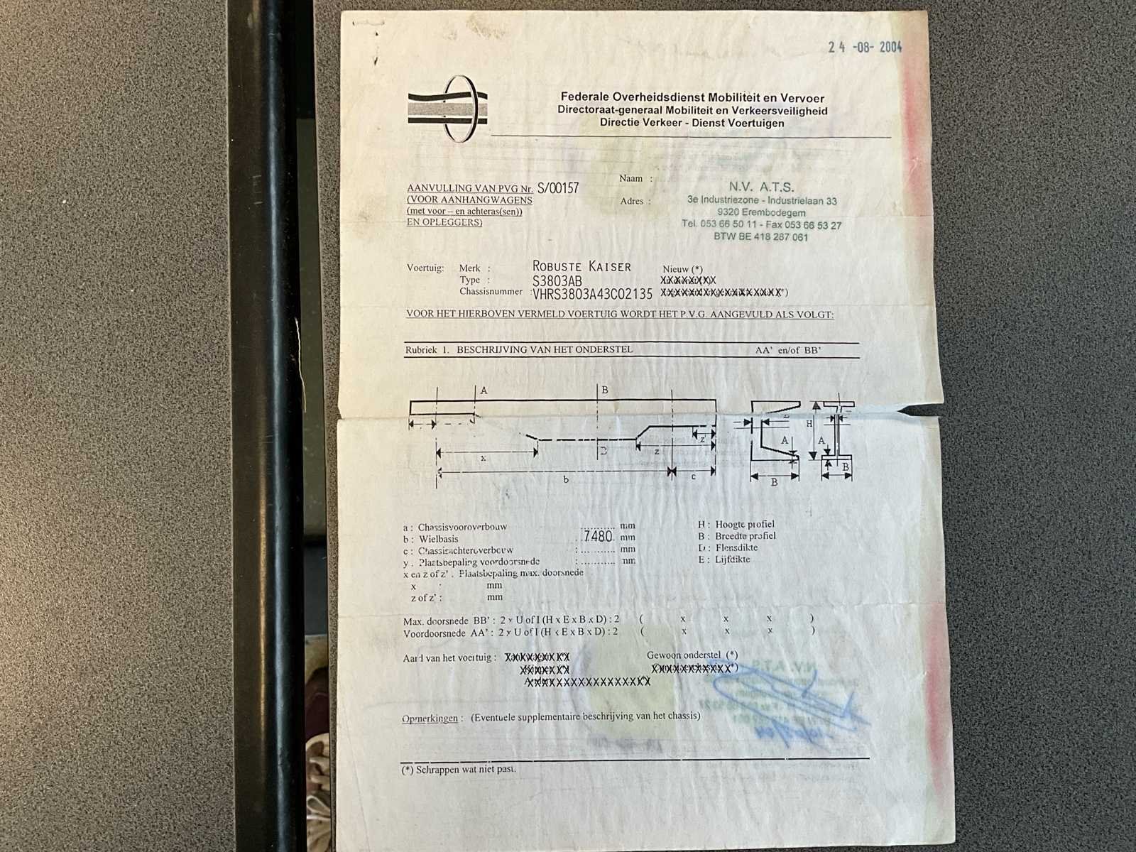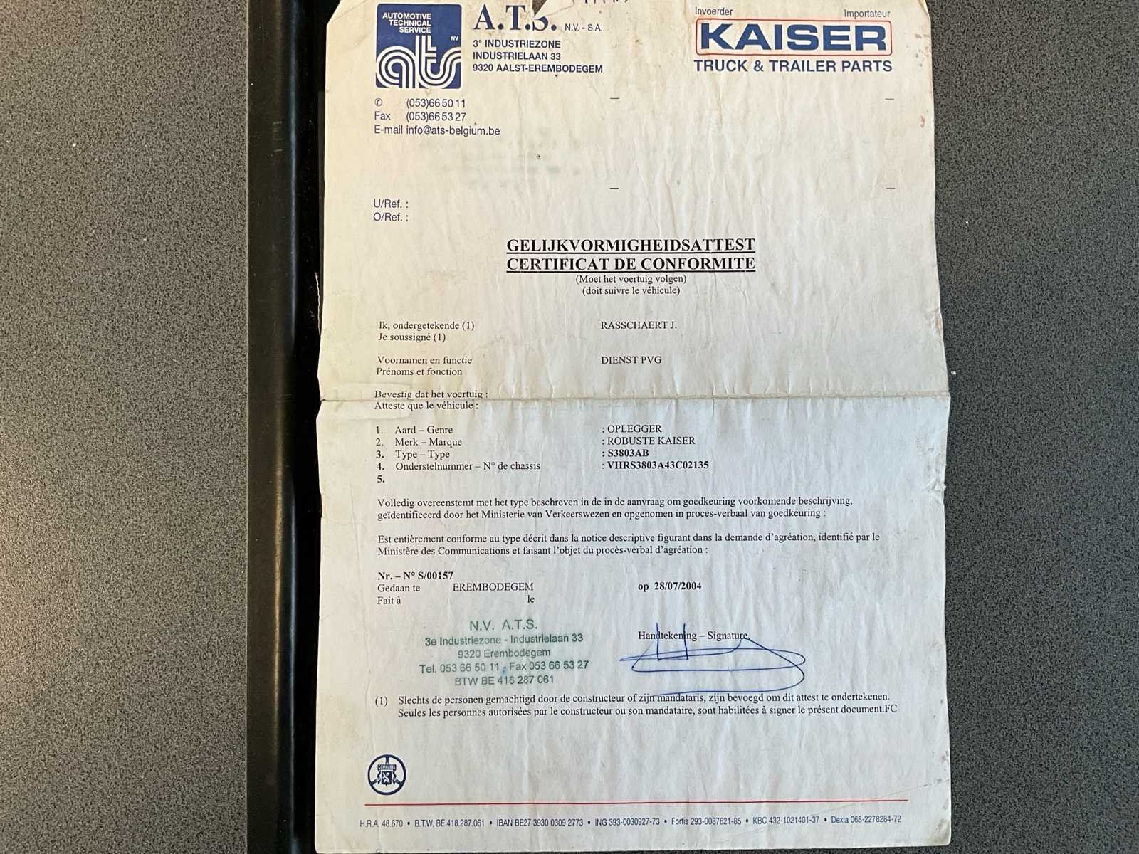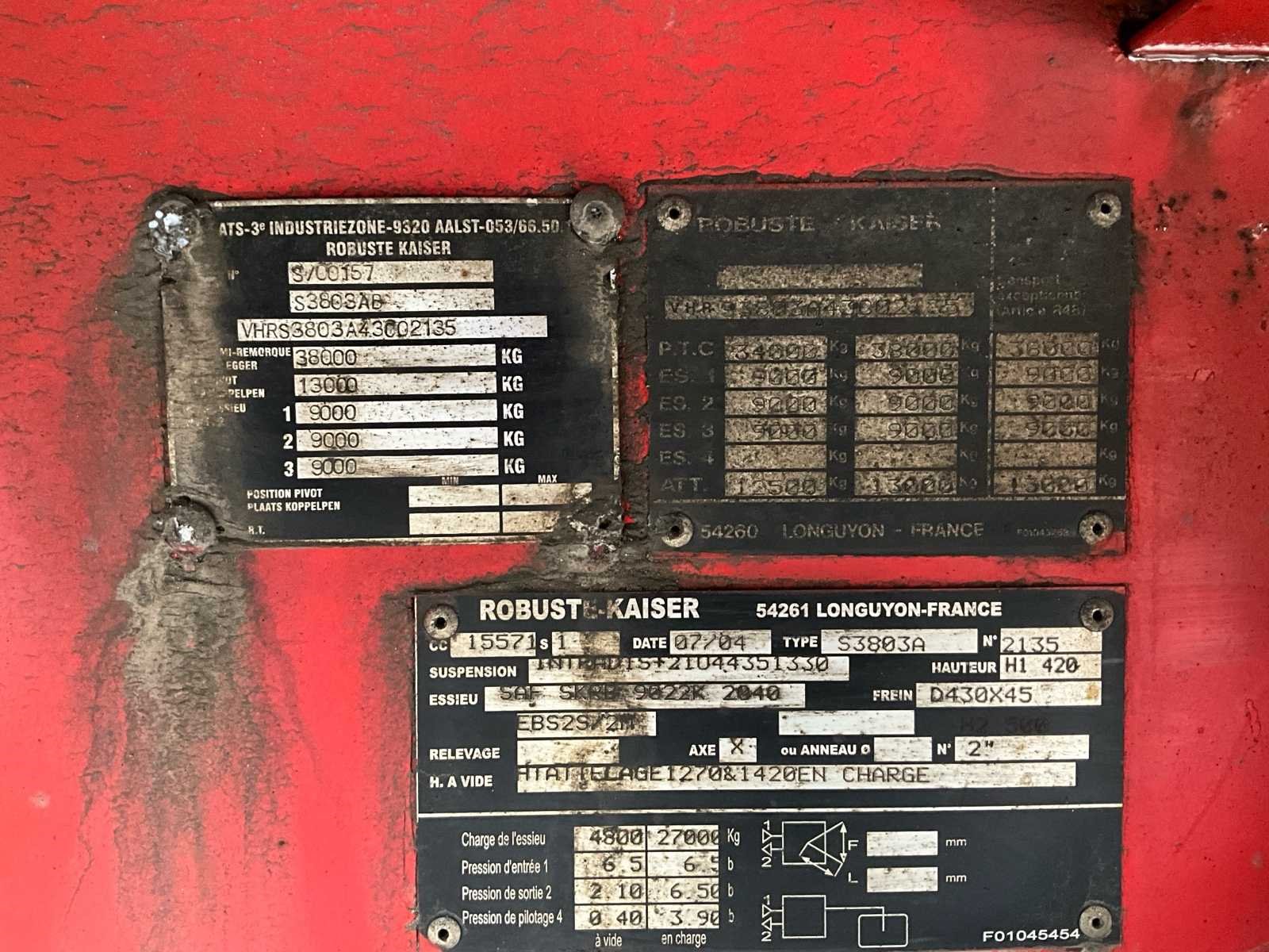 No Merk: Robuste-Kaiser Type: S3803A Type aanhangwagencarrosserie: Plateauwagen Bouwjaar: 2004 Chassisnummer VIN: VHR3803A30C2135 Laadvermogen: 25600kg