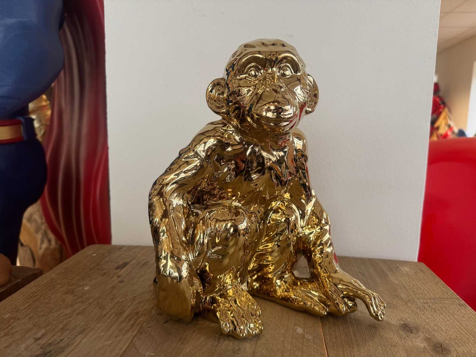 Aap / Monkey chrome gold H29cm Stockverkoop wegens stopzetting activiteiten!!! No Hoogte: 29 Materiaal: Keramiek Leveringsvoorwaarden: Niet gefundeerd - onverpakt