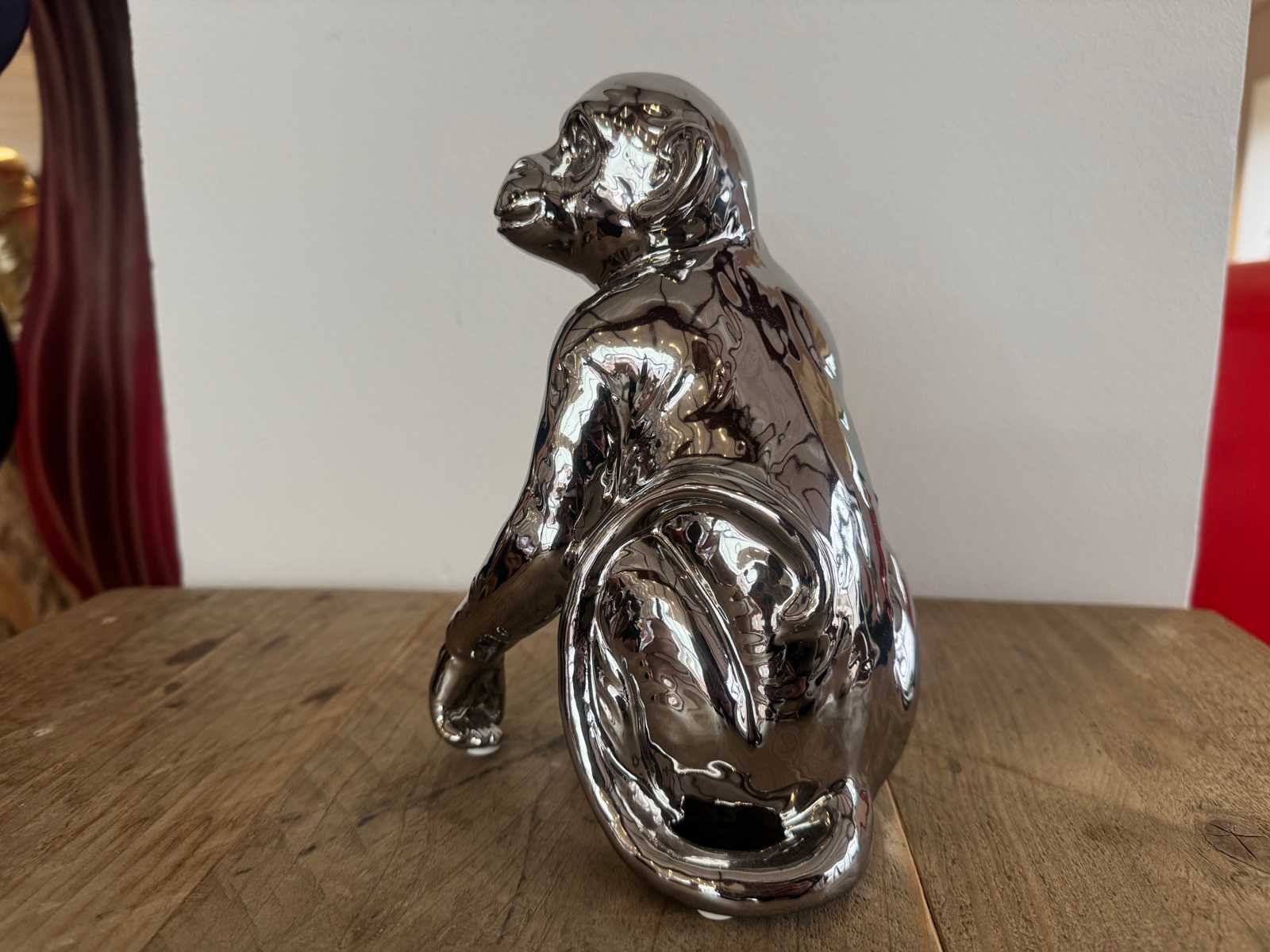 Aap / Monkey chrome silver H21cm Stockverkoop wegens stopzetting activiteiten!!! No Hoogte: 21 Materiaal: Keramiek Leveringsvoorwaarden: Niet gefundeerd - onverpakt