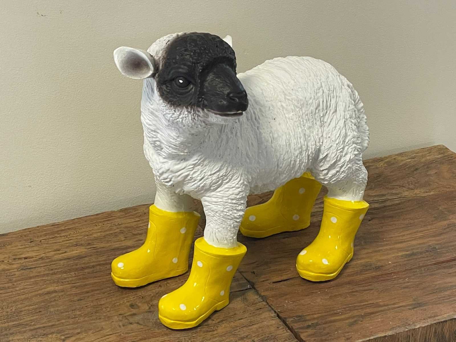 Lammetje met gele botjes H33cm x L30cm Polyester / Polystone Stockverkoop wegens stopzetting activiteiten!!! No Hoogte: 33 Materiaal: Polyester Leveringsvoorwaarden: Niet gefundeerd - onverpakt