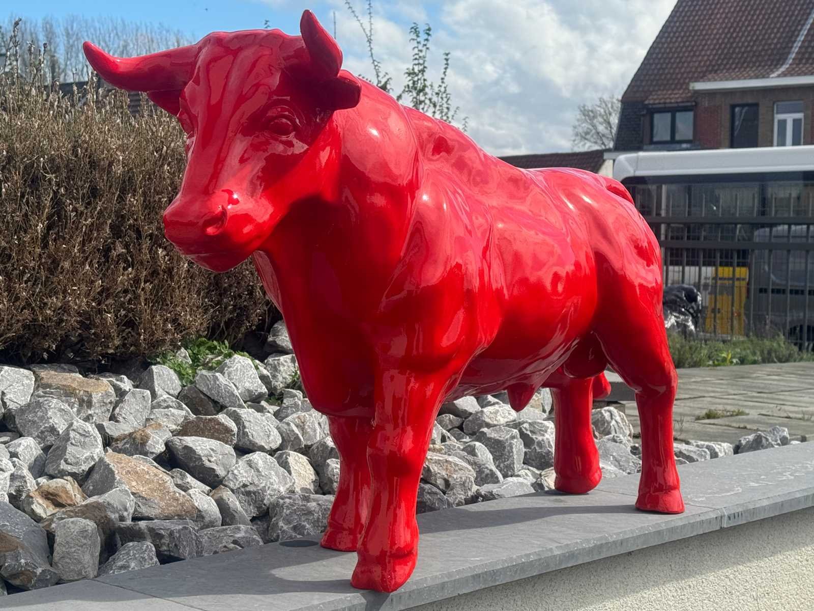 Stier Rood H69cm x L110cm Polyester / Polystone Stockverkoop wegens stopzetting activiteiten!!! No Lengte: 110 Hoogte: 69 Materiaal: Polyester Leveringsvoorwaarden: Niet gefundeerd - onverpakt