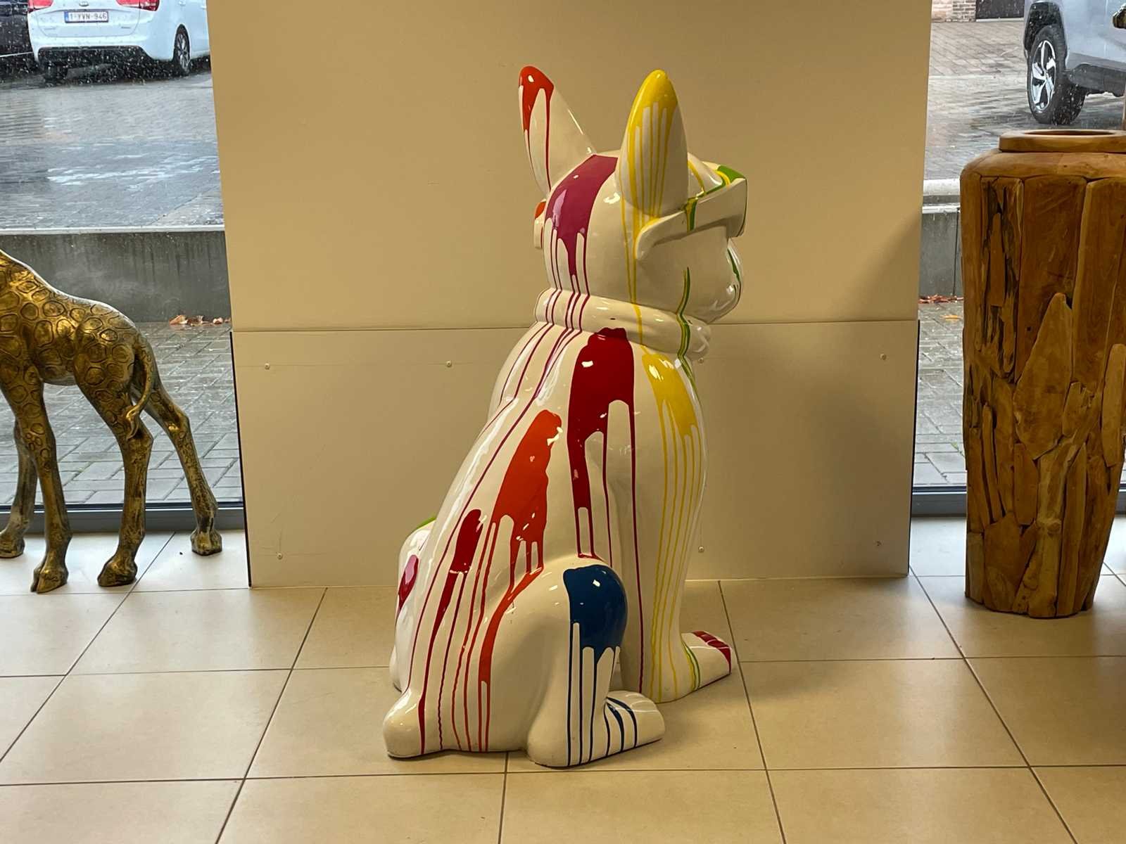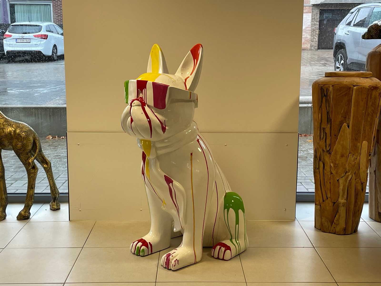 Franse Bulldog met Bril Wit Trash Hoogte 120cm Polyester Stockverkoop wegens stopzetting activiteiten!!! No Hoogte: 120 Materiaal: Polyester Leveringsvoorwaarden: Niet gefundeerd - onverpakt