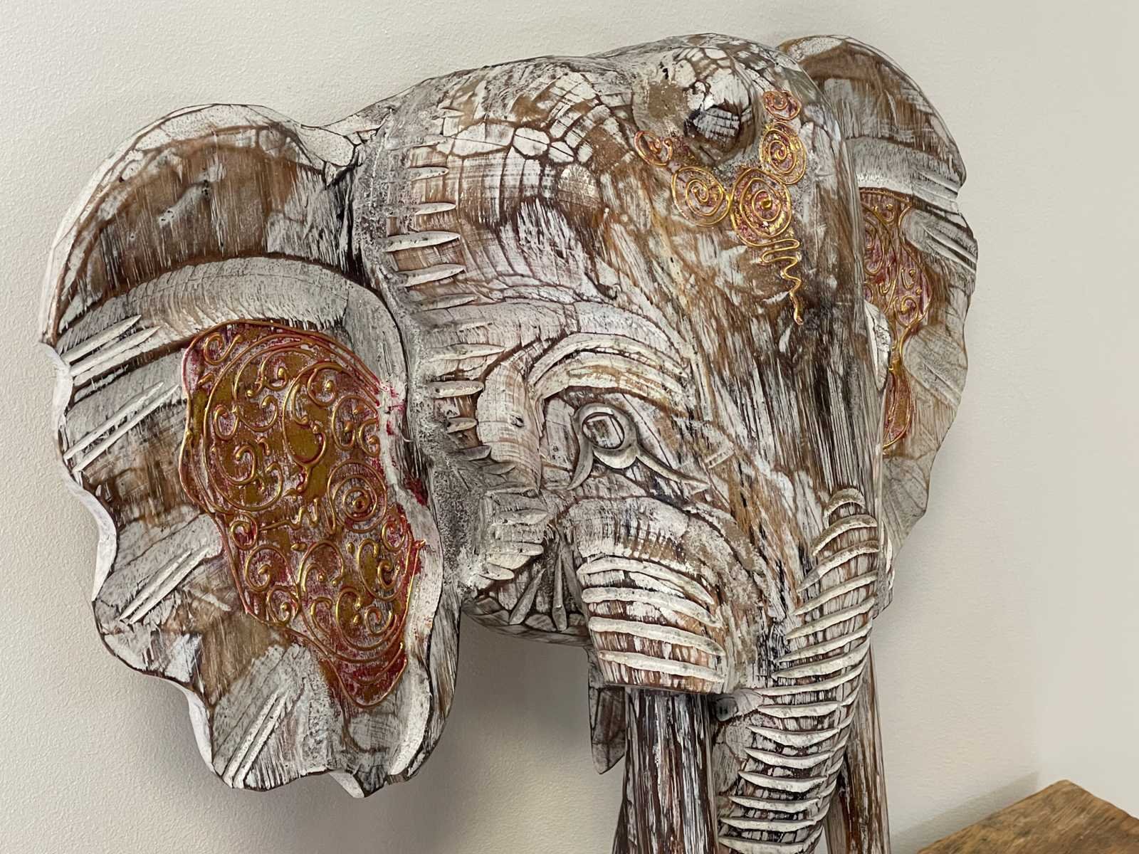 Olifantenkop in hout H48cm Wit/Goud Stockverkoop wegens stopzetting activiteiten!!! No Hoogte: 48 Materiaal: Hout Leveringsvoorwaarden: Niet gefundeerd - onverpakt