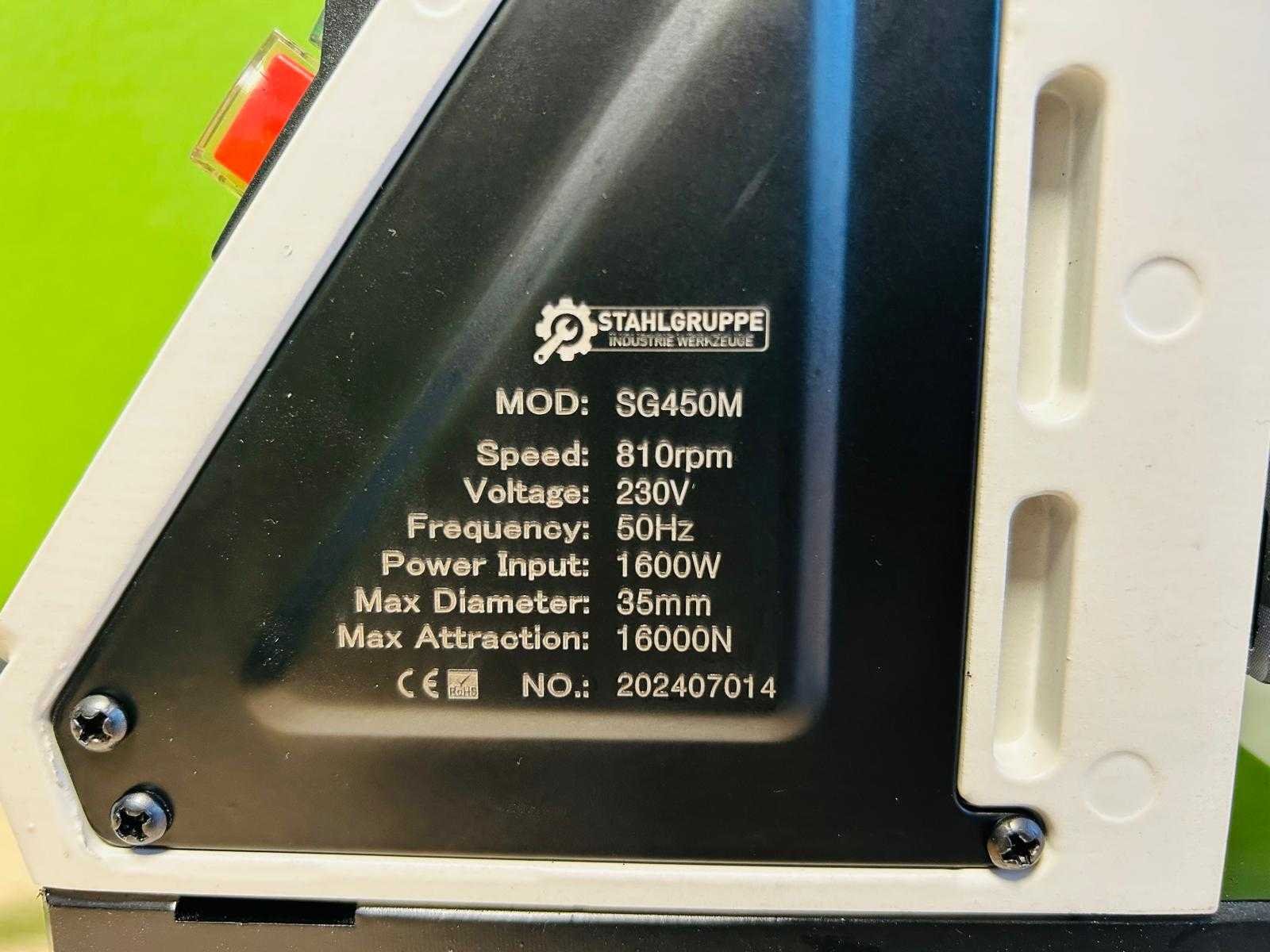 Automatisch koelsysteem; ongebruikt; 3591; Nee Merk: Stahlgruppe Type: SG450M Bouwjaar: 2025 Boorcapaciteit: 35mm Boordiepte: 210mm Snelheid van n =: 810rpm Snelheid tot n =: 810rpm Kleefkracht: 16000N Vermogen: 1.6kW Aansluiting: 230V Met koffer: true