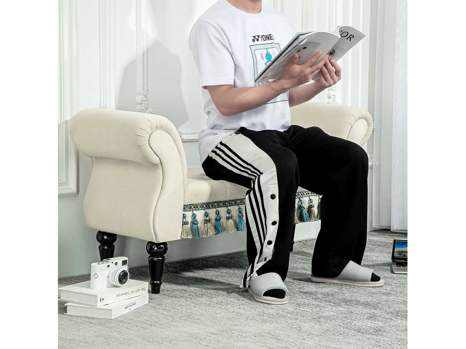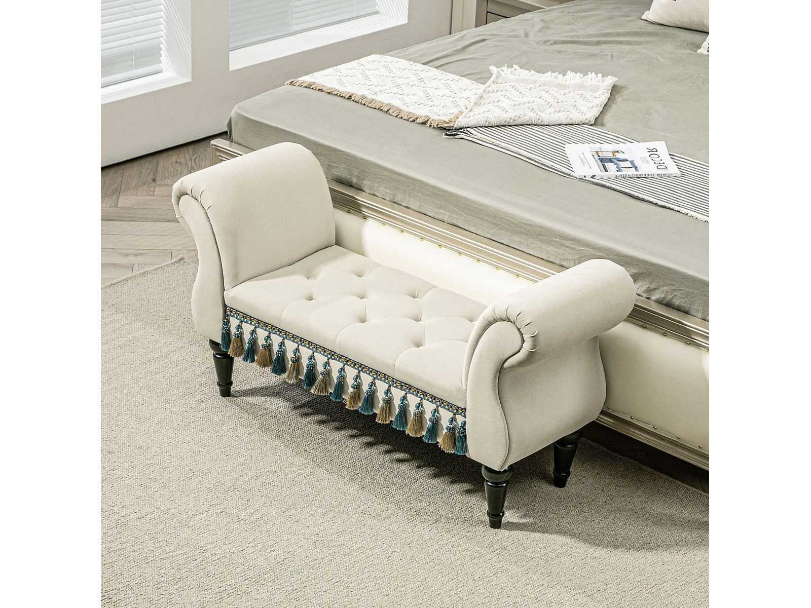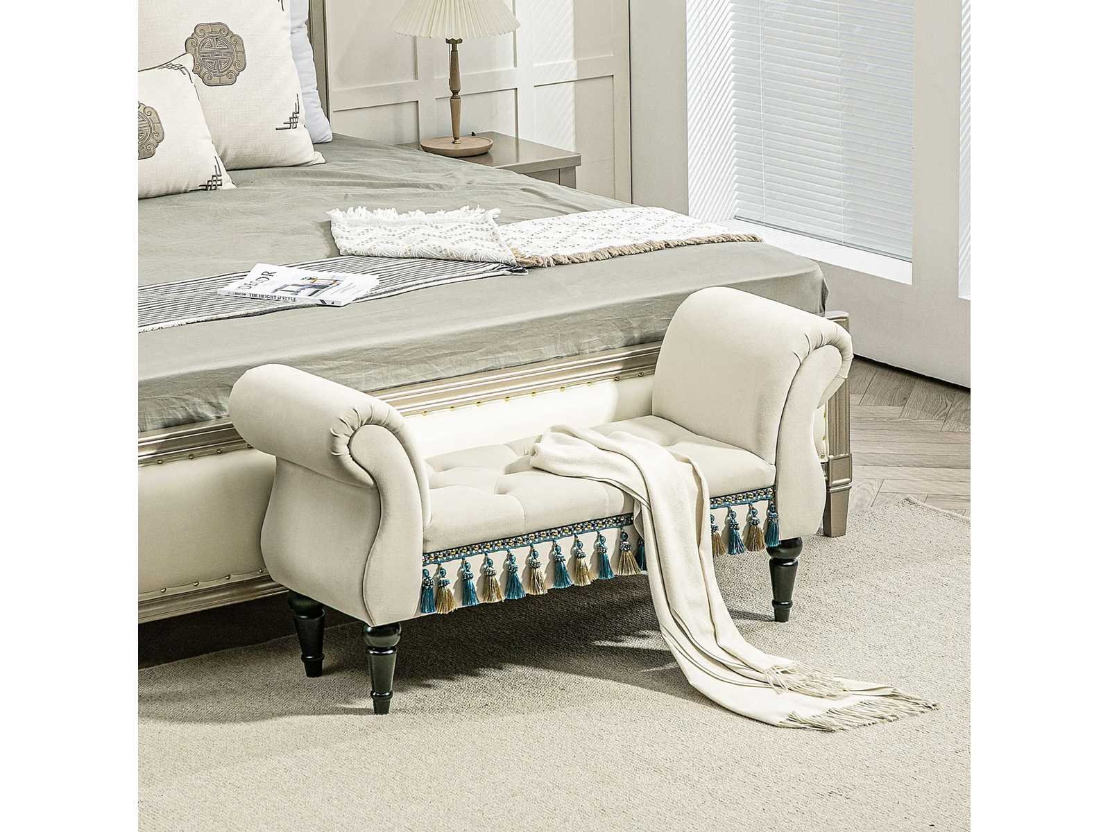 Specificaties: - Kleur: Beige - Materialen: Fluweel (100% polyester), rubberhout, schuim - Totale afmetingen: 117B x 40D x 58H cm - Afmetingen zitting: 71B x 40D cm - Zithoogte: 42,5 cm - Hoogte poot: 19 cm - Hoogte armleuning (bij de zitting): 58 cm - Draagvermogen: 150 kg Non