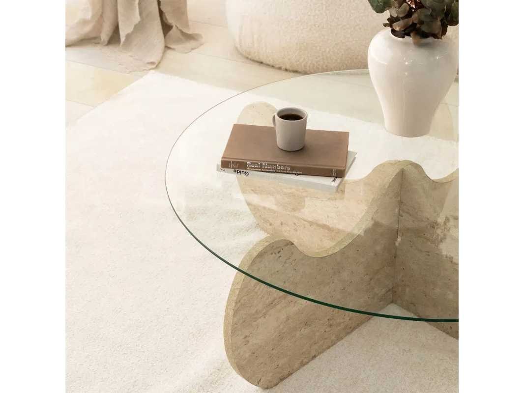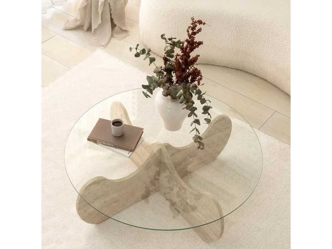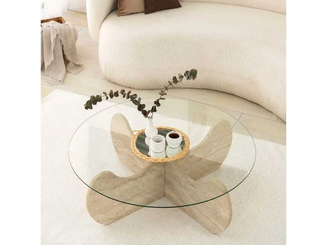 Type: Salontafel. Materiaal oppervlak: Travertijn. Materiaal blad: 100% glas. Materiaal blad: 100% glas. Basismateriaal: 100% melamine spaanplaat. Dikte van het blad: 18 mm. Doorsnede: 90 cm. Hoogte: 30 cm. Non