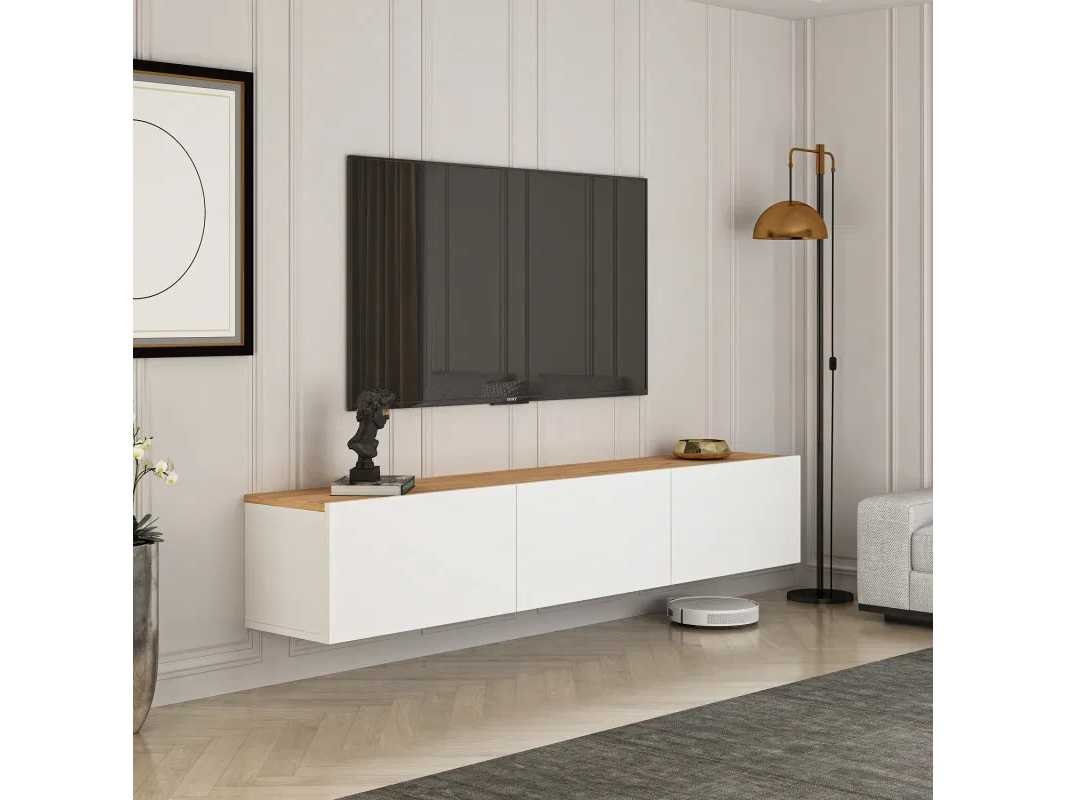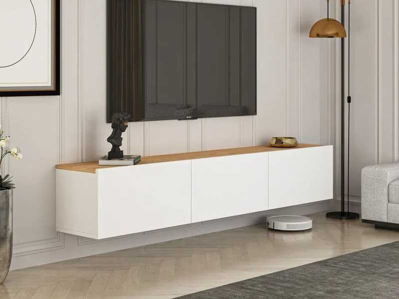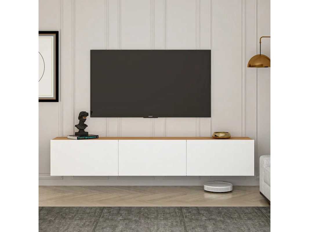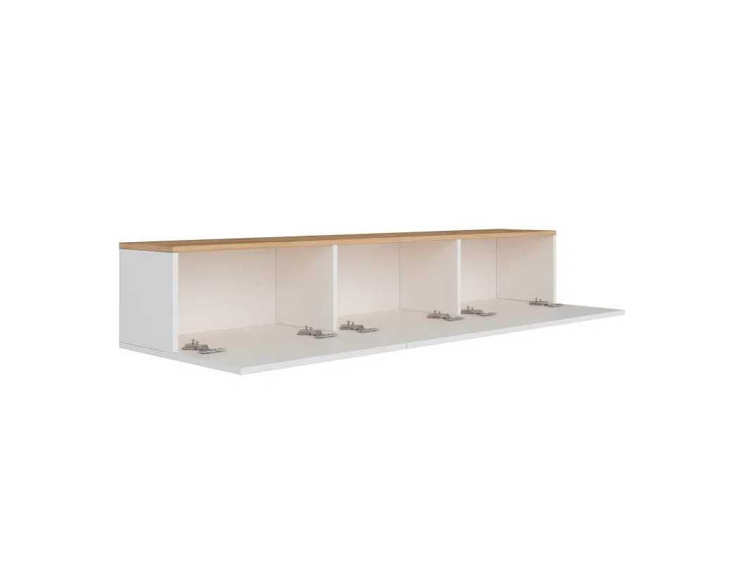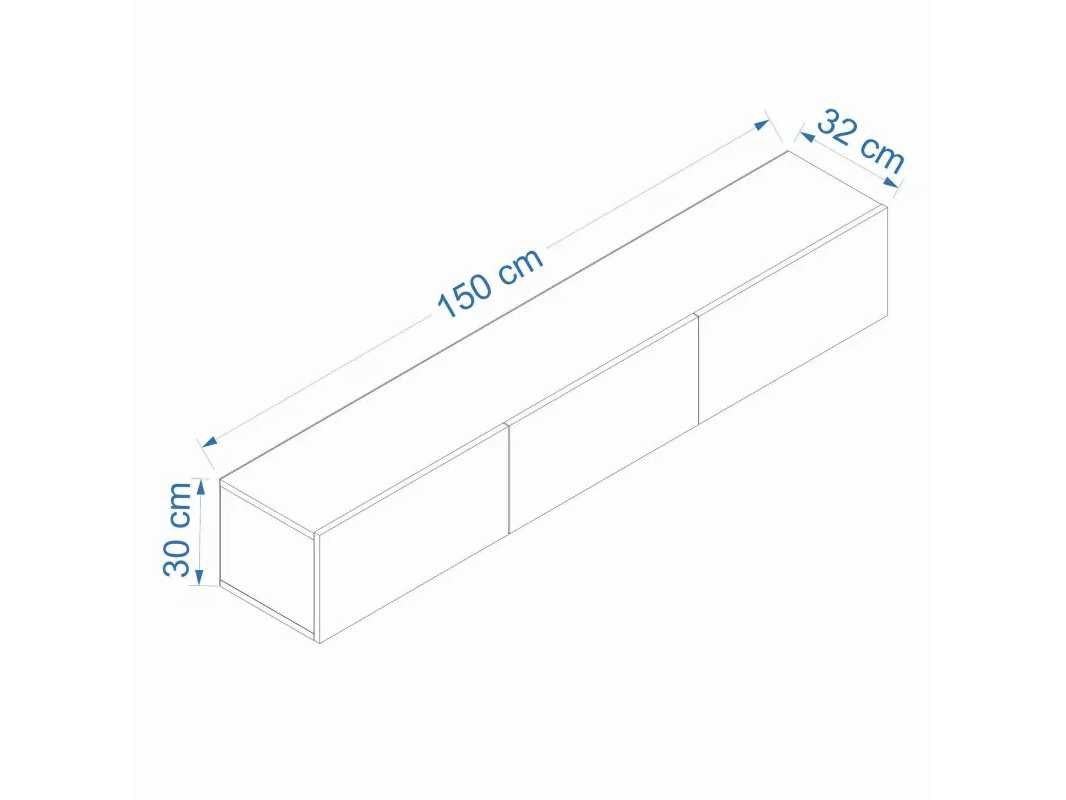 Type meubel: TV-meubel. Kleuren: wit en Atlantische den. Materiaal: 100% melamine spaanplaat. Breedte: 150 cm. Hoogte: 30 cm. Diepte: 32 cm. Non