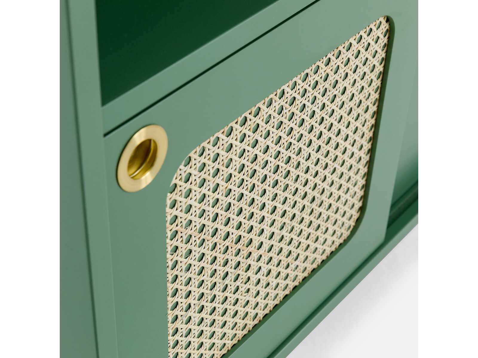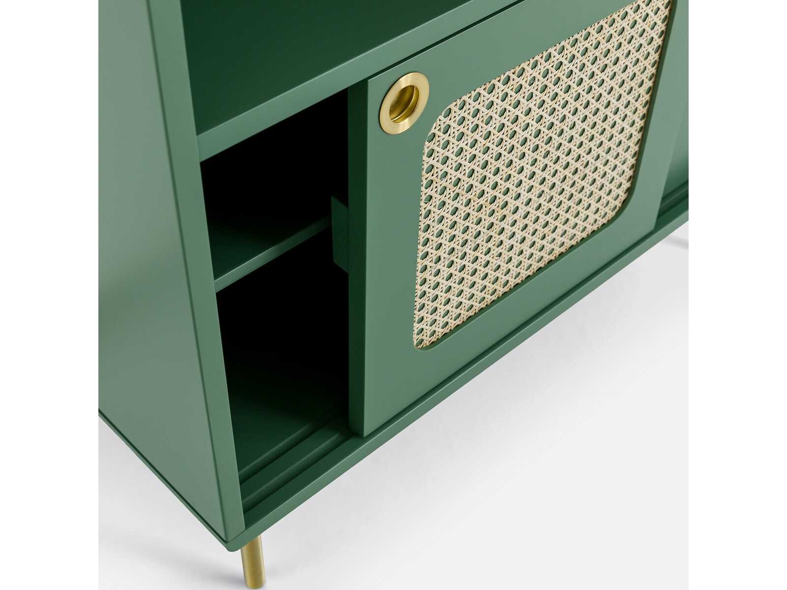 Beschrijving • MDF-structuur met acrylafwerking op waterbasis • 2 planken + 2 schuifdeuren • 1 deur met rieten detail • 1 plank aan de binnenkant • Mat geborsteld metalen onderstel en handgrepen Grootte • Breedte: 76 cm • Hoogte: 126 cm • Diepte: 38 cm Non