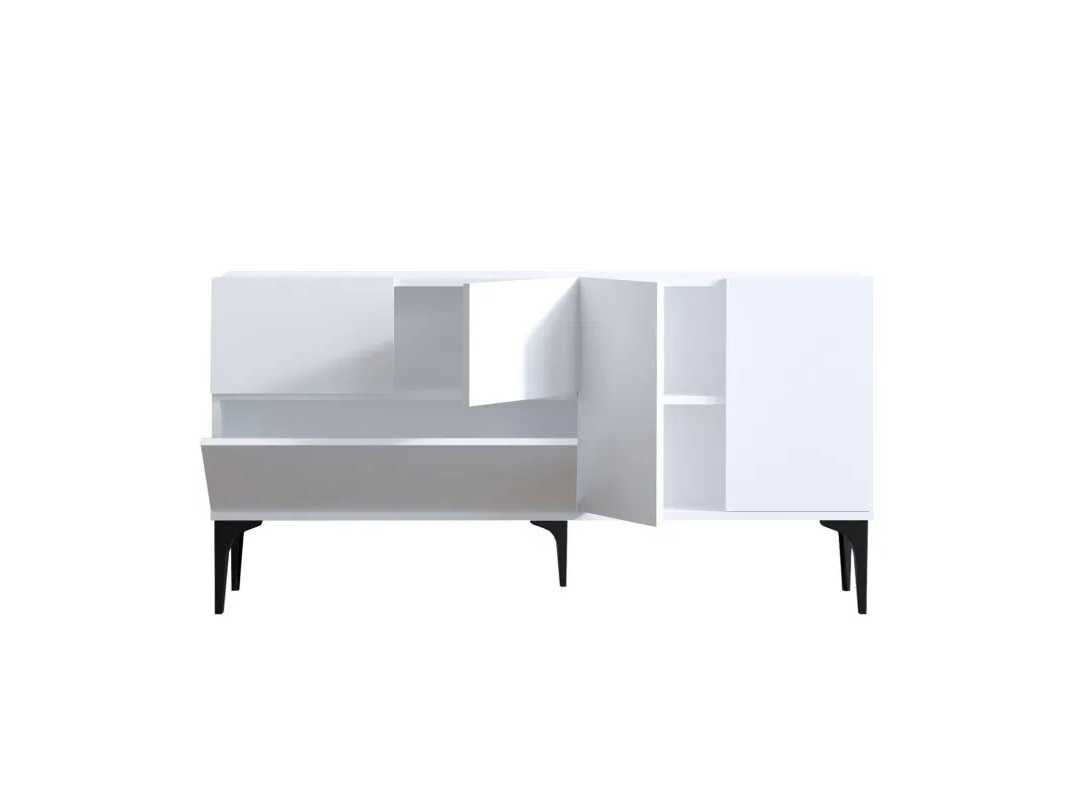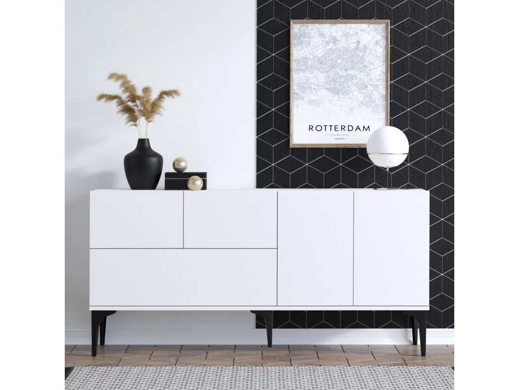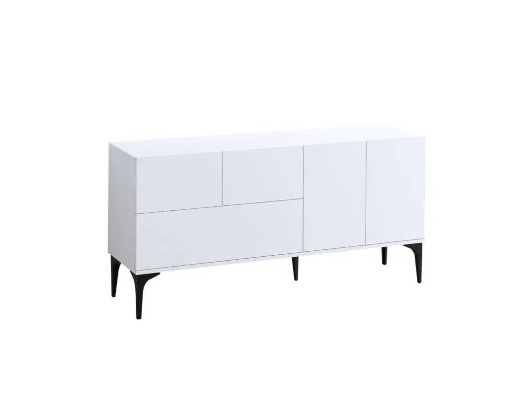 Melamine dressoir met witte afwerking. Hij is 150 cm breed, 75 cm hoog en 35 cm diep. De poten zijn 25 cm hoog. Non