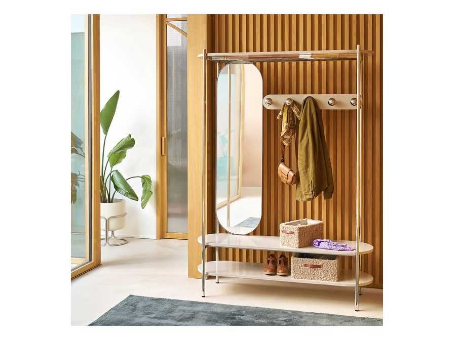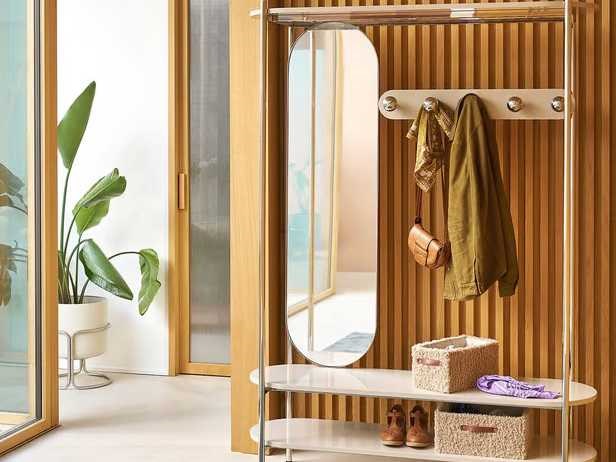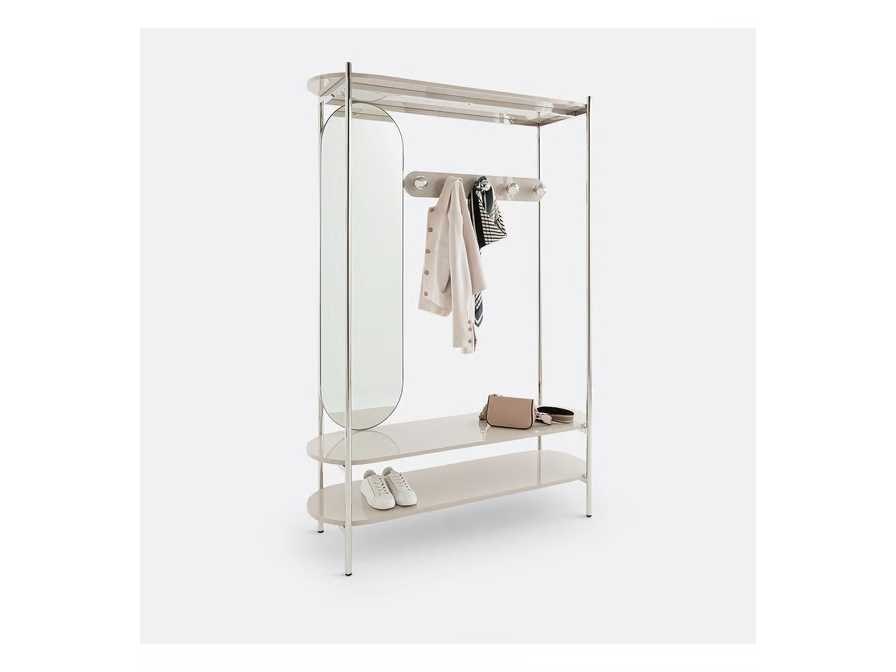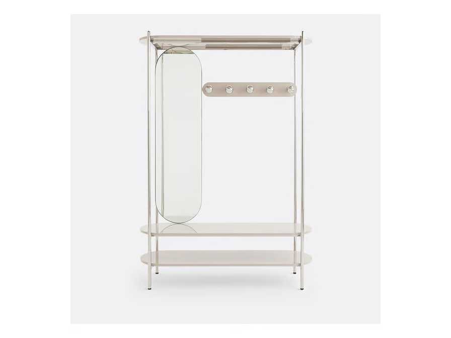 Beschrijving • Gepolijst roestvrijstalen frame en haken • Kapstok, planken en bank in gelakt MDF met polyurethaan afwerking • FSC-gecertificeerd® hout • 1 spiegel die rechts of links geplaatst kan worden • 5 bolvormige kapstokhaken • 2 planken (1 aan de bovenkant en 1 aan de onderkant onder de bank) • In hoogte verstelbare poten van polyethyleen • Wandmontagesysteem inbegrepen (schroeven en pluggen niet inbegrepen) Grootte Totaal • Breedte: 134,1 cm • Hoogte: 190 cm • Diepte: 41,5 cm • Gewicht: 48,7 kg Nuttig • Spiegel: B38,6 x H144 cm • Zithoogte: 41 cm Non
