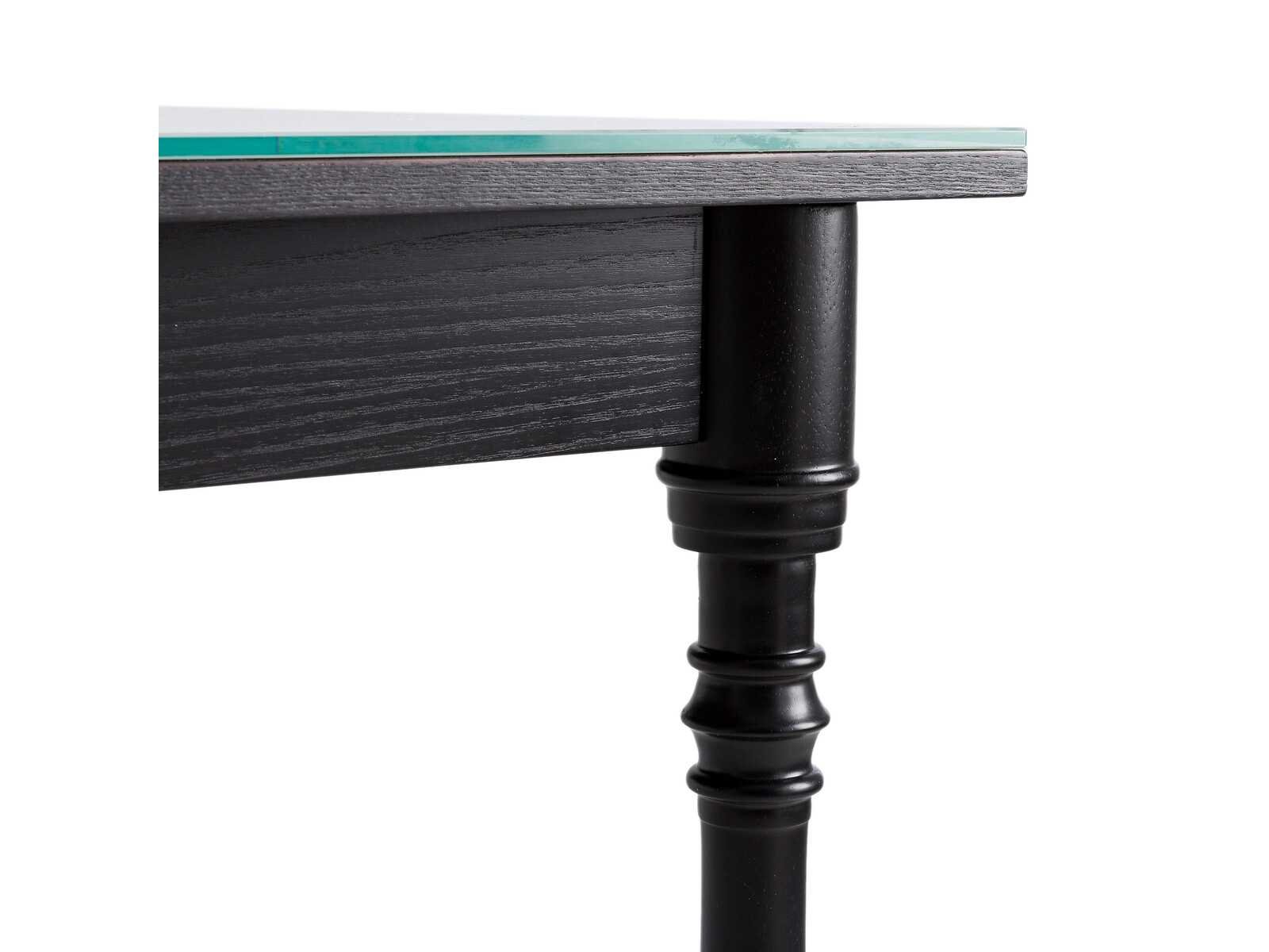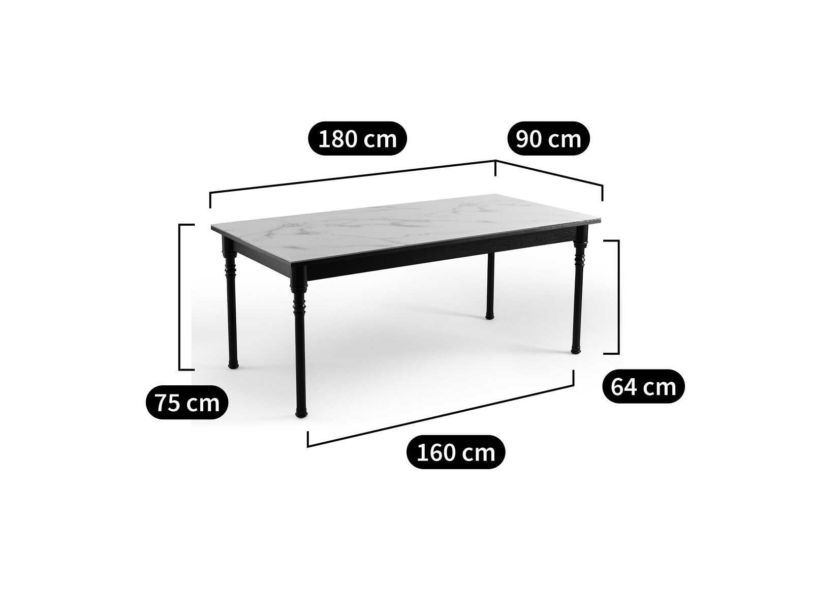 Beschrijving • 6/8 couverts • MDF blad (asvormige rand) bekleed met gehard glas (dikte 8 mm) met witte marmerprint • Massief rubberhout gedraaide poten, essen gefineerde MDF-band. Satijnzwarte verf, afwerking met nitrocellulosevernis Grootte Totaal • Breedte: 180 cm • Hoogte: 75 cm • Diepte: 90 cm Nuttig • Hoogte van vloer tot tailleband: 64 cm • Lengte tussen de voeten: 160 cm • Breedte tussen de poten: 70 cm • Dit product wordt kant-en-klaar verkocht. Afmetingen en gewicht van de verpakking 1 pakket • B191 x H21 x D101 cm. 81,5 kg Non