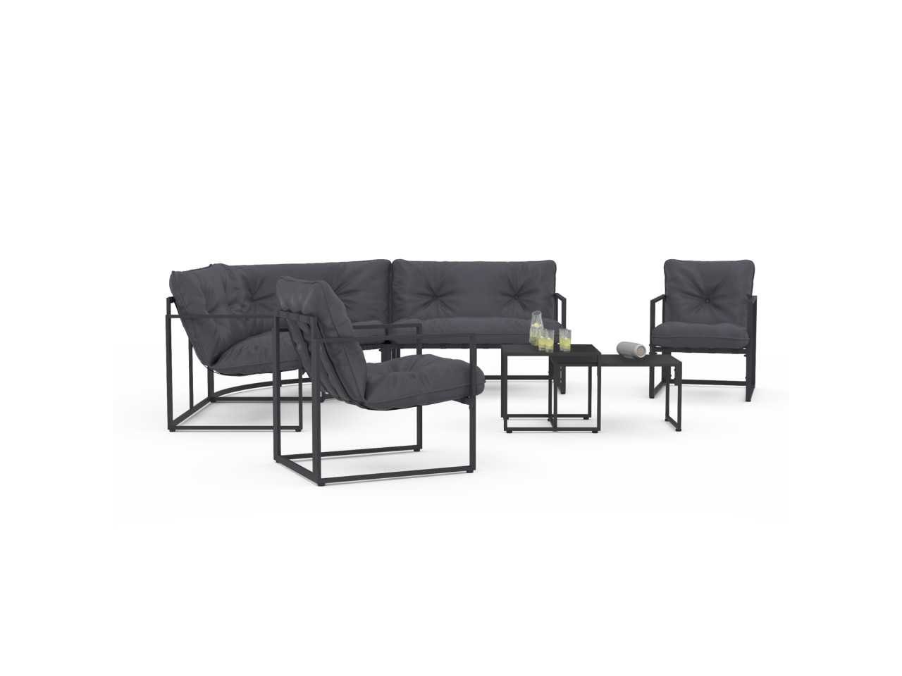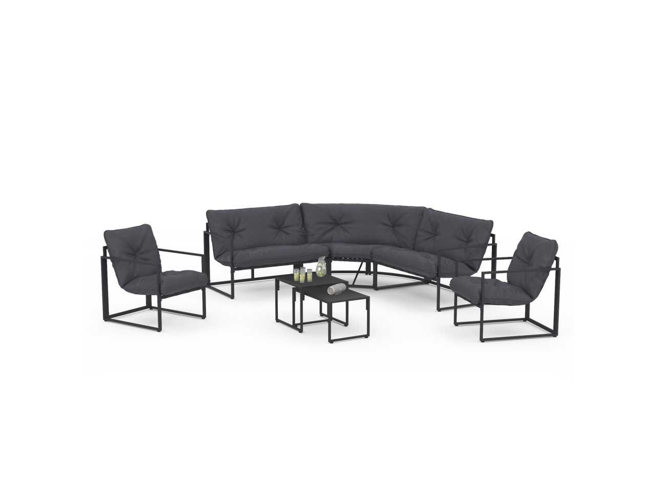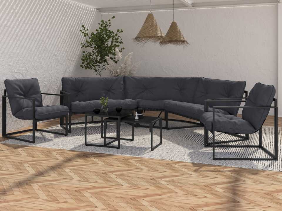 Samenstelling: hoekbank (2x banken + 1x hoekbank), 2x fauteuils, 2x salontafels Materialen: Stalen frame, 180 gr/m² polyester kussens, tafelblad van gehard glas Kleur: antracietgrijs Zelf in elkaar zetten: Ja Aanvullende informatie: Aantal zitplaatsen: 8 Bank: (L) 106 x (B) 70 x (H) 67 cm Hoekbank: (L) 104 x (B) 104 x (H) 67 cm Fauteuils: (L) 60 x (B) 70 x (H) 67 cm Salontafels: (L) 65 x (B) 42 x (H) 35 cm - (L) 48 x (B) 48 x (H) 40 cm Dikte van de kussens: 6 cm Dikte tafelblad: 5 mm Non