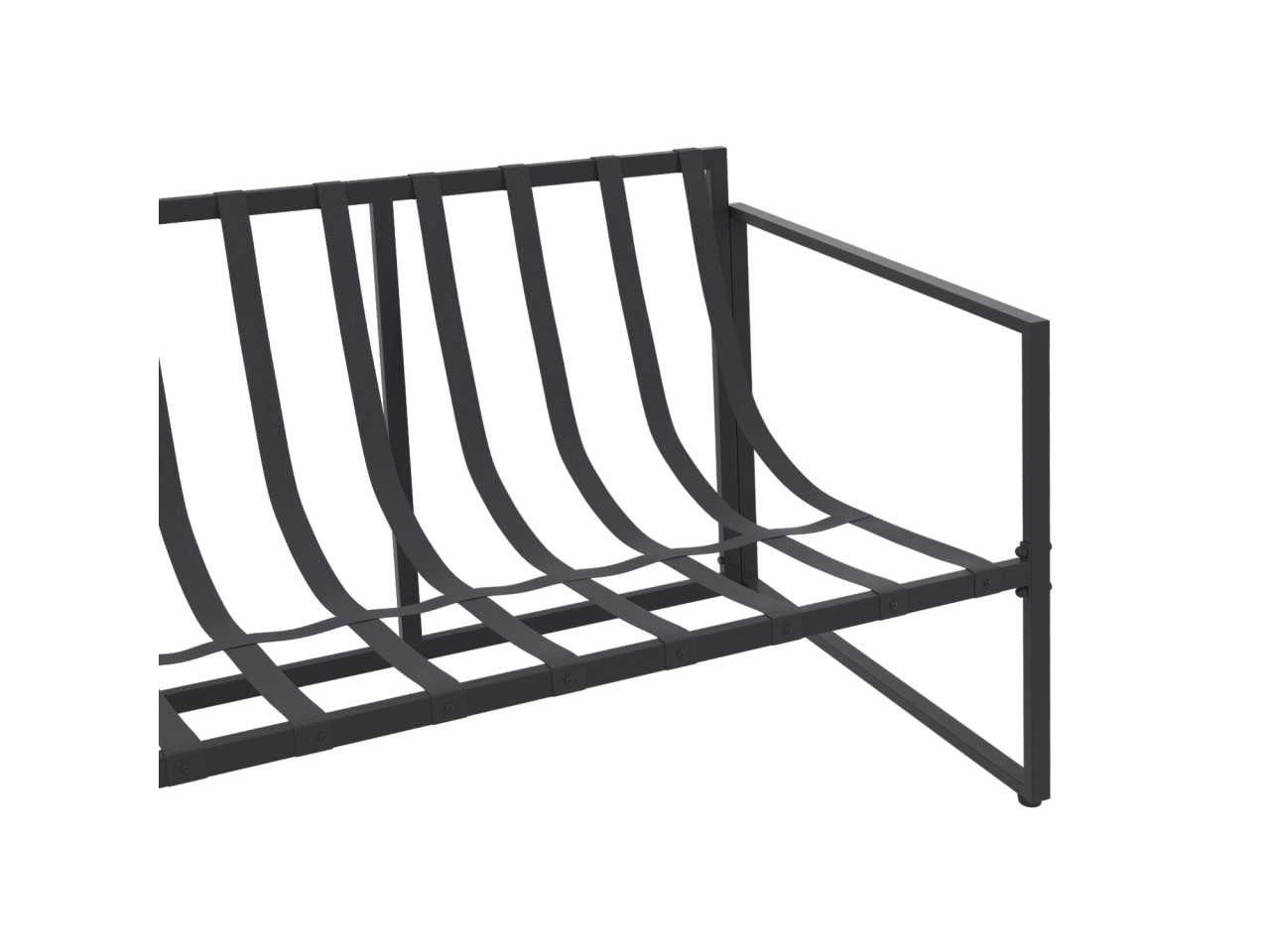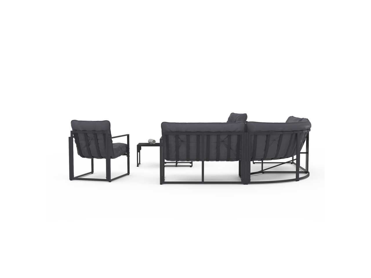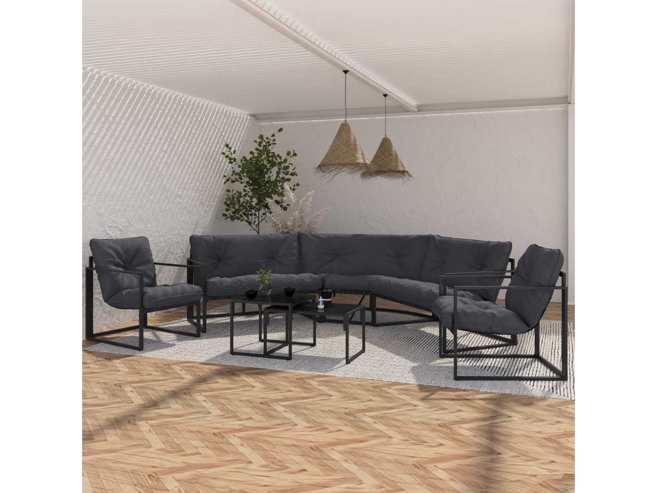 Samenstelling: hoekbank (2x banken + 1x hoekbank), 2x fauteuils, 2x salontafels Materialen: Stalen frame, 180 gr/m² polyester kussens, tafelblad van gehard glas Kleur: antracietgrijs Zelf in elkaar zetten: Ja Aanvullende informatie: Aantal zitplaatsen: 8 Bank: (L) 106 x (B) 70 x (H) 67 cm Hoekbank: (L) 104 x (B) 104 x (H) 67 cm Fauteuils: (L) 60 x (B) 70 x (H) 67 cm Salontafels: (L) 65 x (B) 42 x (H) 35 cm - (L) 48 x (B) 48 x (H) 40 cm Dikte van de kussens: 6 cm Dikte tafelblad: 5 mm Non