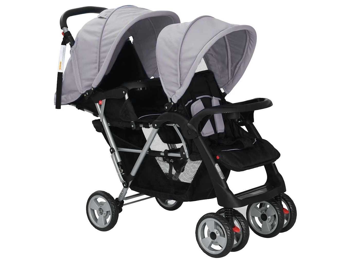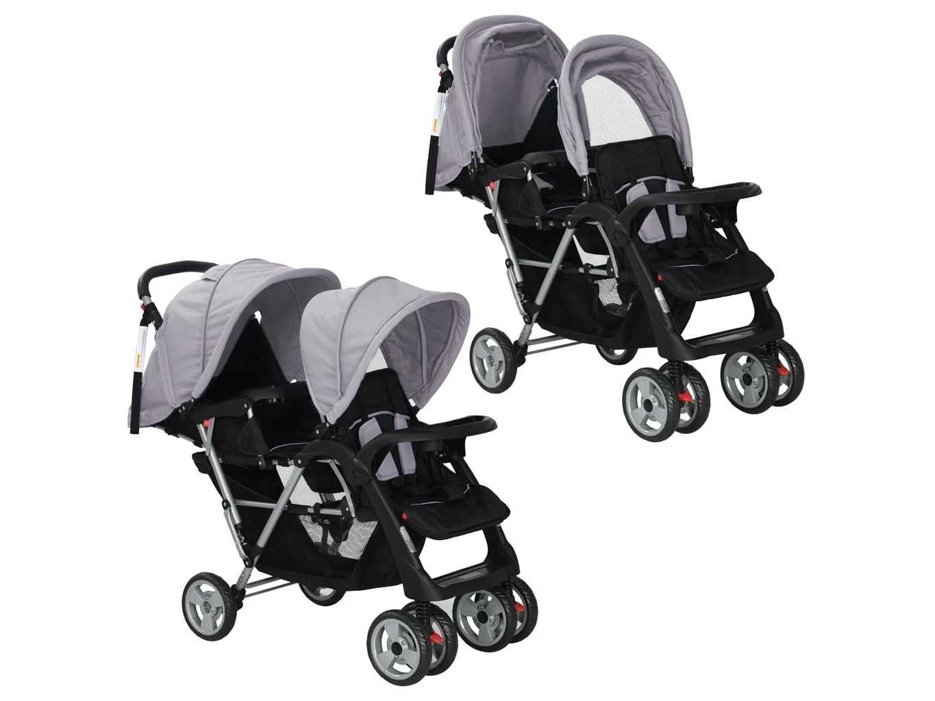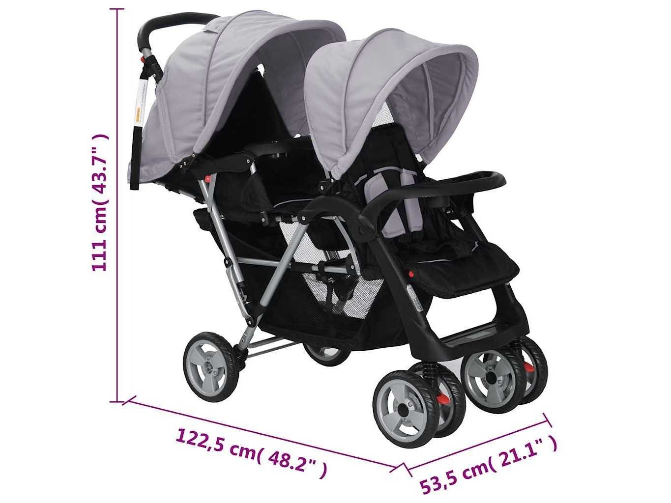 Kenmerken Kleur: grijs en zwart Materiaal: Staal + oxford stof Afmetingen: 122,5 x 53,5 x 111 cm (L x B x H) Opvouwbaar ontwerp Voor en achter met luifels Grote mand 360 graden vergrendeling en roterende wielen Geschikt voor 1-2 kinderen, met een maximaal gewicht van 15 kg per stuk Aanbevolen leeftijd: 6-36 maanden Waarschuwing: dit product is niet geschikt om mee te joggen of te skaten Materiaal: Polyester: 100% Non