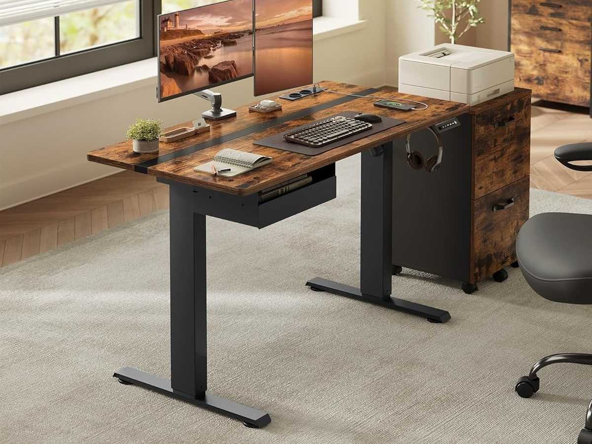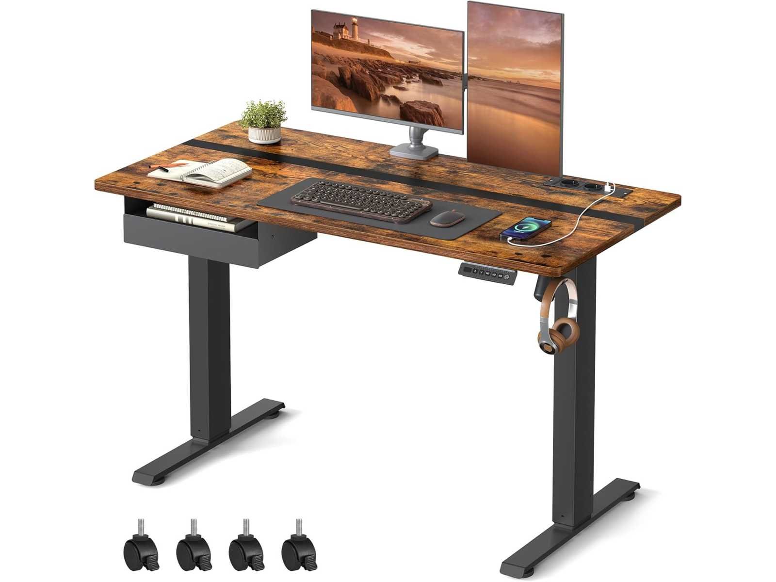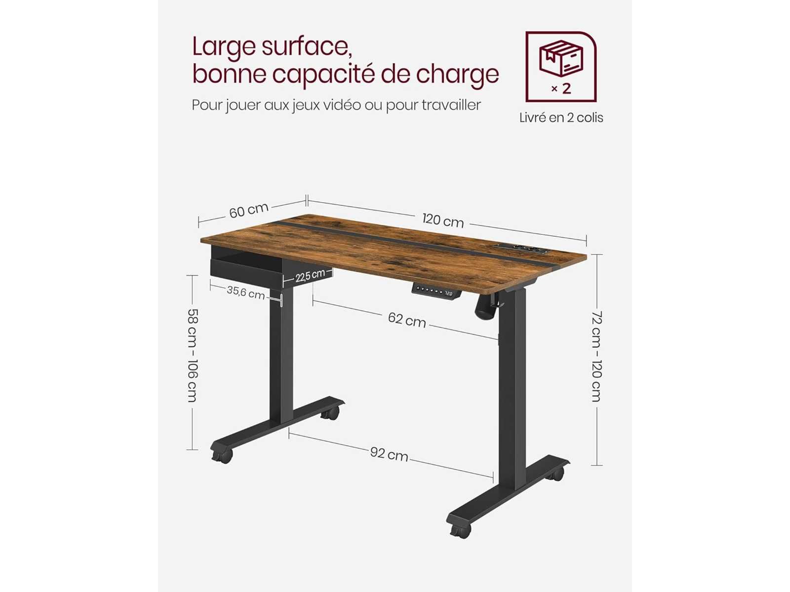 Kenmerken: Kleuren: Rustiek bruin, zwart Materialen: spaanplaat, staal Afmetingen: 60 x 120 x (72-120) cm (D x B x H) Dikte tafelblad: 1,5 cm Geluid: 50 dB Instelsnelheid: 25 mm/s Gewicht: 29,2 kg Maximaal statisch draagvermogen: 80 kg Non Lengte: 120cm Breedte: 60cm Hoogte: 72-120cm