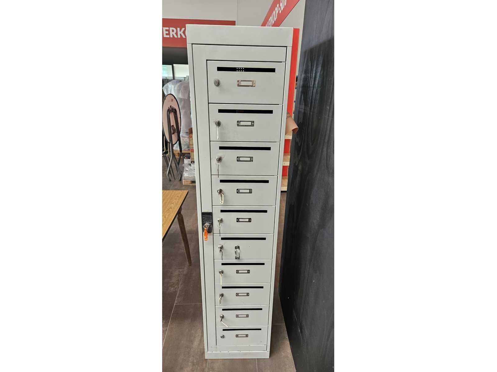 10 opbergvakken met sleutel. Nee Lengte: 40cm Breedte: 50cm Hoogte: 180cm