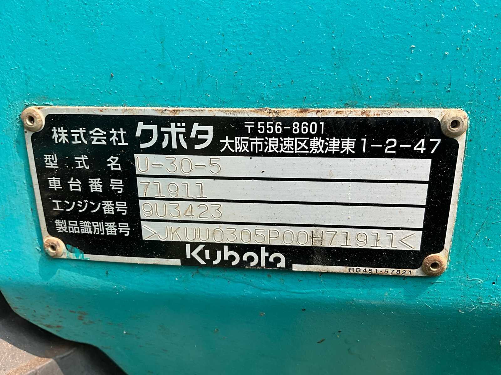 Chassisnummer: JKUU0305P00H71911 Voorzien van: duwblad breedte duwblad: 1540 mm Nee Merk: Kubota Type: U-30-5 Serienummer: 71911 Merk motor: Kubota Motorvermogen (kW): 20kW Brandstof: Diesel Gieklengte: 335mm Met graafbak: true Graafbak afm. l: 600mm Graafbak afm. b: 420mm Graafbak afm. h: 450mm Rups breedte: 300mm Afgelezen urenstand: 186 Totale afmeting L: 4500mm Totale afmeting Breedte: 1550mm Totale afmeting Hoogte: 2300mm