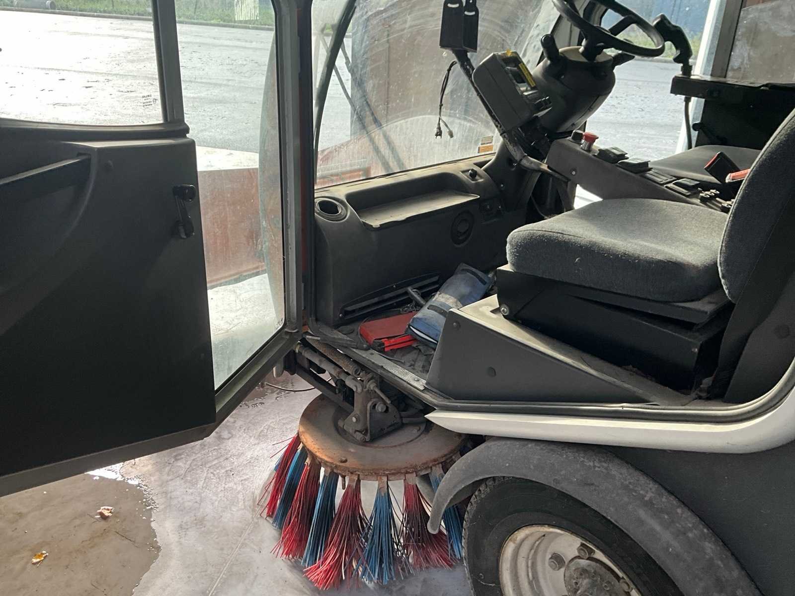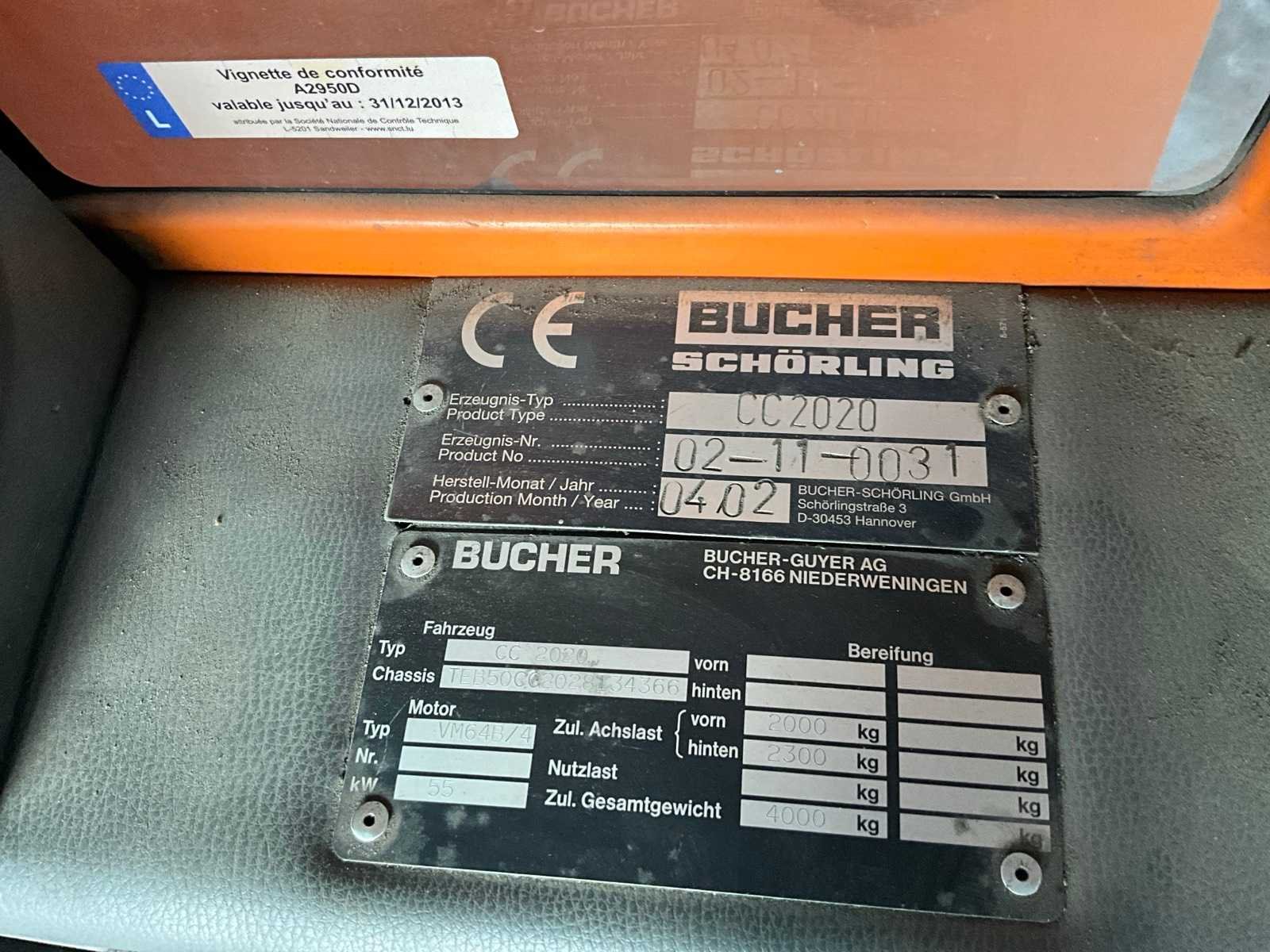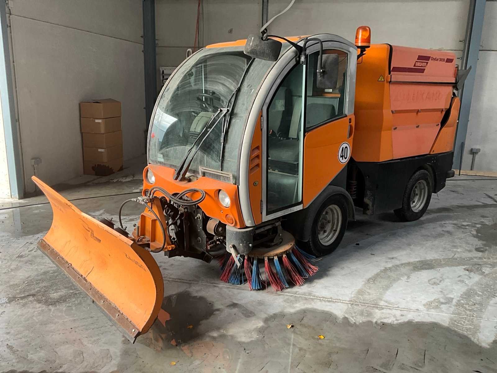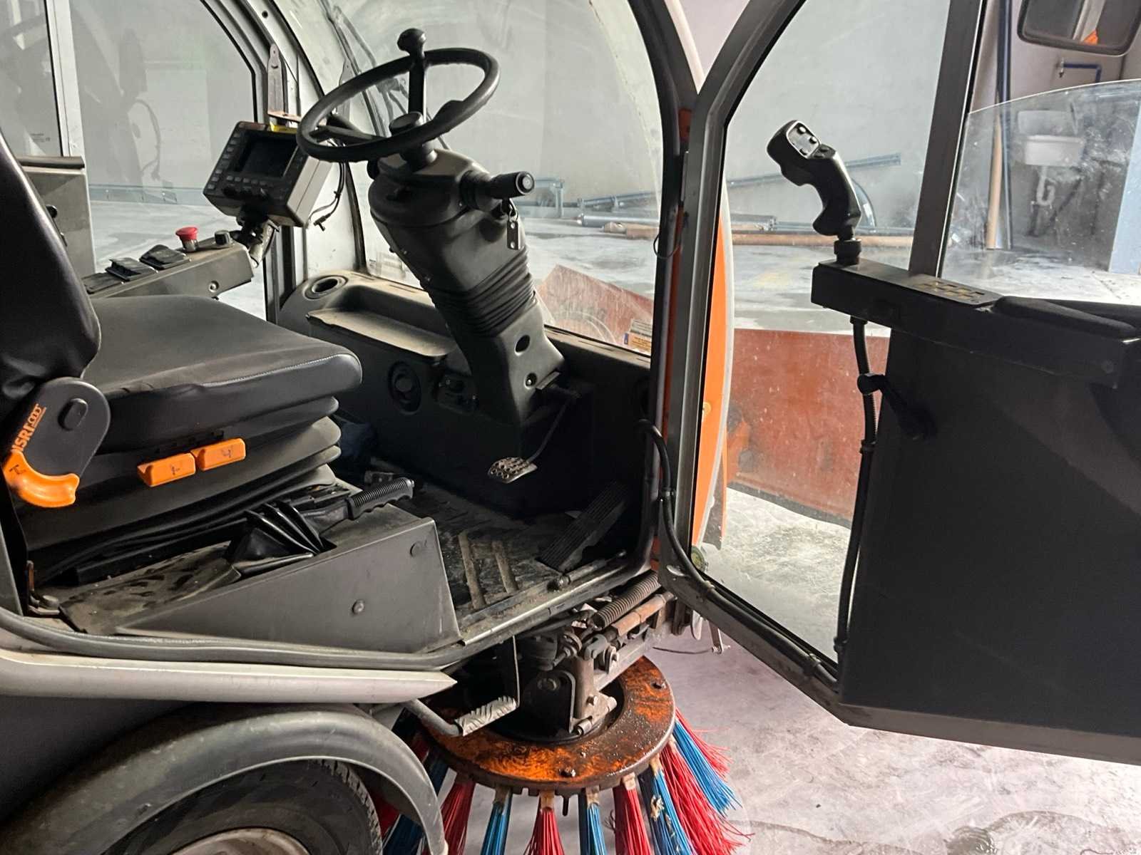Professionele compacte straatveegmachine van Bucher Schörling, type CityCat 2020, voorzien van dubbele borstels, zuigsysteem, watertank en Zaugg sneeuwploeg (type G3-160-2, bouwjaar 2003). Machine geschikt voor zowel zomer- als winterdienst – ideaal voor gemeentelijk, industrieel of terreinonderhoud - Veegsysteem: 2 zijborstels met verstelbare armen, Centrale zuigmond, Waternevelsysteem tegen stofvorming - Cabine: Gesloten cabine met verwarming, panoramisch zicht, bedieningspaneel en comfortstoel - Extra’s: Zwaailicht, Spiegelset, Werkverlichting, Compacte draaicirkel - werkt (zie video) Nee Merk: Bucher Type: CityCat 2020 Bouwjaar: 2002 Brandstofmotor aangedreven: true Eigen gewicht: 3000kg Inhoud waterreservoir: 300l Totale afmeting L: 3800mm Totale afmeting Breedte: 1300mm Totale afmeting Hoogte: 2000mm