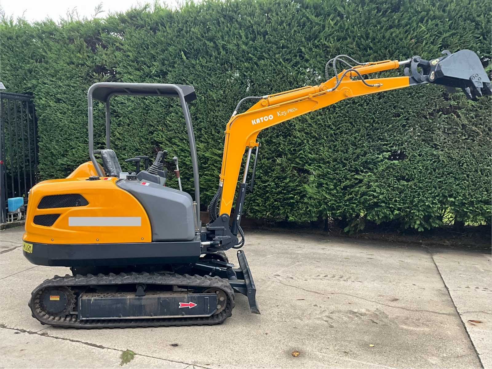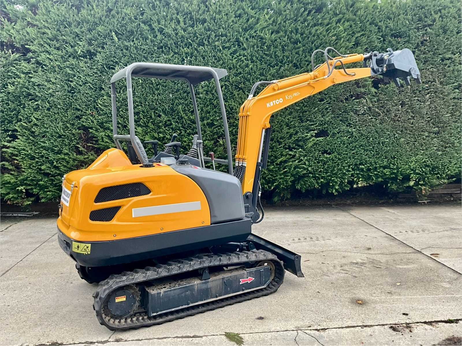 Nieuwstaat rupsgraafmachine van 2.456 kg met dieselmotor (18,8 kW / 25 pk). Slechts 47 bedrijfsuren. Uitgerust met CE-keuring, joystickbediening, hydraulisch dozerblad en graafbak met tanden. Enige kleine lakbeschadiging aan de achterzijde, verder als nieuw. Direct inzetbaar voor tuinaanleg, grondwerken of verhuur. - Uitrusting: Dubbele joystickbediening Hydraulische hulpfunctie (voor grijper/hamer) Verstelbaar dozerblad Opmerking: lichte lakschade achteraan (zie foto) CE-certificaat 12V stopcontact Graafbak met tanden inbegrepen Sleutel en handleiding aanwezig - Staat: Conditie: ongebruikt, enkel testuren (47 u) Lak: in nieuwstaat met kleine lakbeschadiging achteraan (zie foto) Rupsen: in nieuwstaat Hydrauliek: droog en lekvrij bij visuele inspectie Zitje: nog in originele beschermfolie No Merk: Katco Type: K35 Pro + Bouwjaar: 2024 Serienummer: JH23A124 Motorvermogen (kW): 18.8kW Brandstof: diesel Bedrijfsgewicht: 2456kg Inclusief graafbak: ja Graafbak afm. b: 350mm Afgelezen urenstand: 47 Eigen gewicht: 2456kg