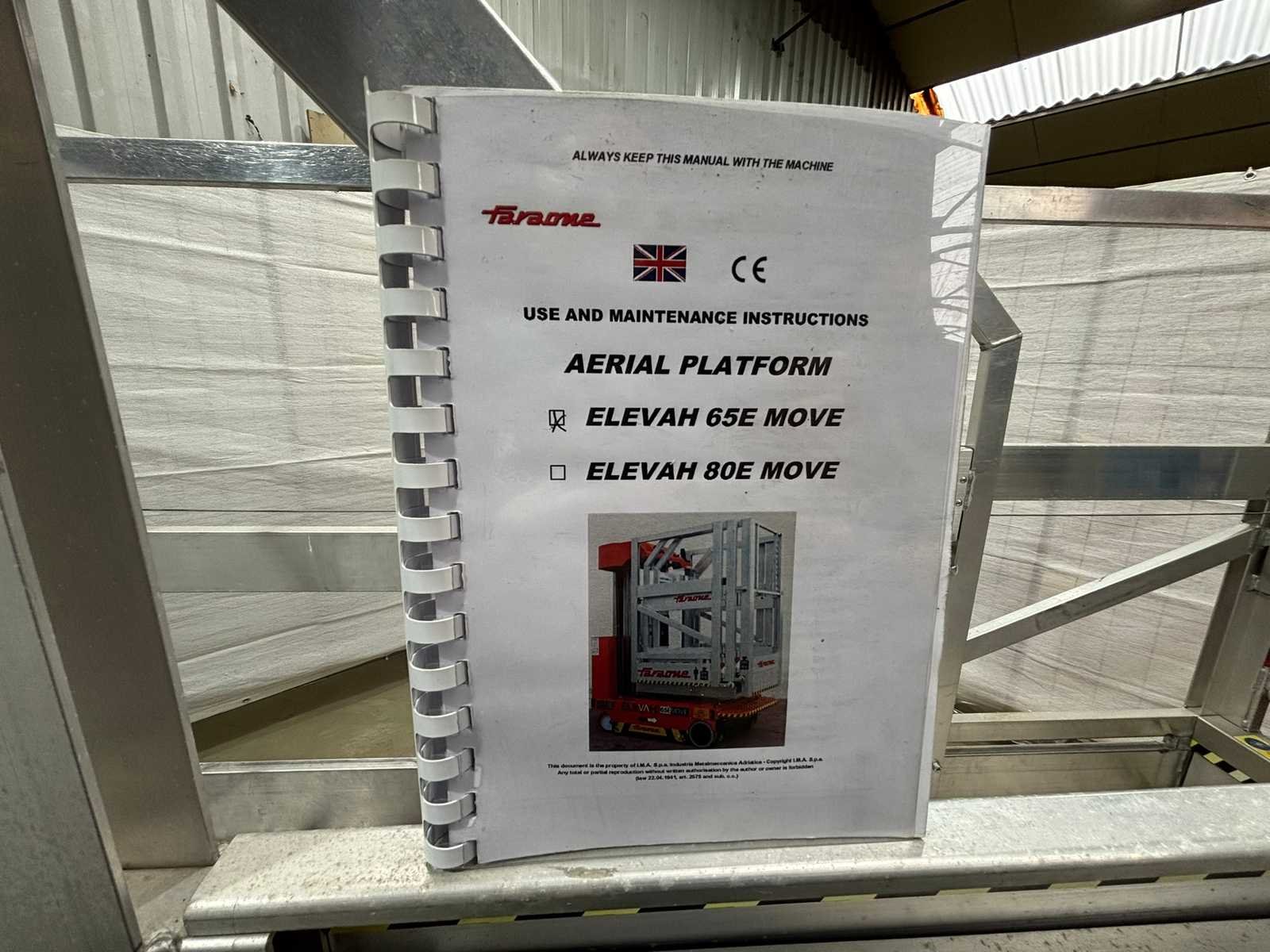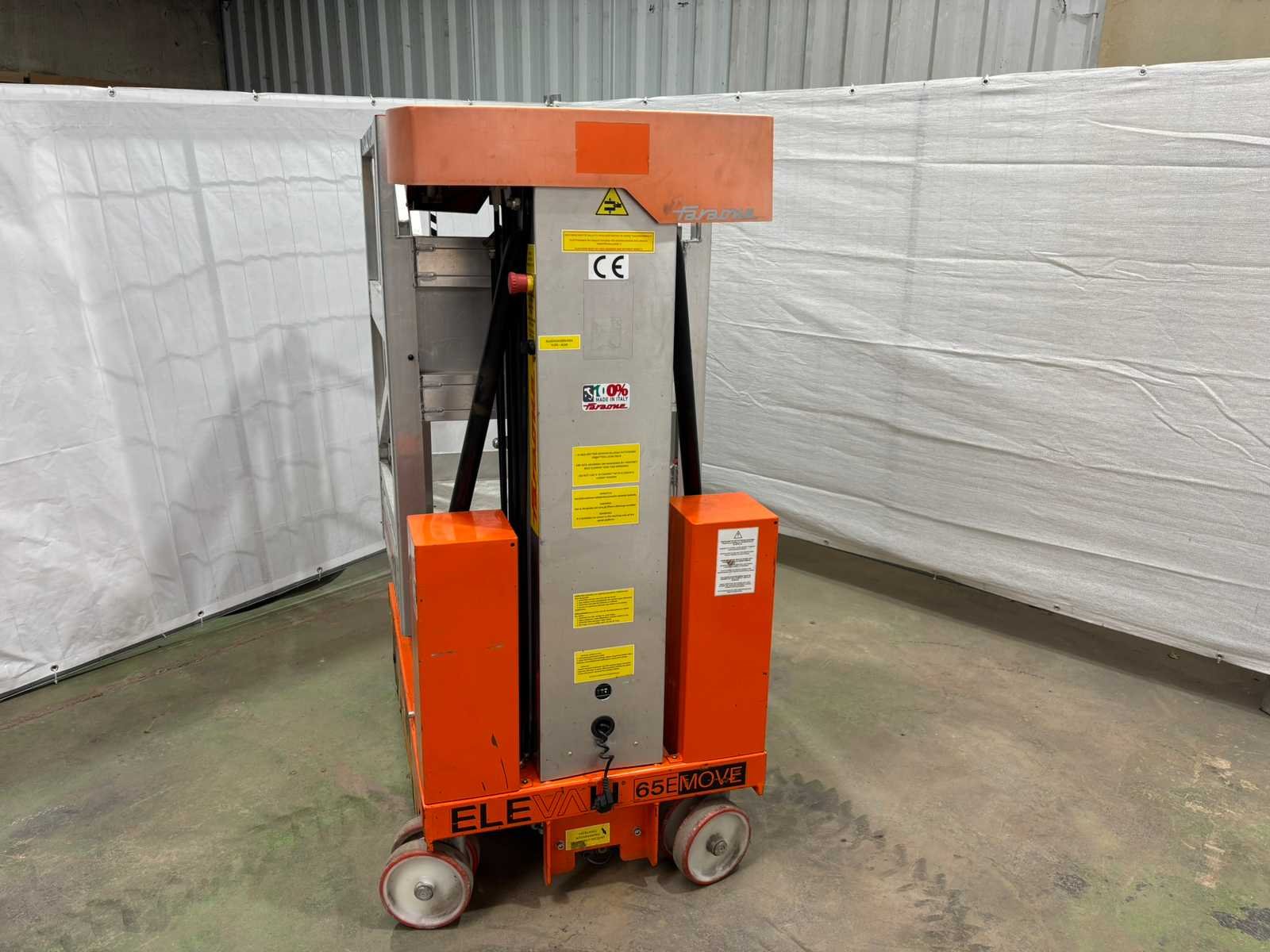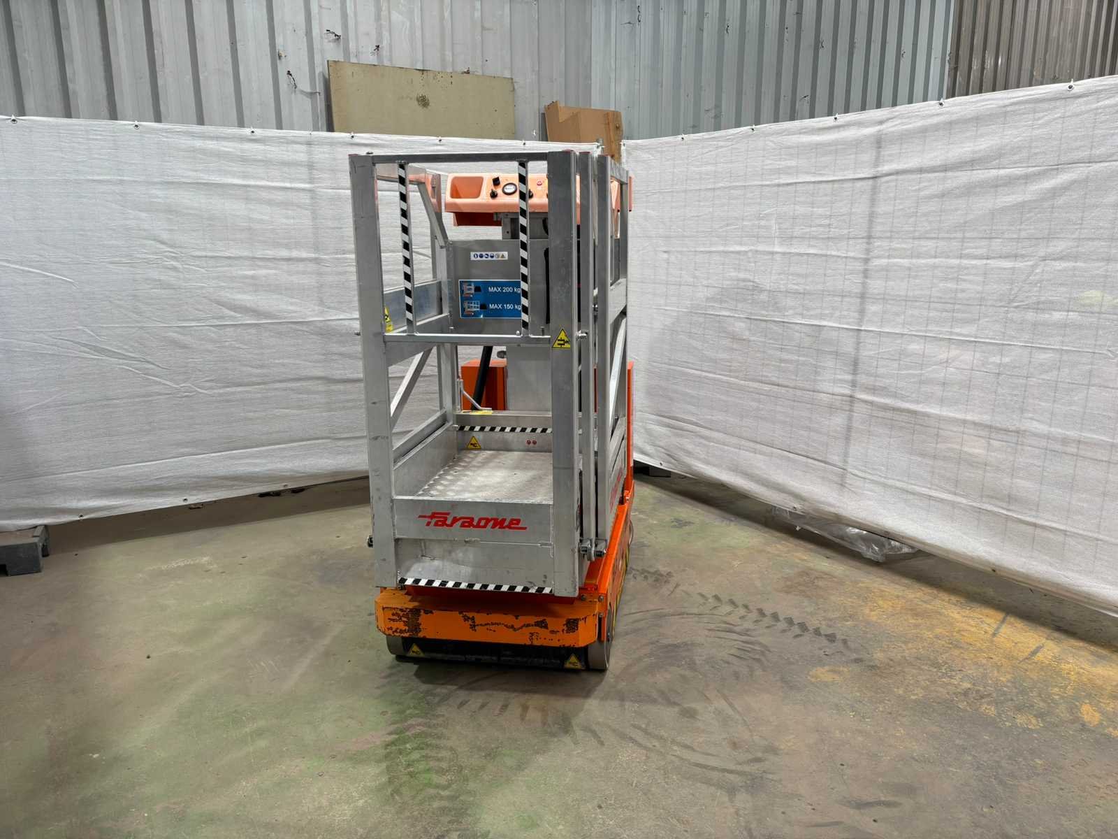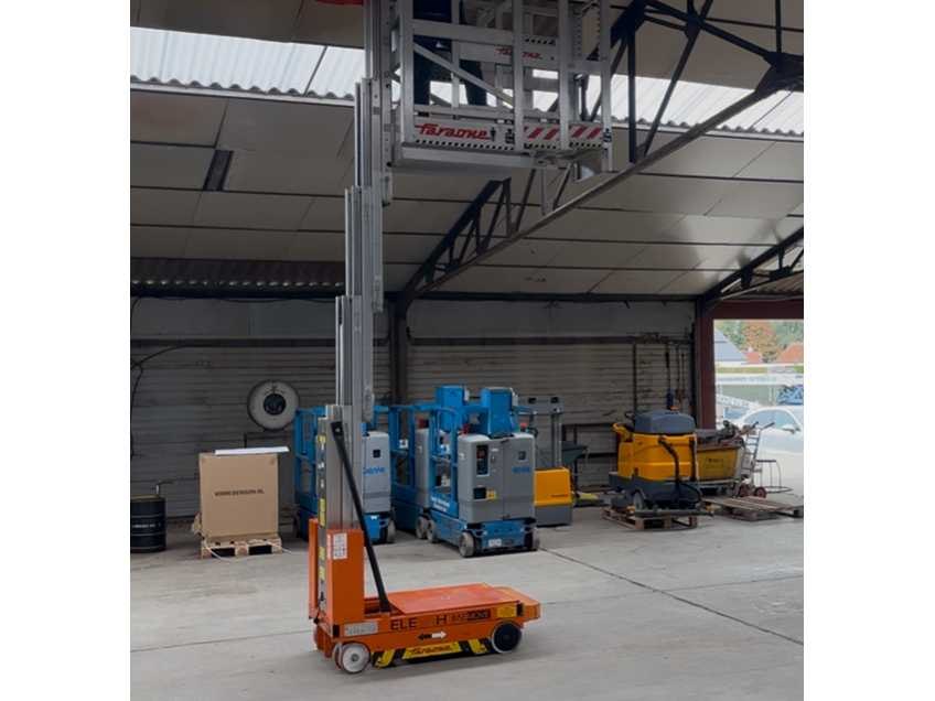 Merk Faraone Type. Elevah-65 Emove Maximale werkhoogte: Ongeveer 6,5 m. Draaglast: 200 kg (één persoon). Afmetingen: Compact, met een breedte van ongeveer 78 cm en lengte van 128 cm. Wendbaarheid: Zeer wendbaar door de nul draaicirkel en joystickbesturing, waardoor hij gemakkelijk door smalle ruimtes kan manoeuvreren. Aandrijving: Elektrisch, opgeladen via een oplaadbare batterij. Nee Merk: Faraone Type: Elevah 65 move Bouwjaar: 2014 Serienummer: 608/3821 Elektrisch: true Masthoogwerker: true Werkhoogte: 6500mm Plateau afm. l: 1200mm Plateau afm. b: 780mm Platform capaciteit: 200kg Accu lader: true Afgelezen urenstand: 86 Eigen gewicht: 800kg Totale afmeting L: 1510mm Totale afmeting Breedte: 780mm Totale afmeting Hoogte: 1720mm Leveringsvoorwaarden: Ophalen in 2580 putte