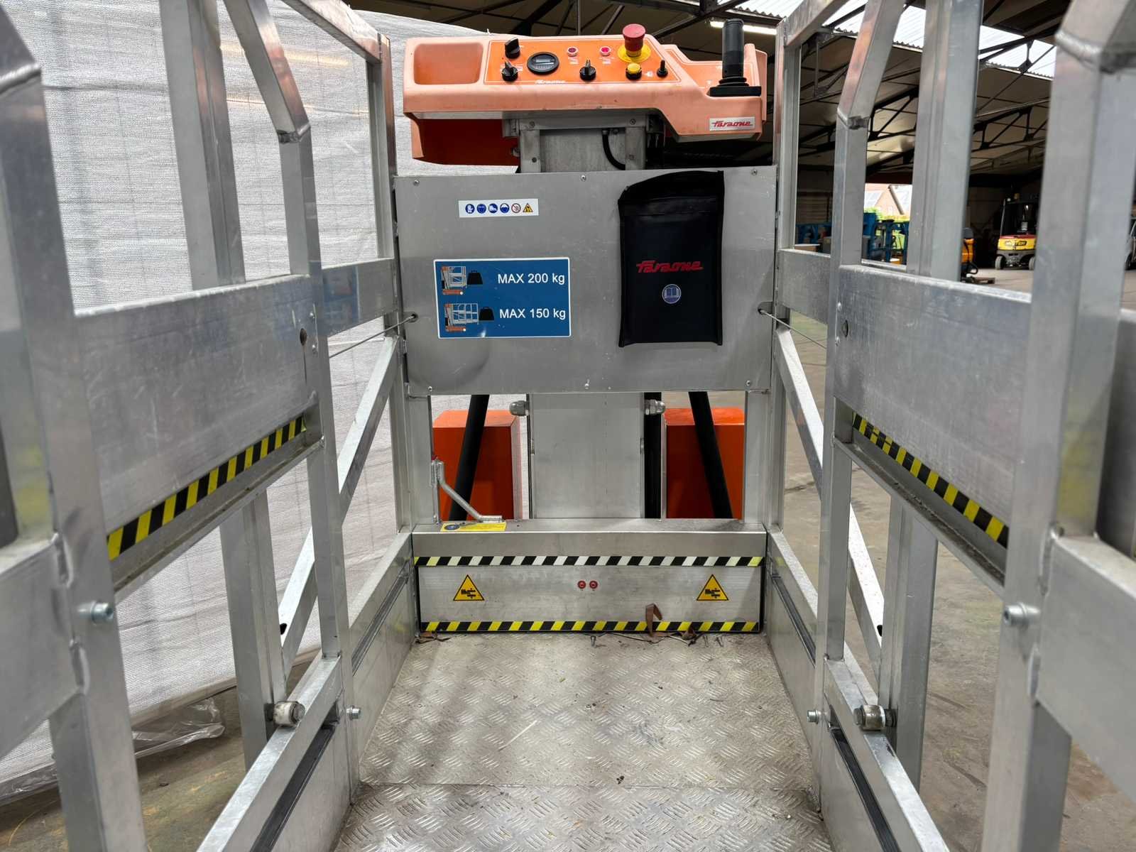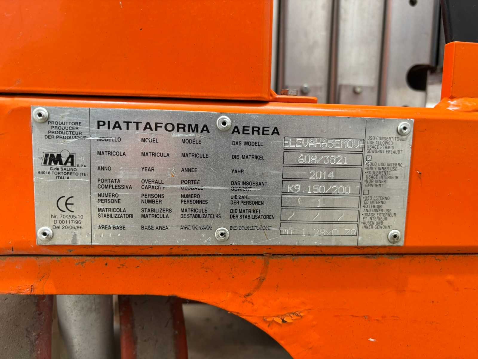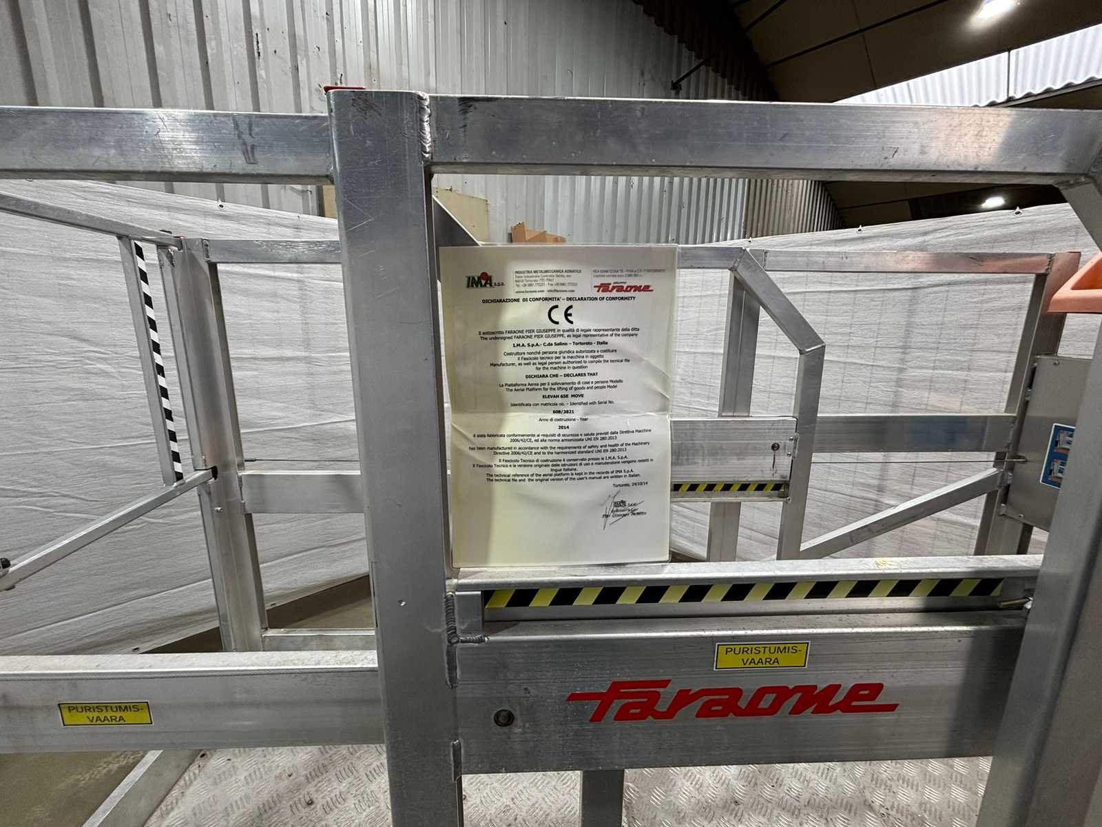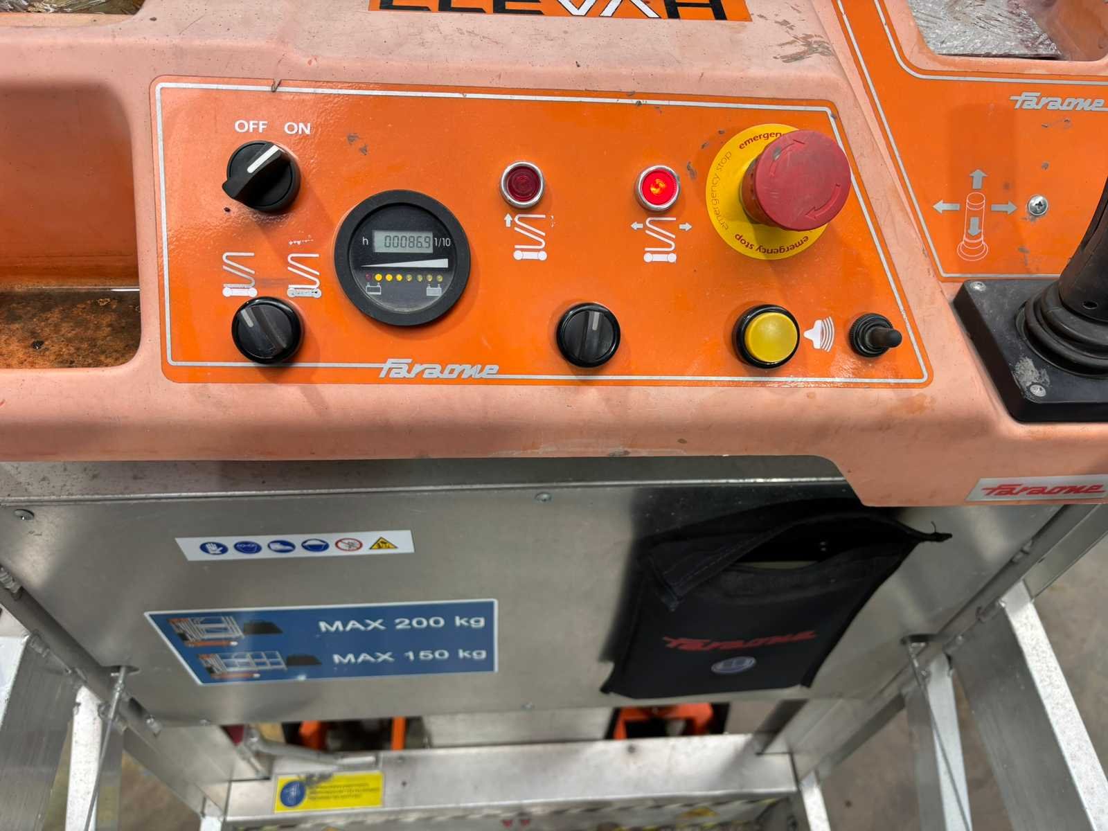 Merk Faraone Type. Elevah-65 Emove Maximale werkhoogte: Ongeveer 6,5 m. Draaglast: 200 kg (één persoon). Afmetingen: Compact, met een breedte van ongeveer 78 cm en lengte van 128 cm. Wendbaarheid: Zeer wendbaar door de nul draaicirkel en joystickbesturing, waardoor hij gemakkelijk door smalle ruimtes kan manoeuvreren. Aandrijving: Elektrisch, opgeladen via een oplaadbare batterij. Nee Merk: Faraone Type: Elevah 65 move Bouwjaar: 2014 Serienummer: 608/3821 Elektrisch: true Masthoogwerker: true Werkhoogte: 6500mm Plateau afm. l: 1200mm Plateau afm. b: 780mm Platform capaciteit: 200kg Accu lader: true Afgelezen urenstand: 86 Eigen gewicht: 800kg Totale afmeting L: 1510mm Totale afmeting Breedte: 780mm Totale afmeting Hoogte: 1720mm Leveringsvoorwaarden: Ophalen in 2580 putte