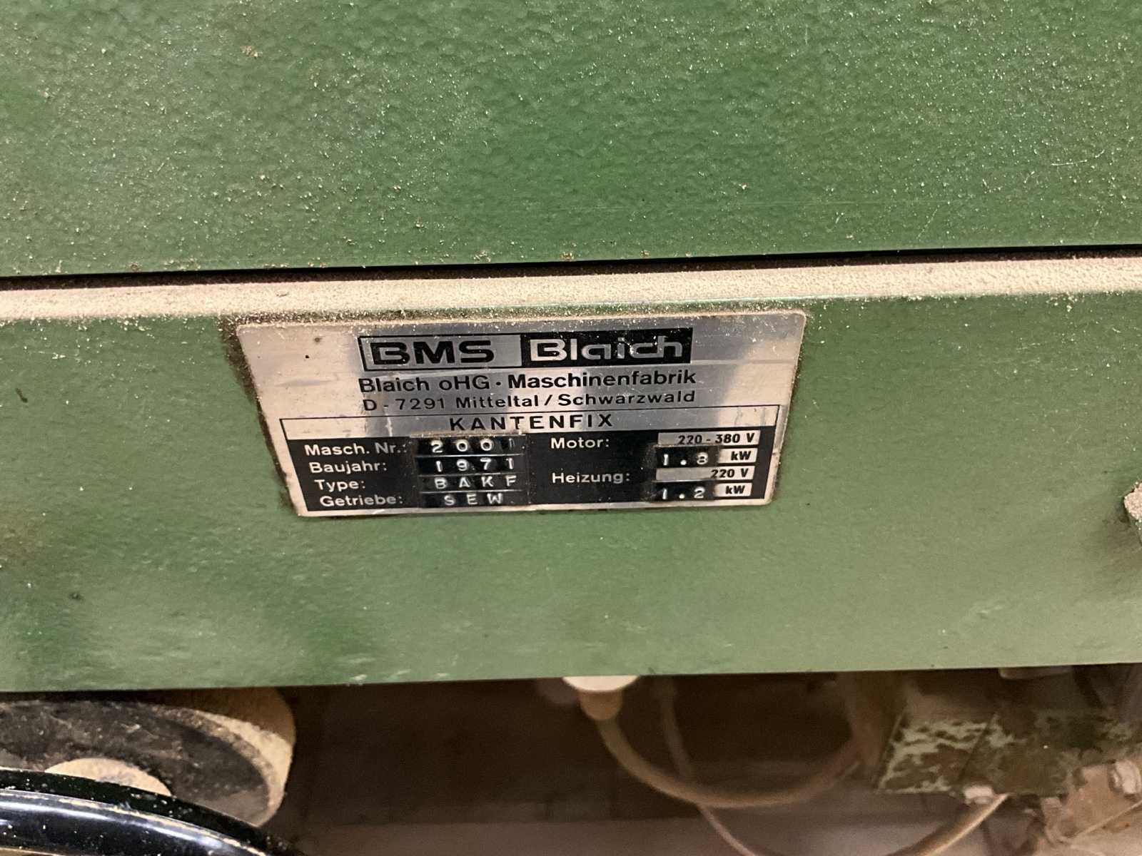 Rol waar de lijm op komt is te smal Merk: BMS Blaich OHG Maschinenfabrik Model: Kantenfix Type: BAKF Bouwjaar: 1971 Vermogen motor: 1,8 kW (3-fase, 220–380 V) Verwarming: 220 V – 1 à 2 kW Aandrijving: SEW tandwielmotor Voorzien van verwarmde lijmbak, drukrollen en toevoersysteem voor kantenband Solide stalen frame op wielen Volledig werkende mechanische bediening Oorspronkelijk gebruikt voor het lijmen van fineer- of PVC-banden op meubelpanelen Machine uit professioneel schrijnwerkersatelier ⸻ No Bouwjaar: 1971