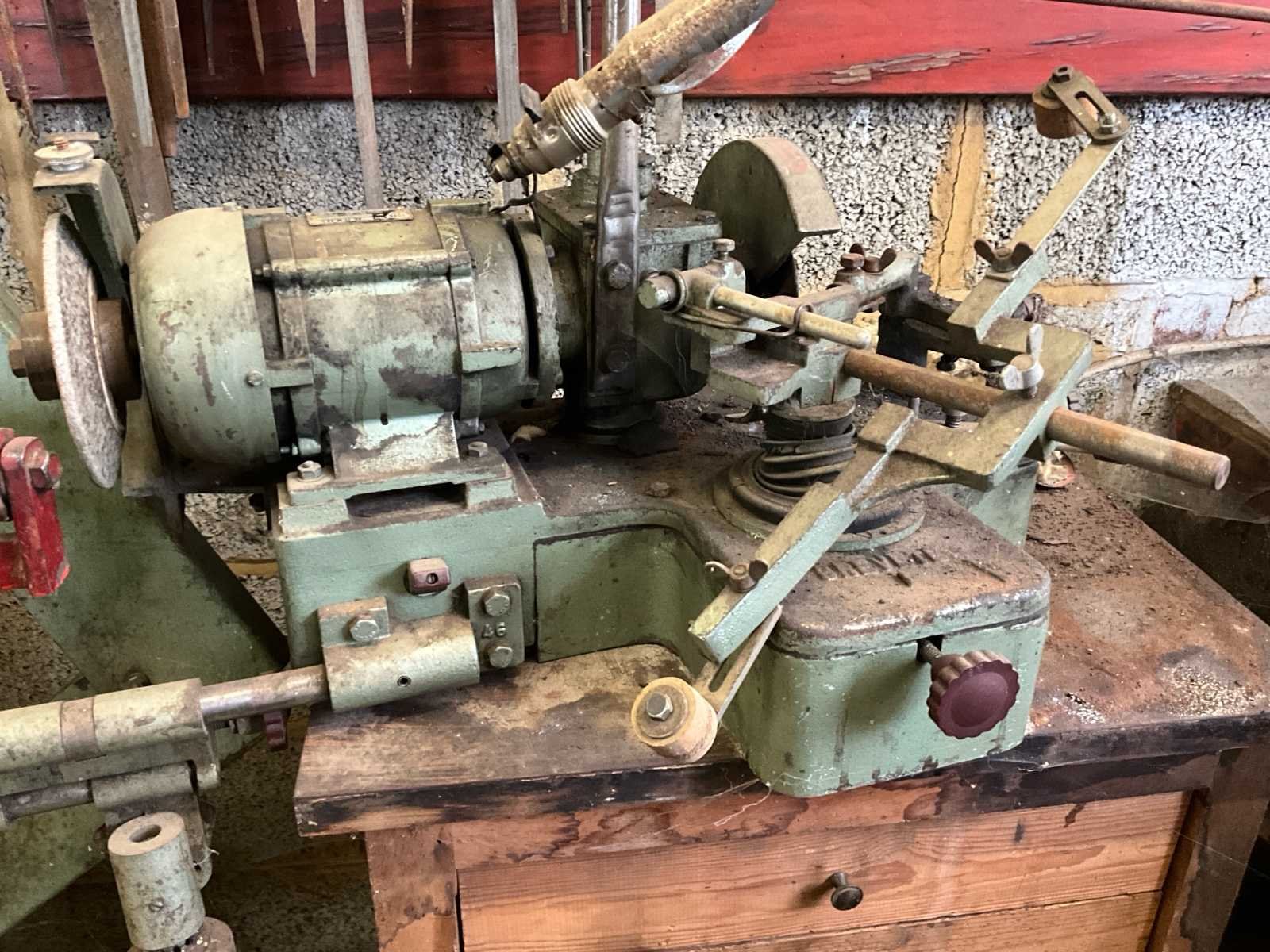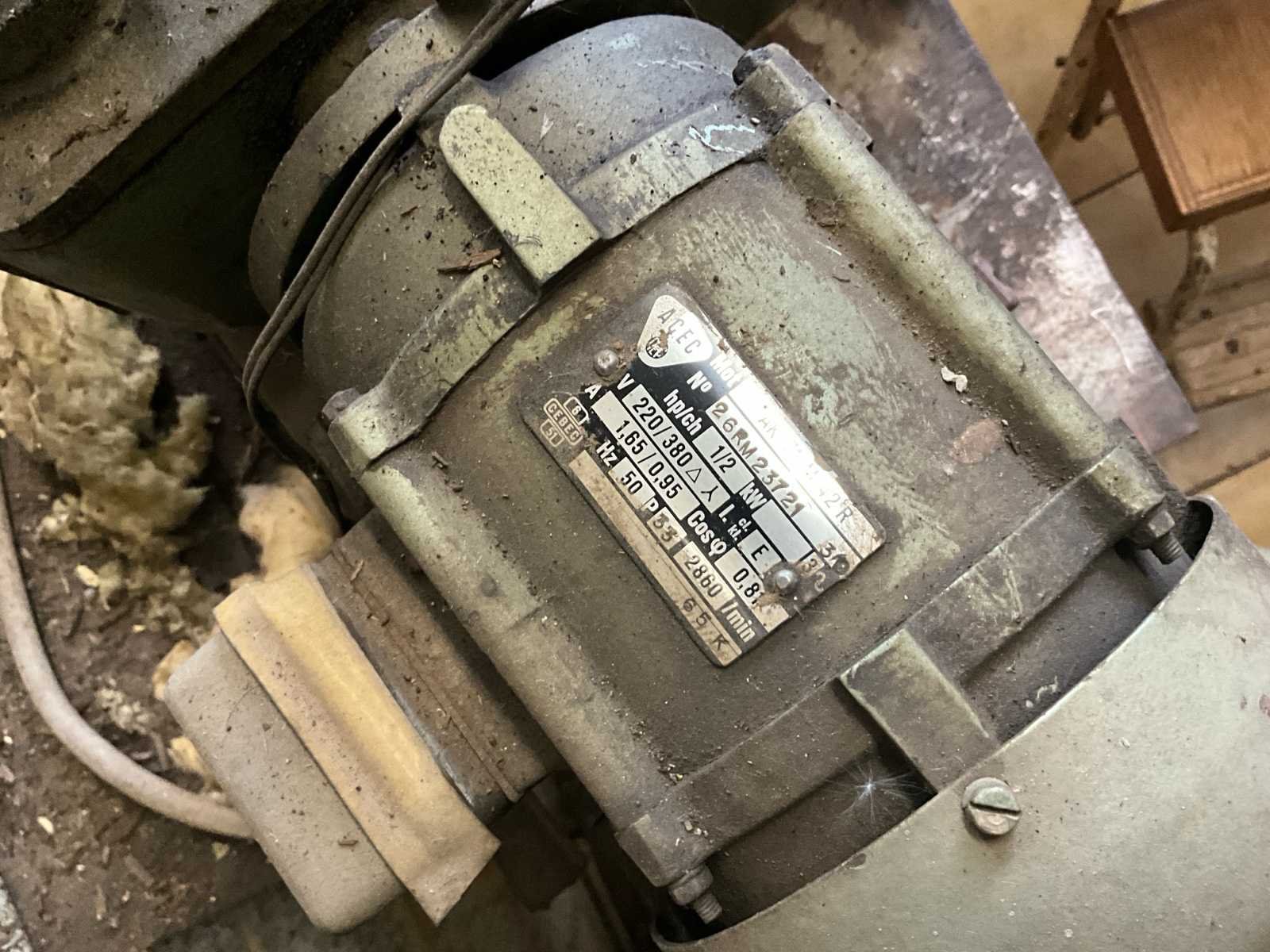 Merk: AEG Type: 2GM423Z Vermogen: 1,5 HP (1,1 kW) Spanning: 220 / 380 V Toerental: 2860 t/min Frequentie: 50 Hz Cos φ: 0,82 IP 44 – isolatieklasse E Bouwjaar: ca. 1970 Machine: industriële schaaf- en messenslijpmachine met handmatige geleiding en verstelbare slijpsteun Volledig metalen uitvoering, geschikt voor het slijpen van messen, schaafbeitels, en ander gereedschap Aangedreven door krachtige AEG elektromotor No
