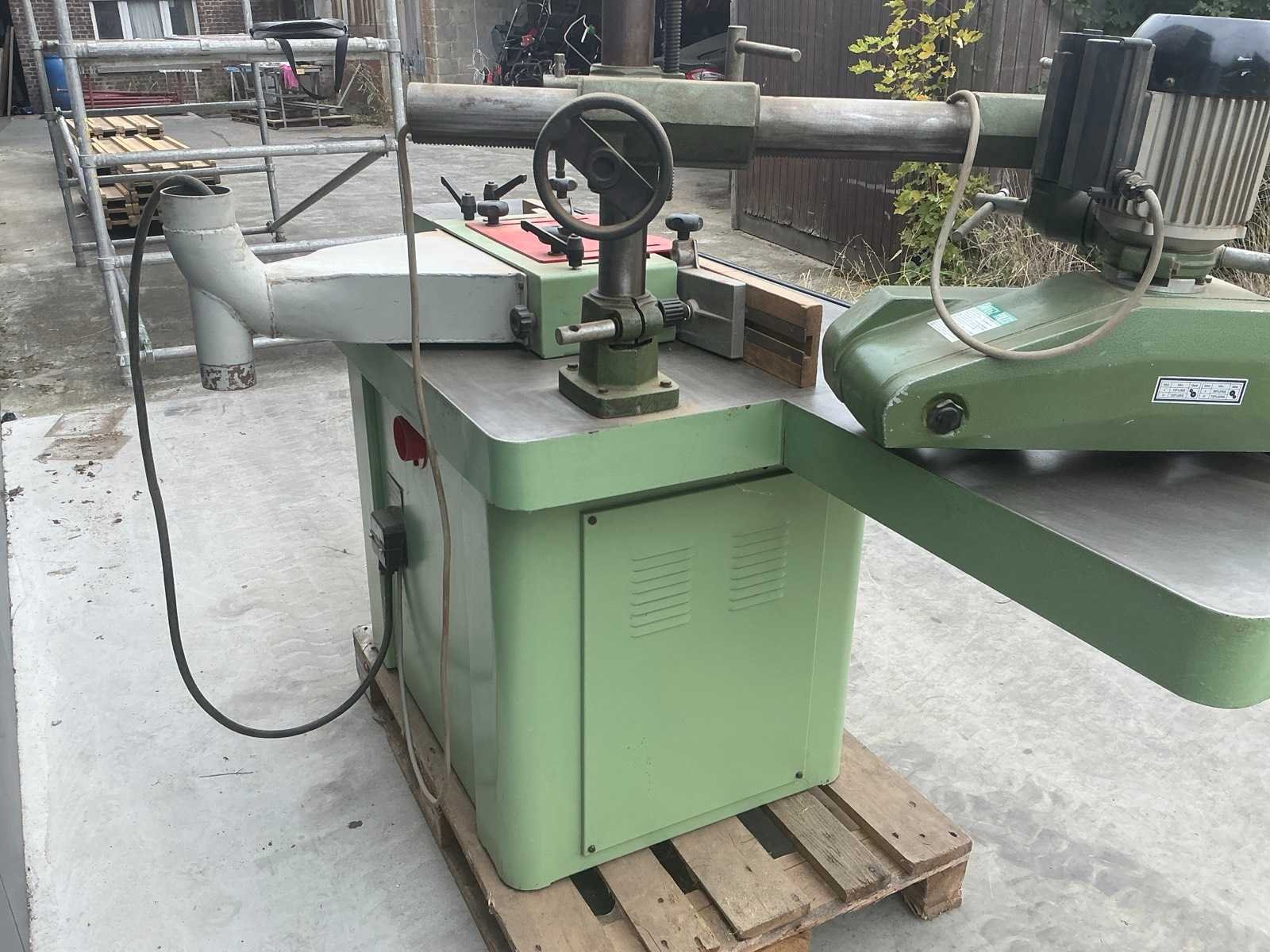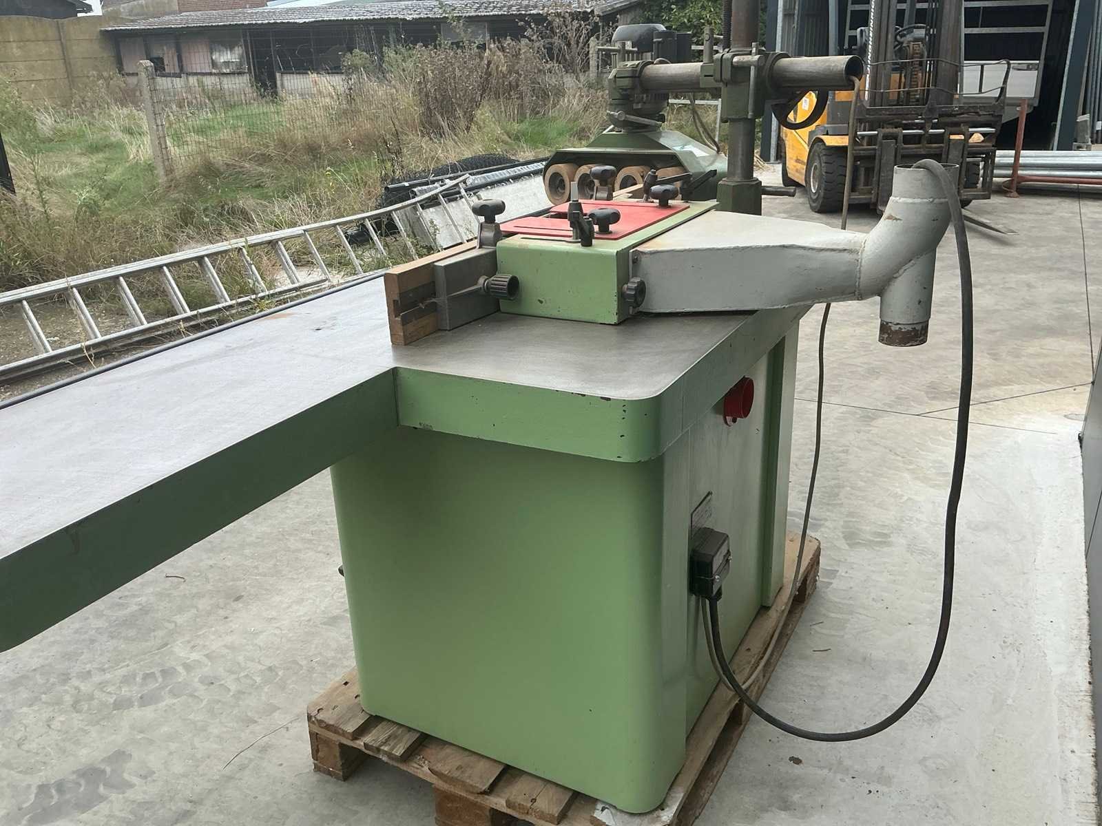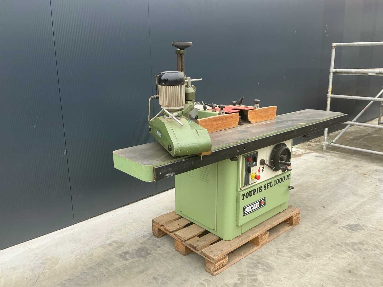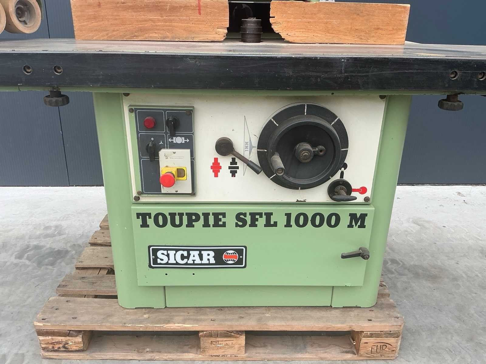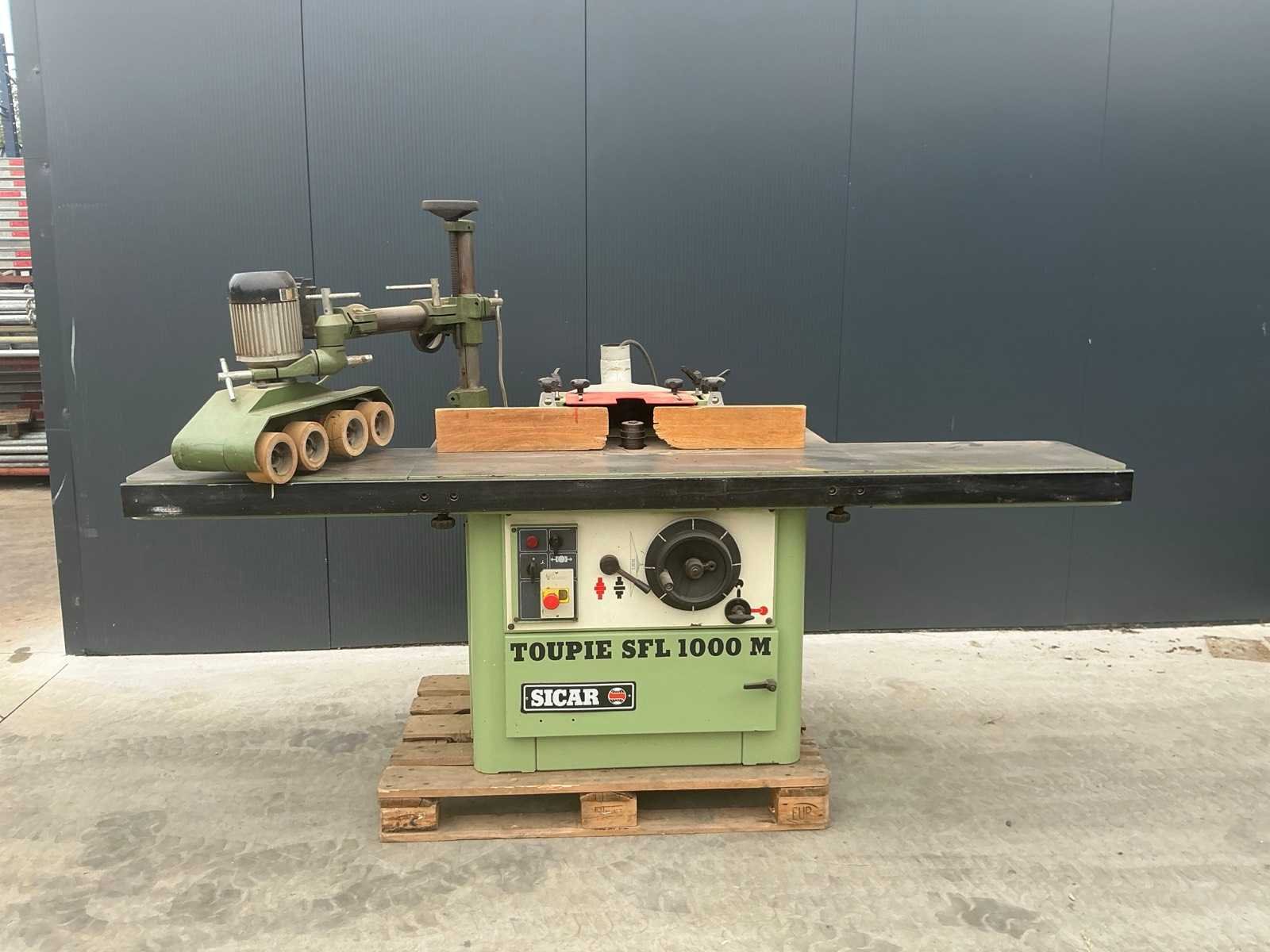 Sicar SLF 1000 M (ook wel spindelfreesmachine genoemd) is een machine waarbij een verticale as (spil) roteert met een frees- of profielkop. Hout wordt langs de spil geleid over een werktafel, waardoor het profiel of de vorm in het werkstuk wordt gefreesd. Lengte 2m50, breedte 90cm hoogte 1meter. Toupie as 50mm aanvoerapparaat met 4 rollen. 4 snelheden. Nee Merk: Sicar Type: SFL 1000 M Bouwjaar: 1991 Aansluiting: 380V Aantal snelheden: 4 Totale afmeting Breedte: 900mm Totale afmeting Hoogte: 1000mm Leveringsvoorwaarden: Heftruck aanwezig