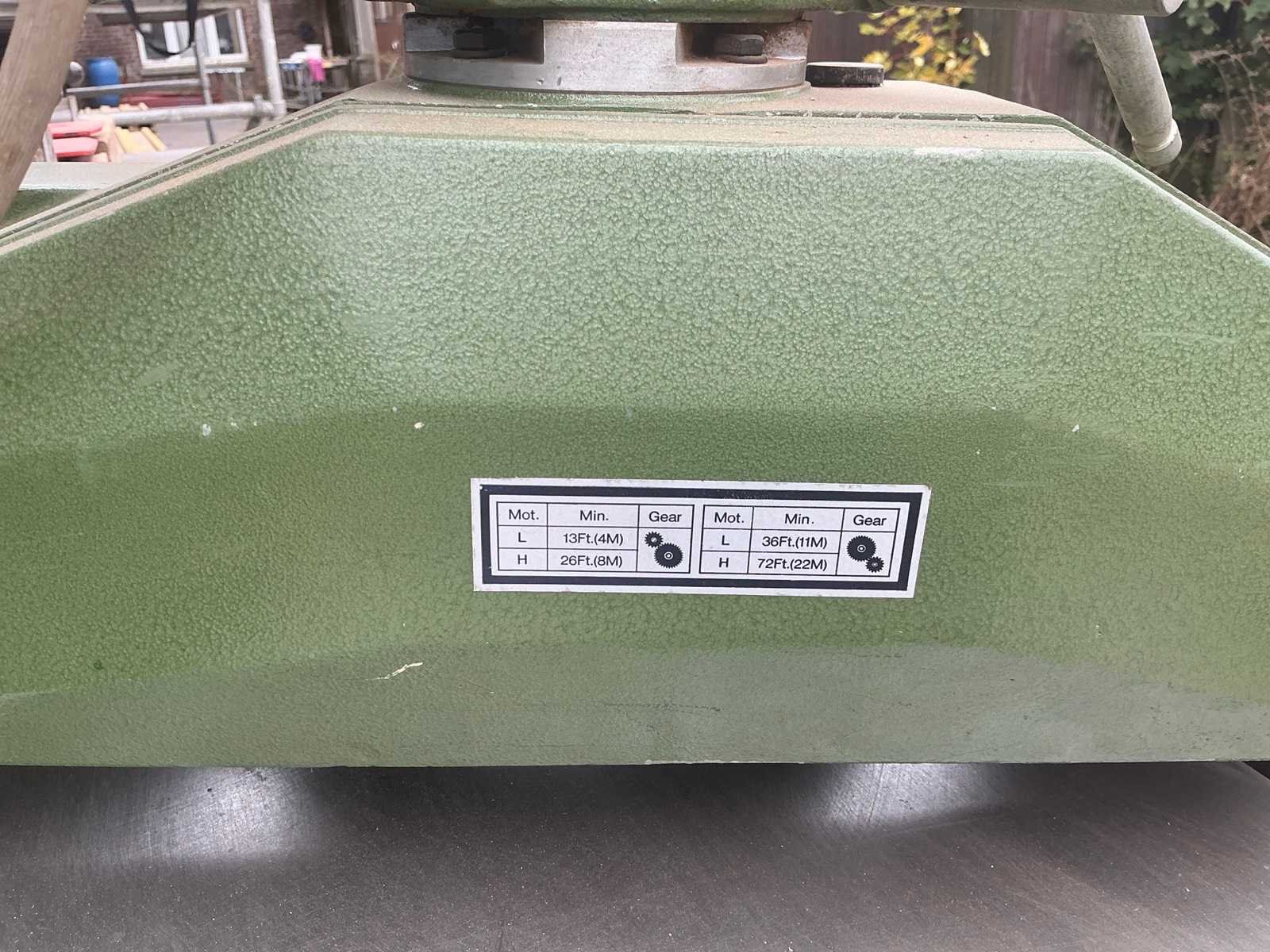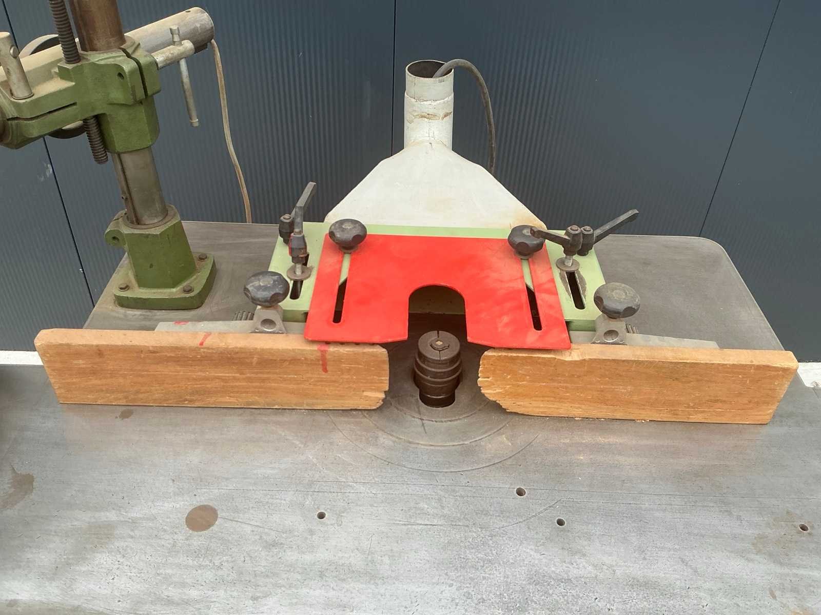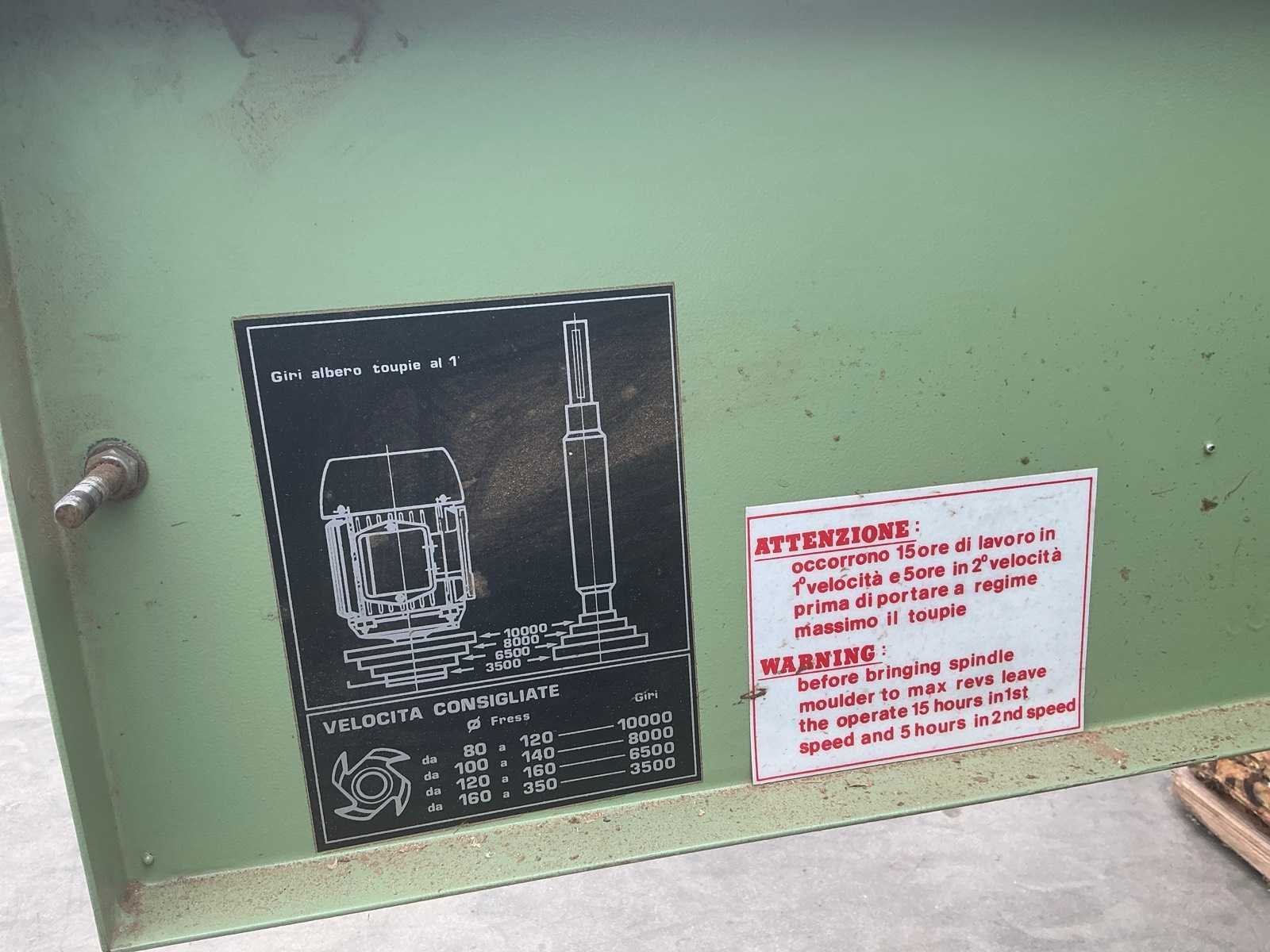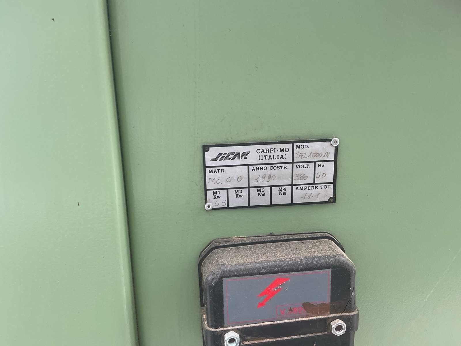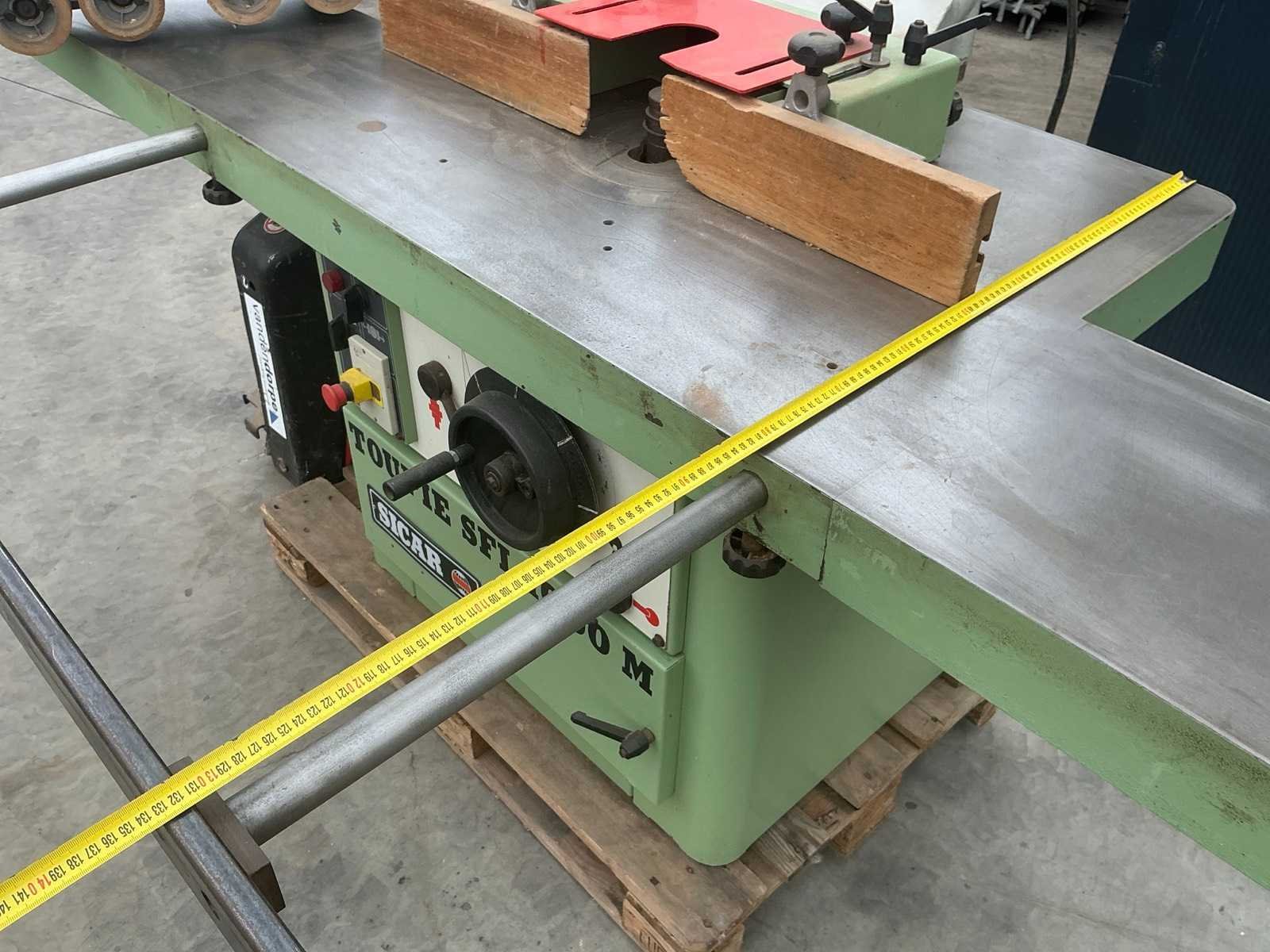 Sicar SLF 1000 M (ook wel spindelfreesmachine genoemd) is een machine waarbij een verticale as (spil) roteert met een frees- of profielkop. Hout wordt langs de spil geleid over een werktafel, waardoor het profiel of de vorm in het werkstuk wordt gefreesd. Lengte 2m50, breedte 90cm hoogte 1meter. Toupie as 50mm aanvoerapparaat met 4 rollen. 4 snelheden. Nee Merk: Sicar Type: SFL 1000 M Bouwjaar: 1991 Aansluiting: 380V Aantal snelheden: 4 Totale afmeting Breedte: 900mm Totale afmeting Hoogte: 1000mm Leveringsvoorwaarden: Heftruck aanwezig